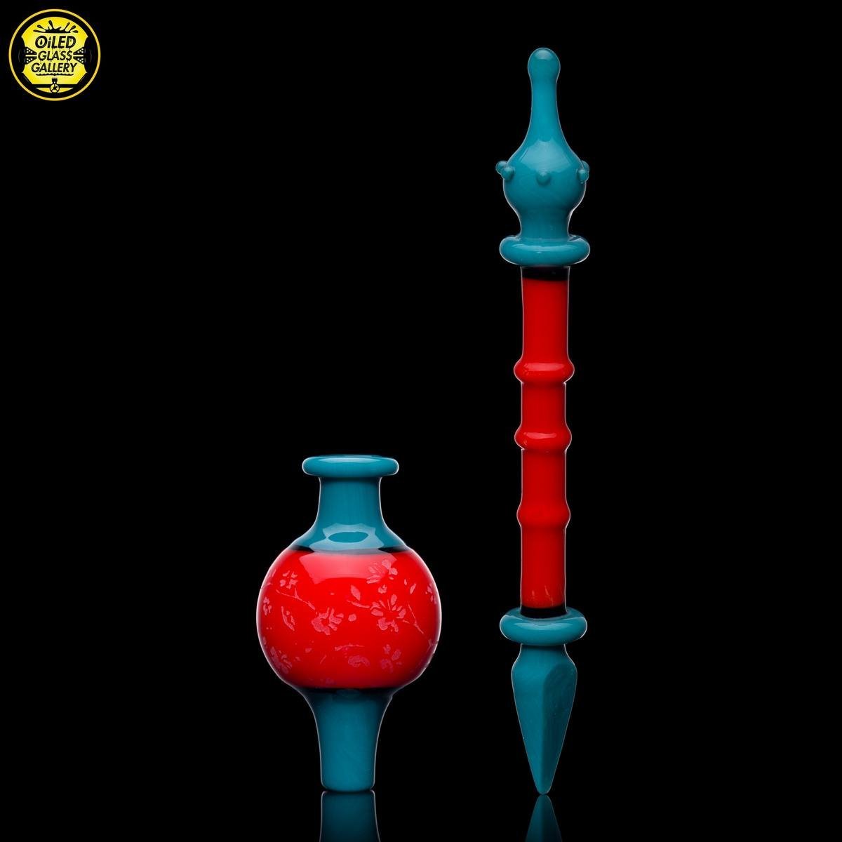2020 14mm 10.5in Cherry Blossom Geisha Banger Hanger Tube Set made of Northstar Glass Poppy, Molten Aura Lotus White, Glass Alchemy Agua Azul & Northstar Glass Galaxy Black. Features sandblasted flowers all over piece, comes with a matching dabber, a bubble cap, and is shipped in a Pelican case.