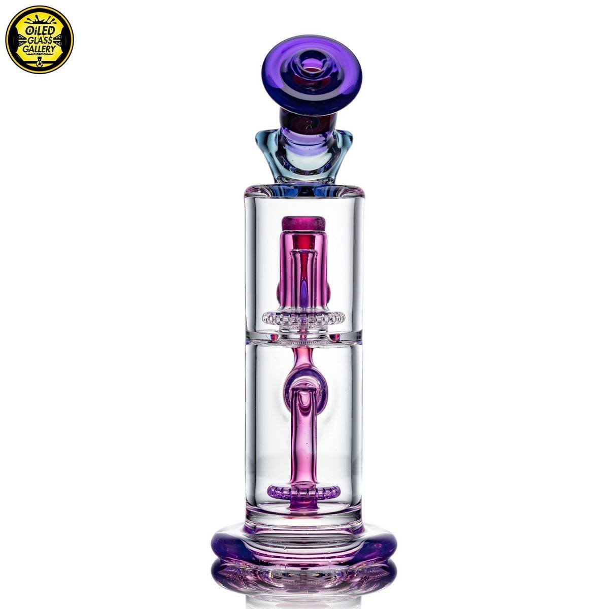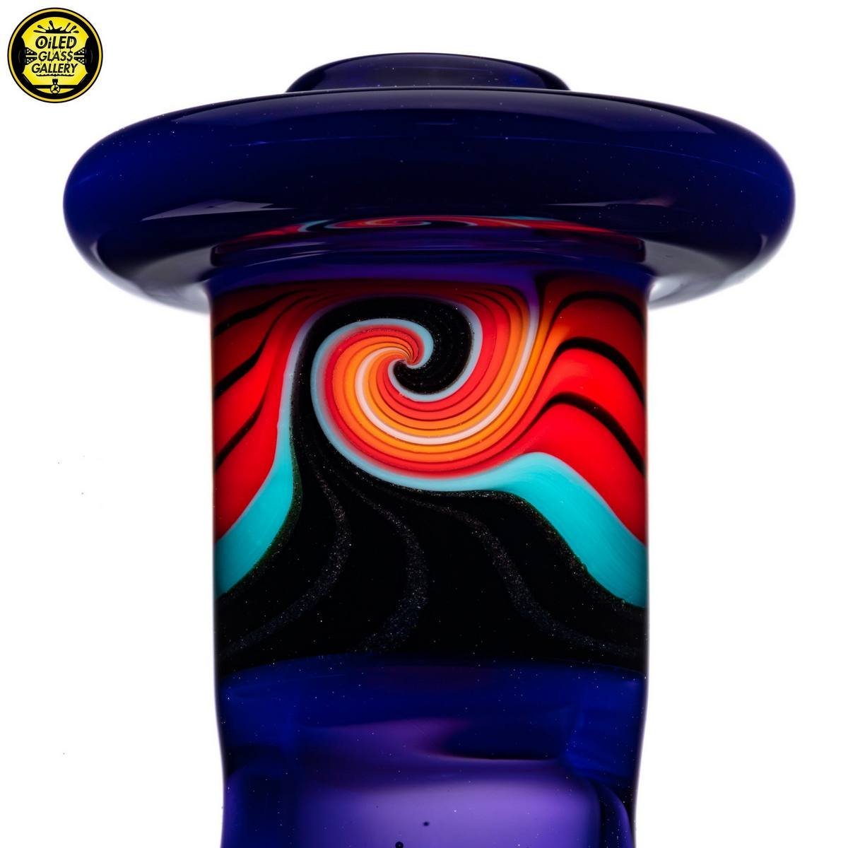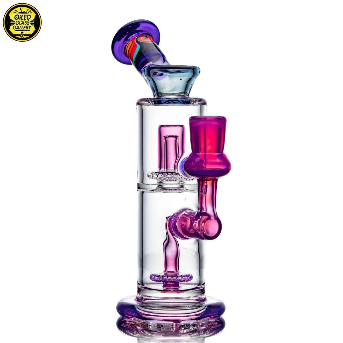 2021 14mm 7.5in CFL 45x5mm Double Chamber Banger Hanger Tube set made of Northstar Glass Star Gazer, Northstar Glass Empire, and Glass Alchemy CFL Potion featuring a micron circ to circ perc with kickback neck. This set comes with a matching slide and pendant.