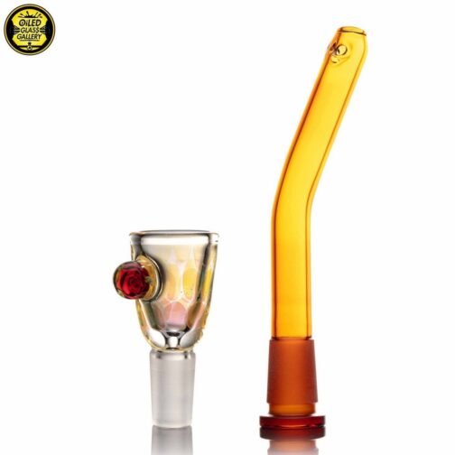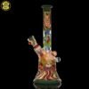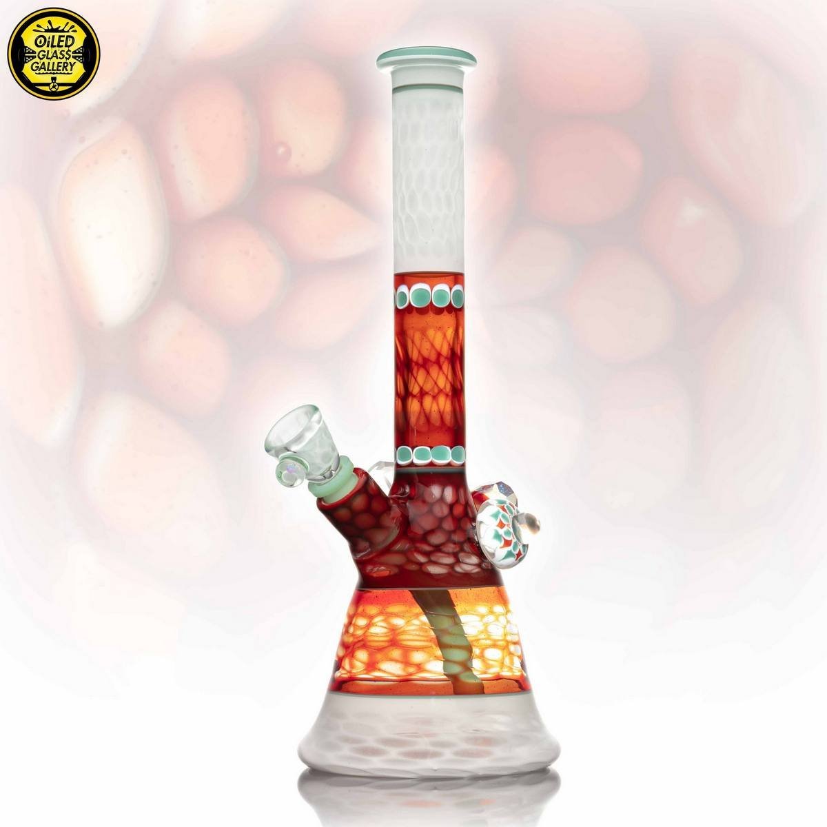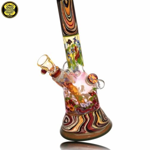 2023 14mm 12.5in Botanical Millefiori Beaker tube made of a Blue Caramel Frit tubing, wood grain tech, an inside out insect and flower millefiori scene, and gold and silver fuming sections. Features two millefiori encased mibs and a huge half sandblasted flower implosion mib attached to the sides. Comes with a matching removable 3-hole stem and 1-hole slide with rose millefiori mib, all shipped in an Apache hard case.