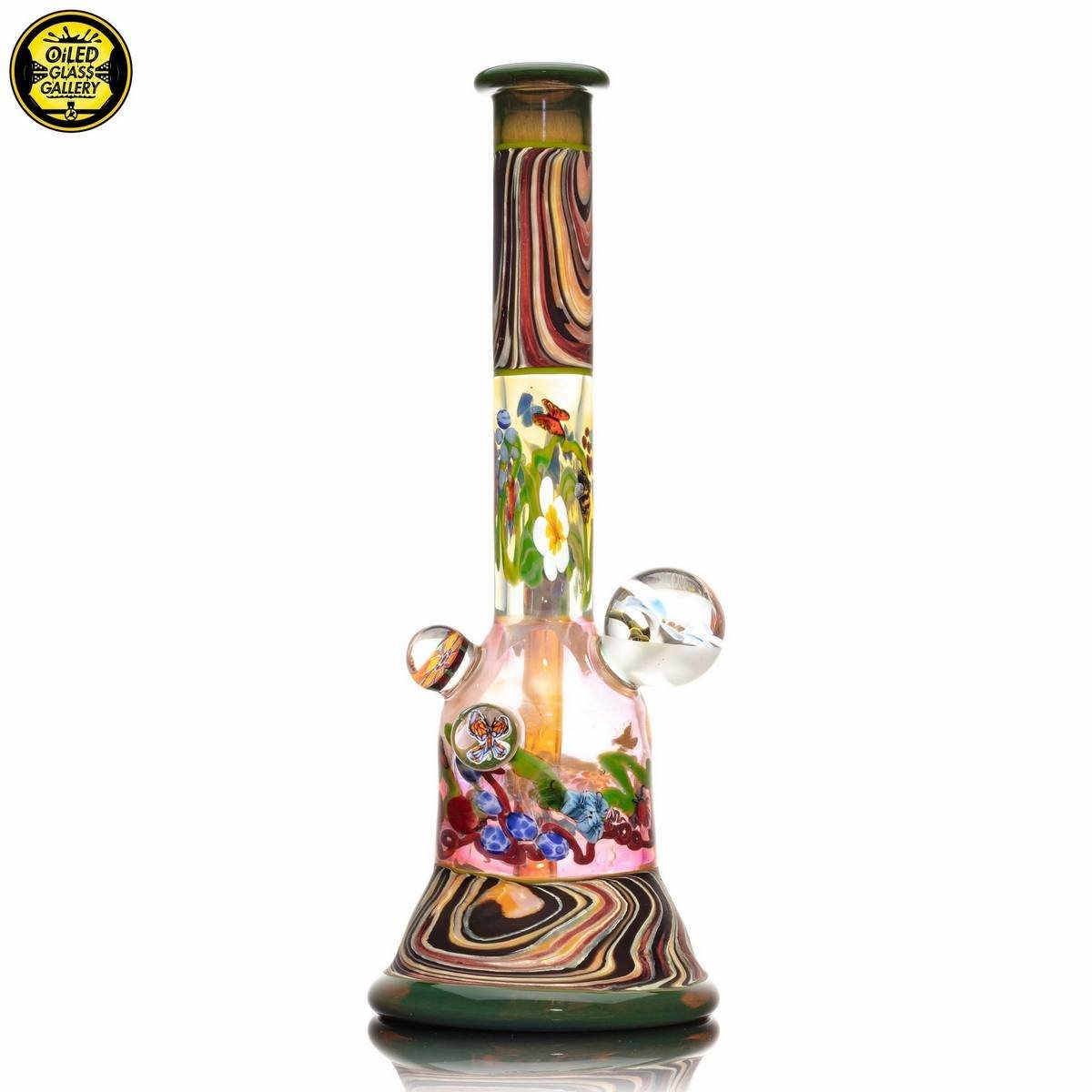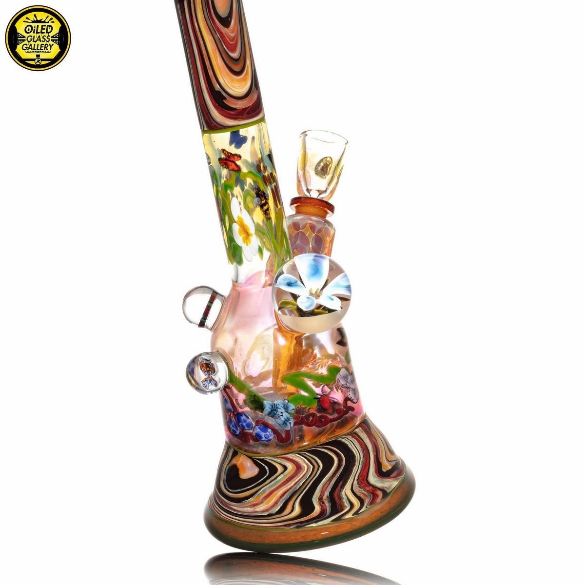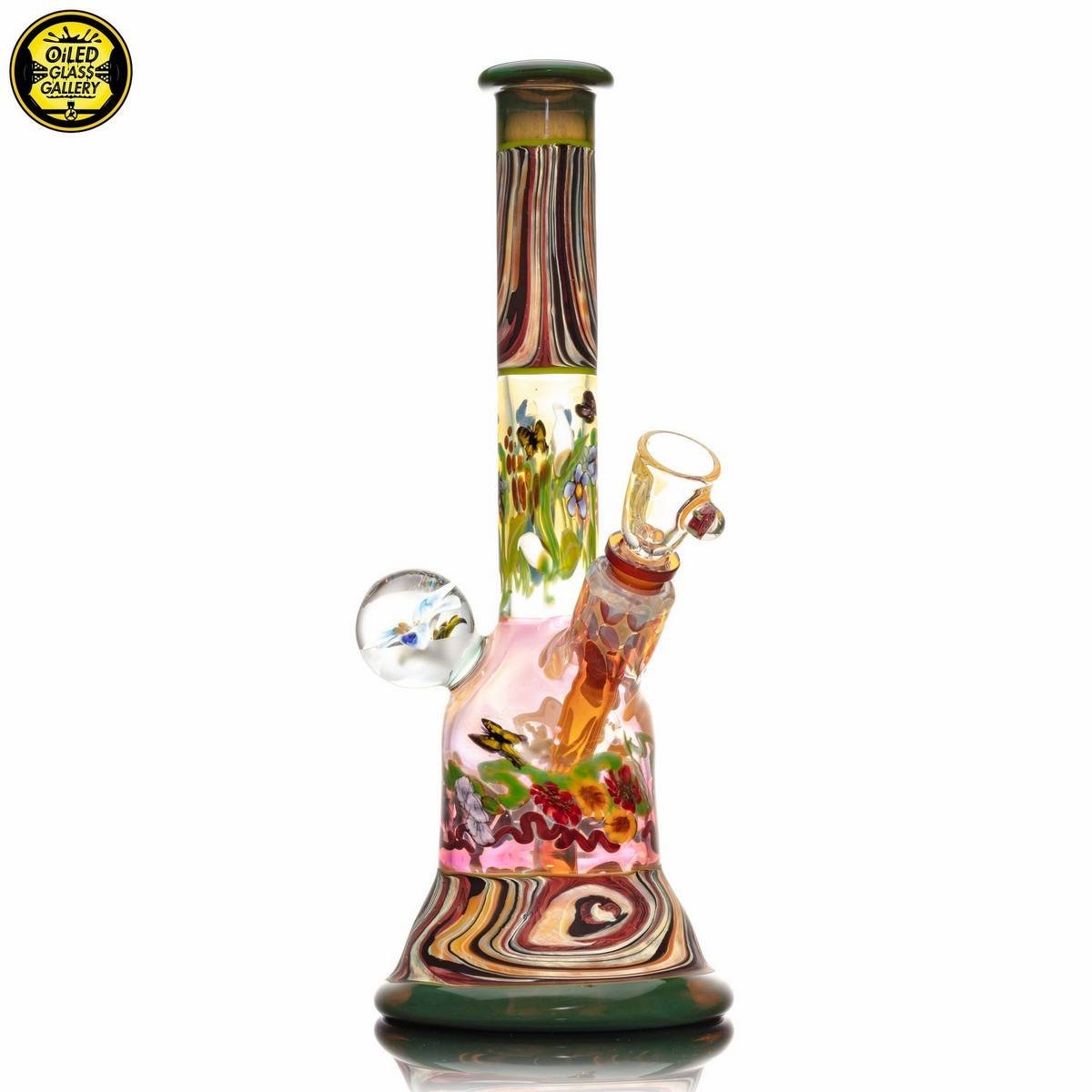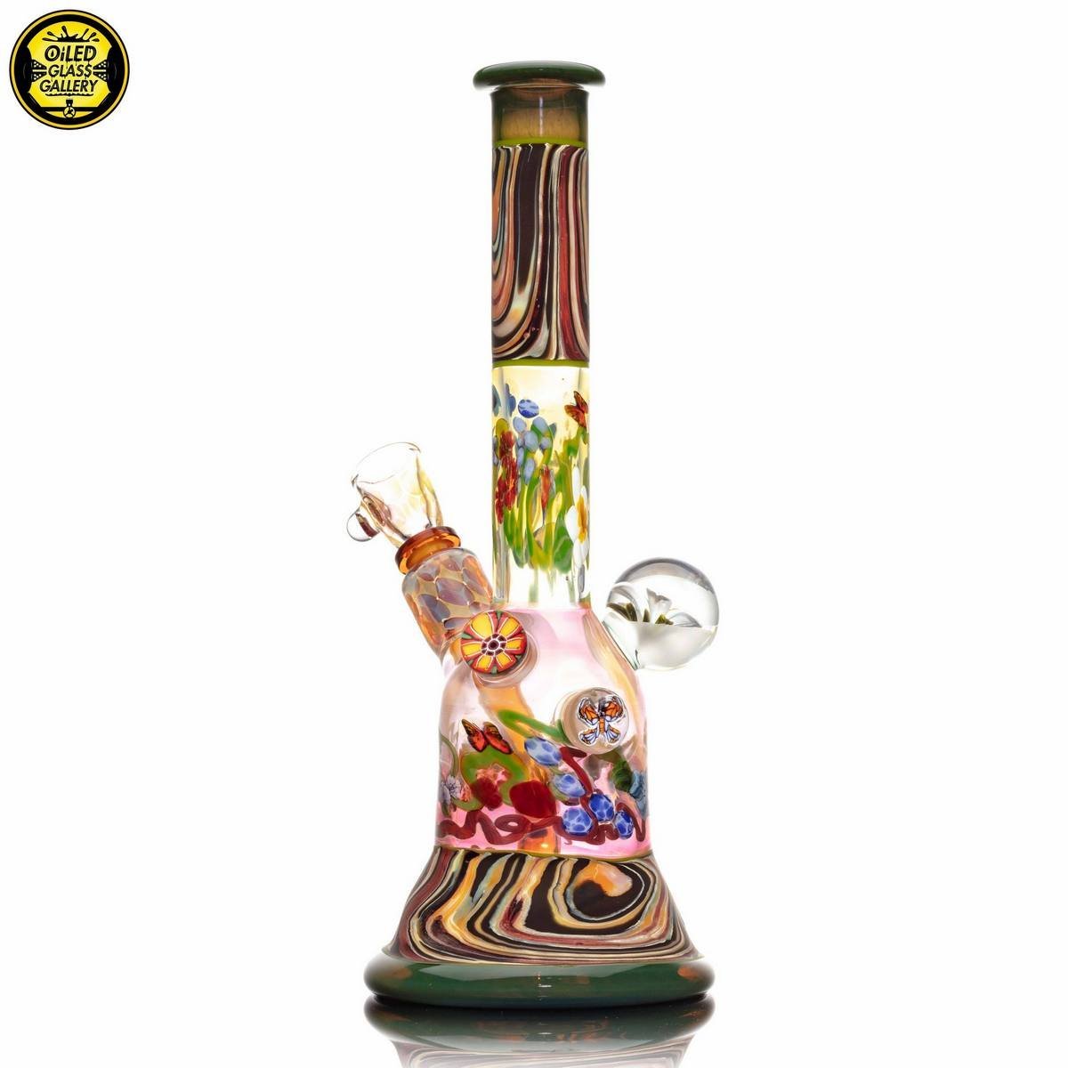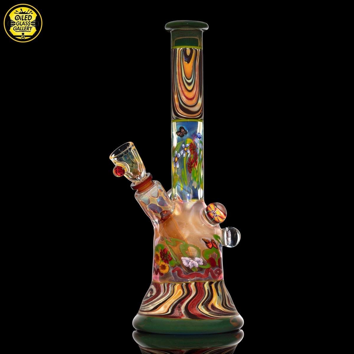 2023 14mm 12.5in Botanical Millefiori Beaker tube made of a Blue Caramel Frit tubing, wood grain tech, an inside out insect and flower millefiori scene, and gold and silver fuming sections. Features two millefiori encased mibs and a huge half sandblasted flower implosion mib attached to the sides. Comes with a matching removable 3-hole stem and 1-hole slide with rose millefiori mib, all shipped in an Apache hard case.