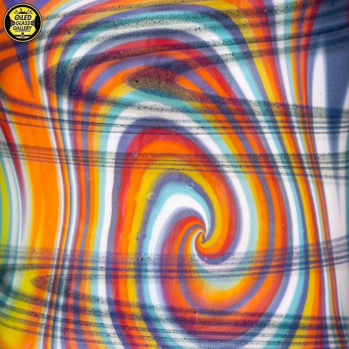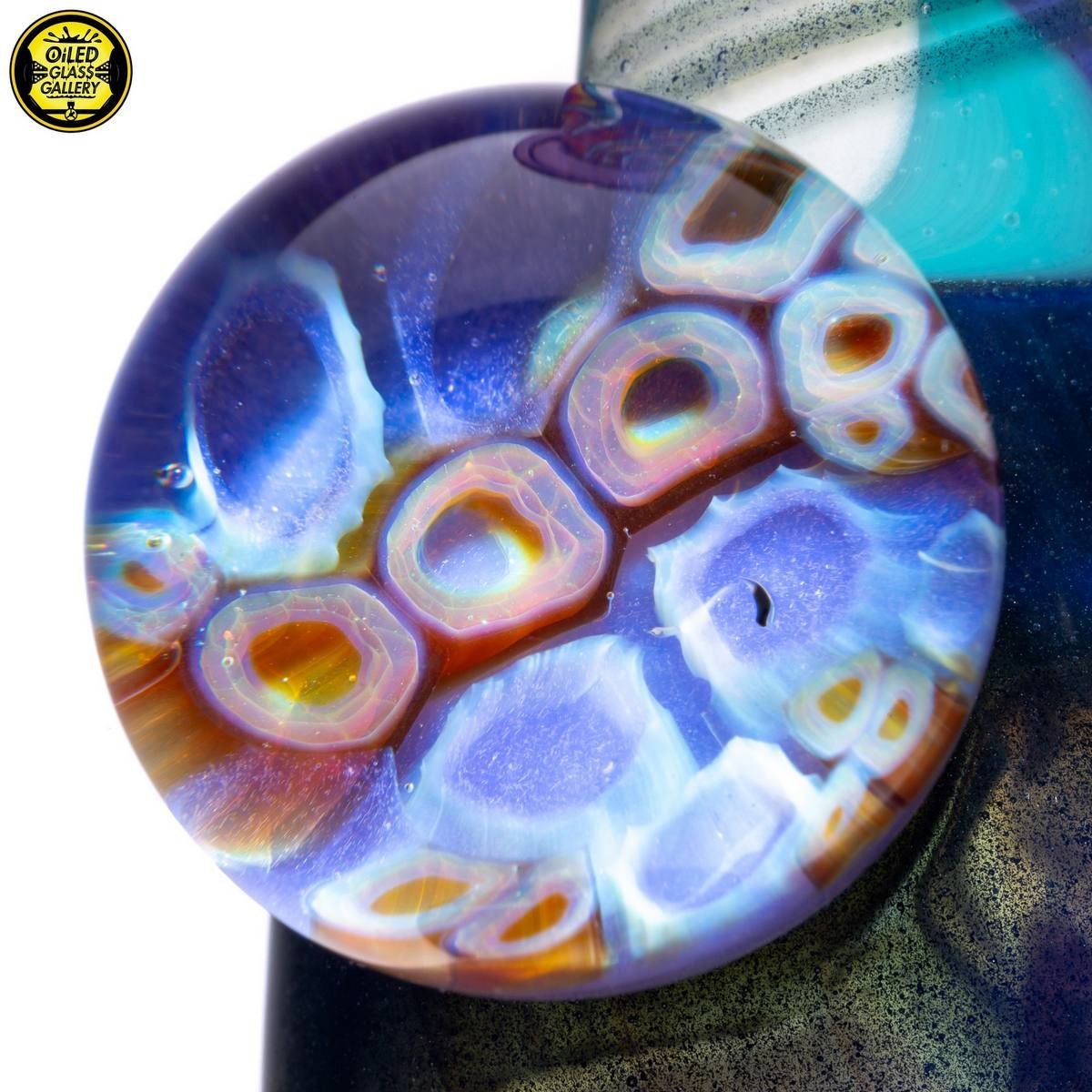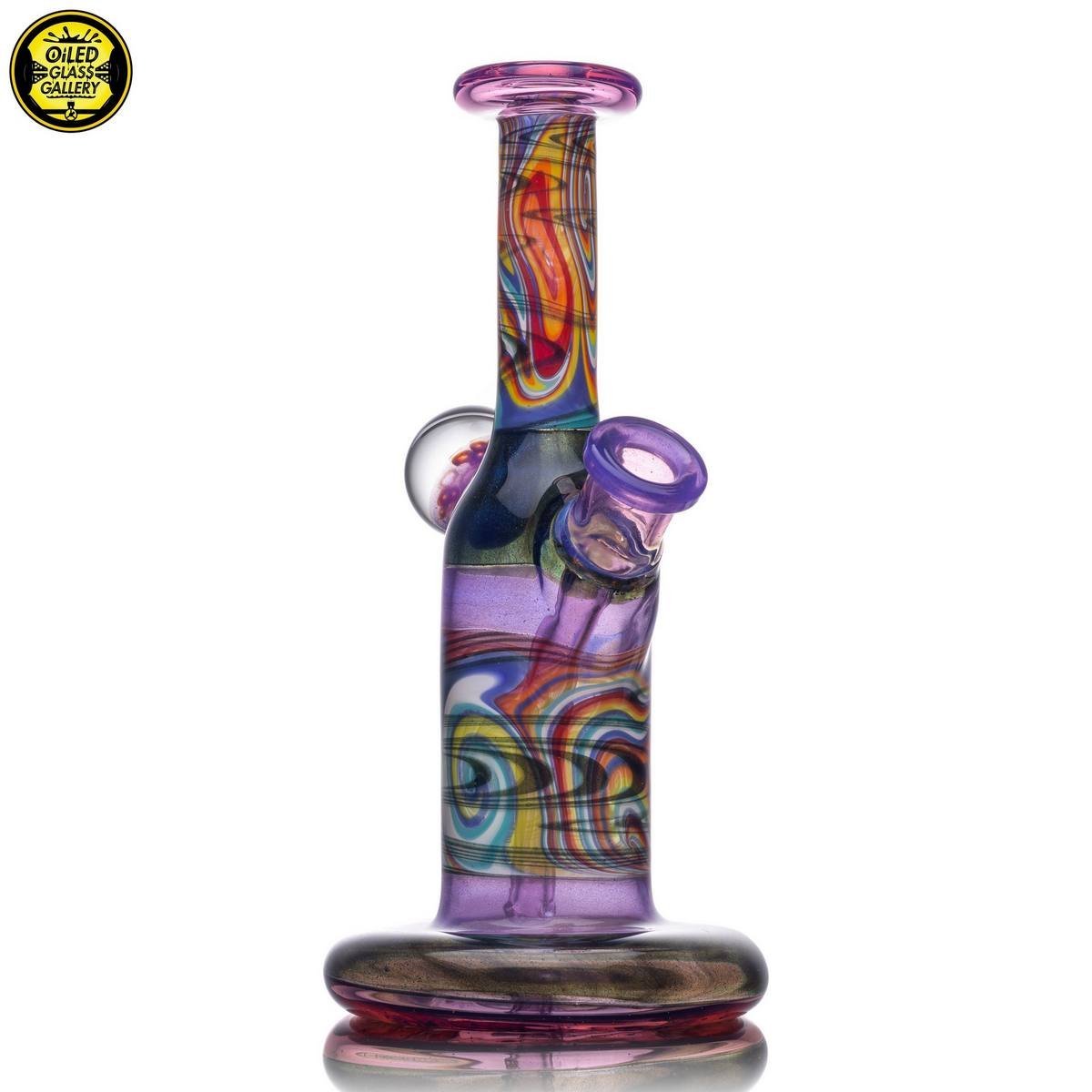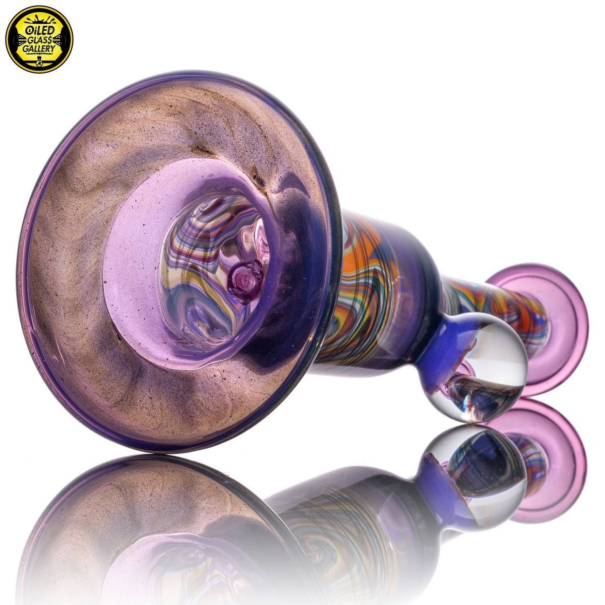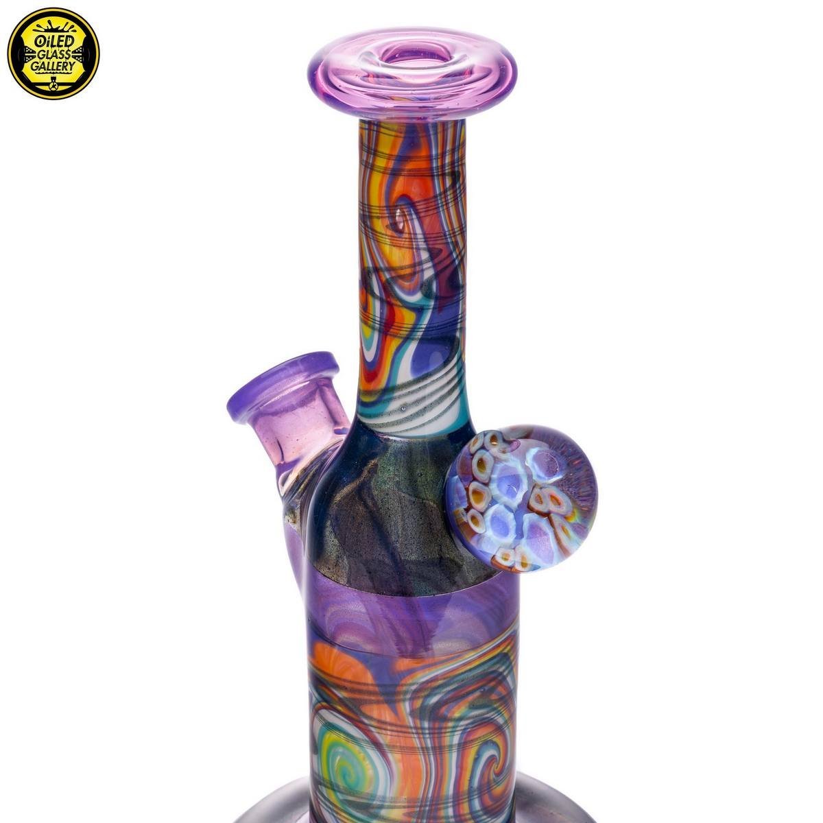 2021 14mm 8.5in CFL Double Layer Wig Wag Tube Set made of Greasy Glass Acadian Night, Rose Quartz & Glopal over Wild Berry. Features double layer wig wag tubing, a reef encased millefiori mib on the back, a fixed 2-hole downstem and a bubble cap.