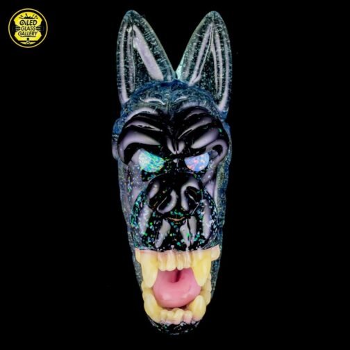 2019 14mm 6in CFL Open Mouth Wolf Head Banger Hanger Tube set made of Glass Alchemy Elixir with Profund Glass crushed opal over Eclipse and white opal eyes. Has a 2 hole perc, comes with a matching Open Mouth Wolf Head pendant and shipped in a Pelican case.