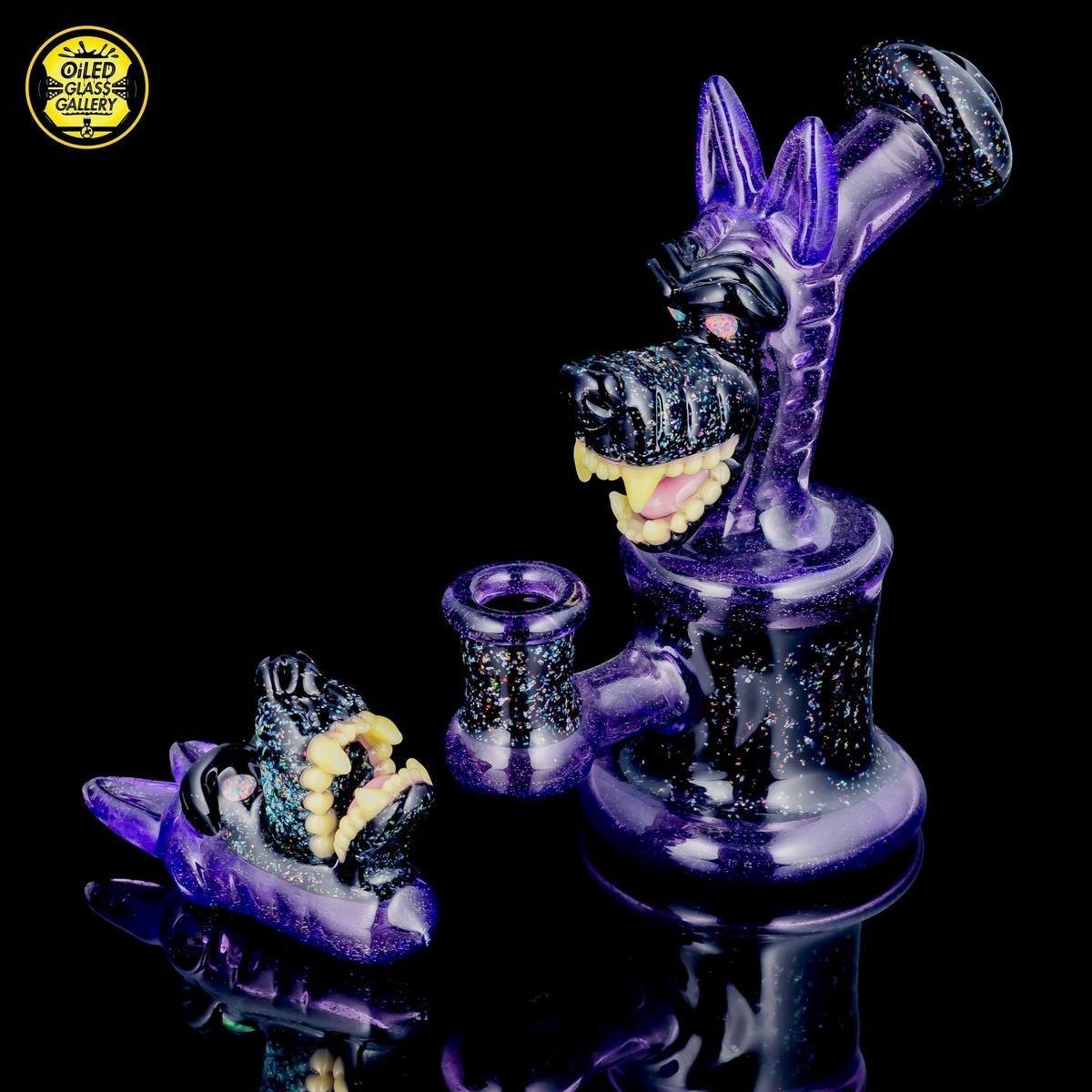 2019 14mm 6in CFL Open Mouth Wolf Head Banger Hanger Tube set made of Glass Alchemy Elixir with Profund Glass crushed opal over Eclipse and white opal eyes. Has a 2 hole perc, comes with a matching Open Mouth Wolf Head pendant and shipped in a Pelican case.