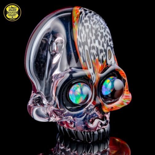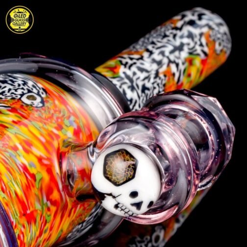 2020 14mm 8.75in CFL Rasta Black & White Skulls Murrine Tube set made with Glass Alchemy CFL Voodoo and multiple millefiori chips that were rolled into beautiful tubing sections. This piece features a 2-hole diffy downstem, a 45mm 24 faceted edge mib encasing a 20mm millefiori under a 15mm opal coin, matching millefiori slide and will come shipped in a Pelican case. This piece is from the 2020 Glass Vegas Expo and can come with a matching millefiori skull pendant.