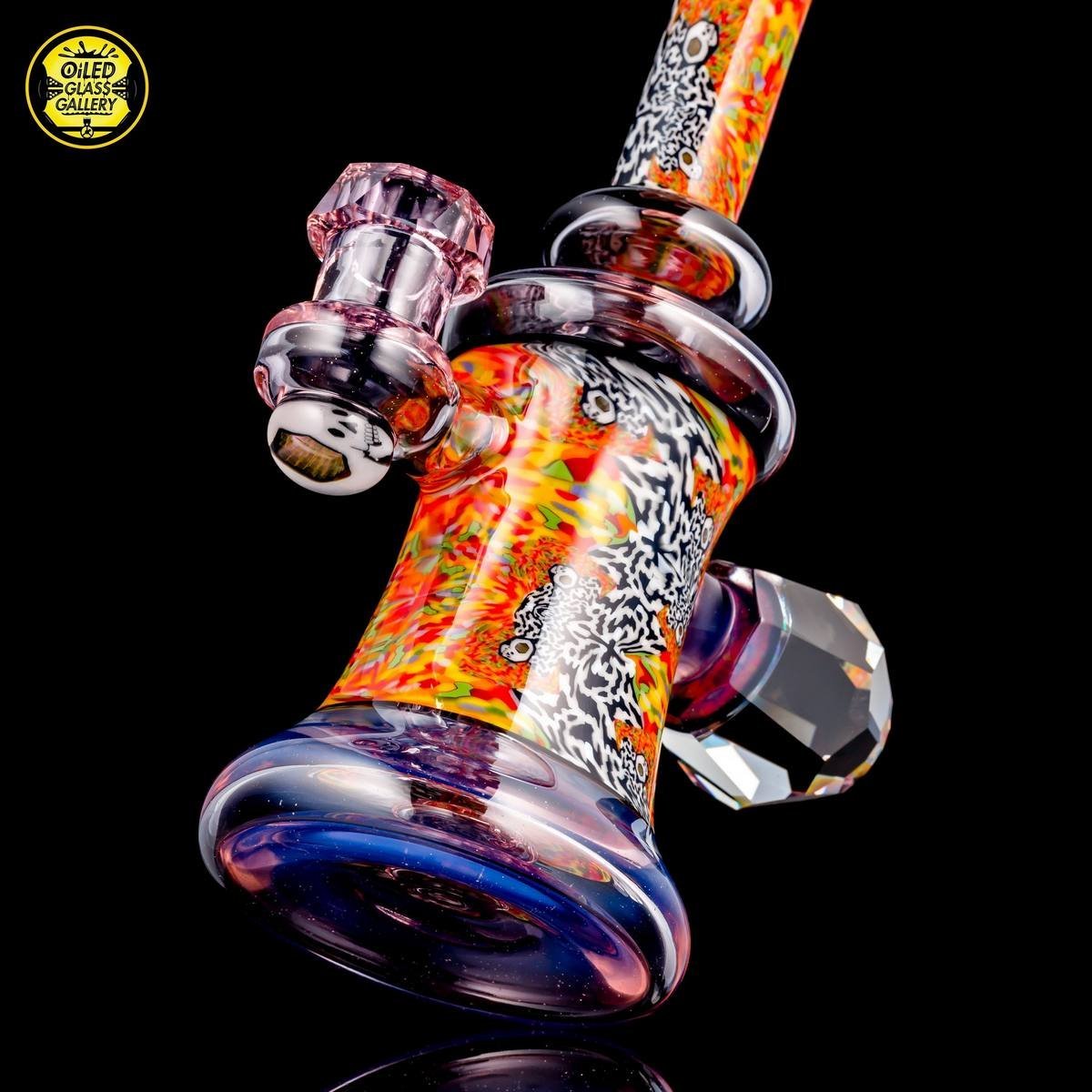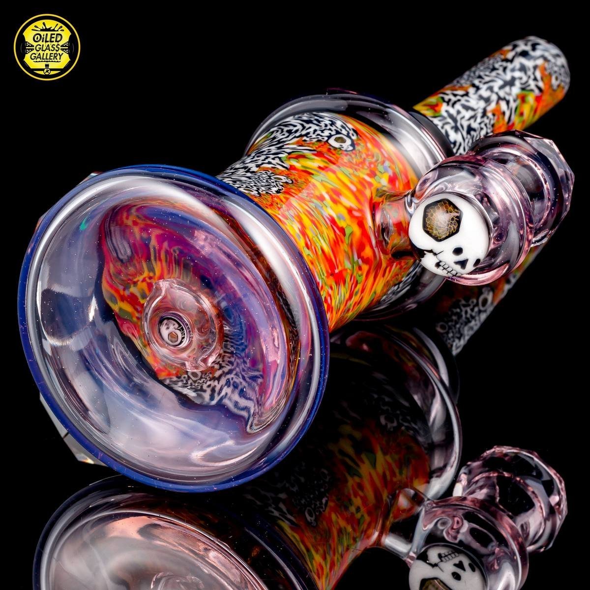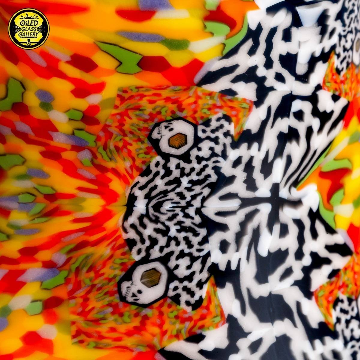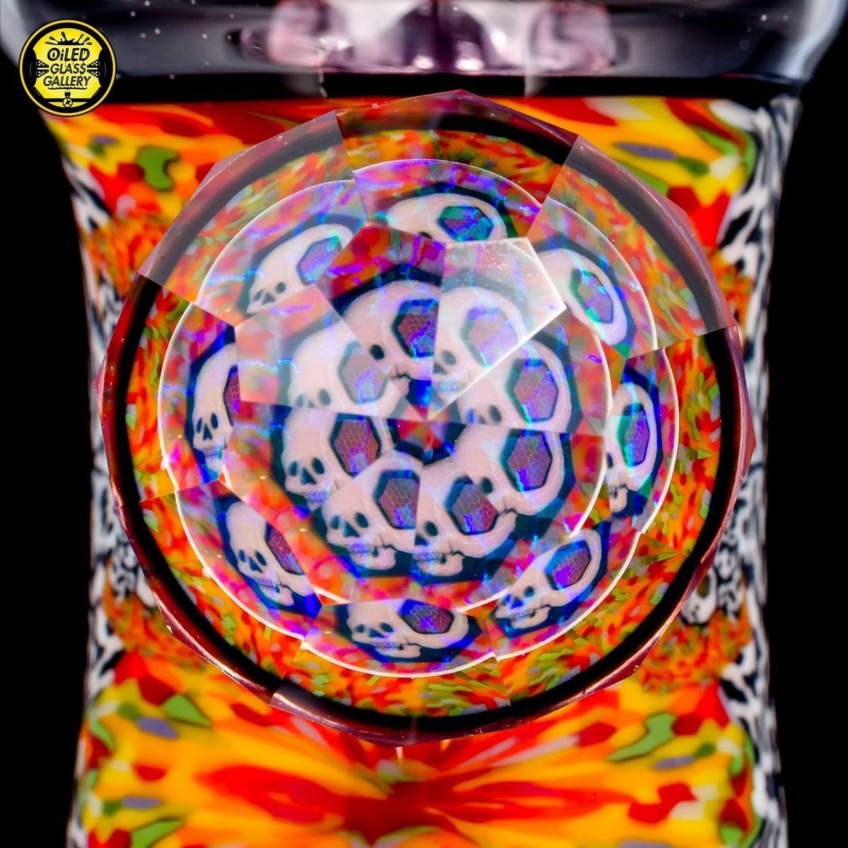 2020 14mm 8.75in CFL Rasta Black & White Skulls Murrine Tube set made with Glass Alchemy CFL Voodoo and multiple millefiori chips that were rolled into beautiful tubing sections. This piece features a 2-hole diffy downstem, a 45mm 24 faceted edge mib encasing a 20mm millefiori under a 15mm opal coin, matching millefiori slide and will come shipped in a Pelican case. This piece is from the 2020 Glass Vegas Expo and can come with a matching millefiori skull pendant.