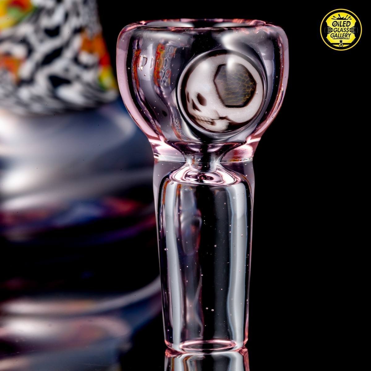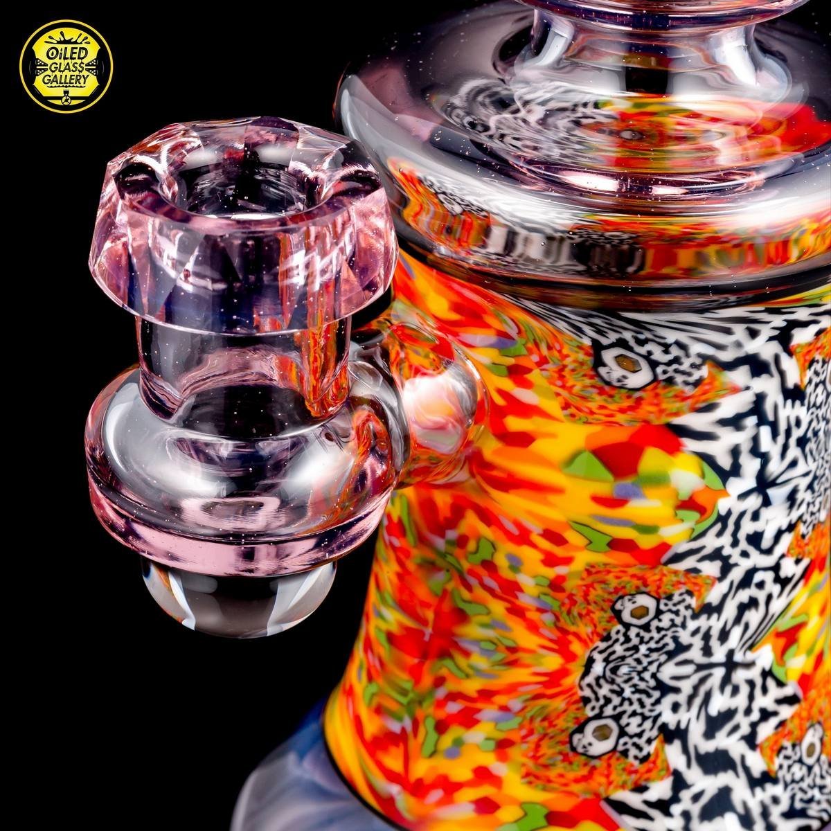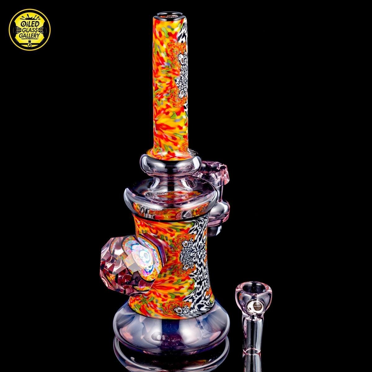 2020 14mm 8.75in CFL Rasta Black & White Skulls Murrine Tube set made with Glass Alchemy CFL Voodoo and multiple millefiori chips that were rolled into beautiful tubing sections. This piece features a 2-hole diffy downstem, a 45mm 24 faceted edge mib encasing a 20mm millefiori under a 15mm opal coin, matching millefiori slide and will come shipped in a Pelican case. This piece is from the 2020 Glass Vegas Expo and can come with a matching millefiori skull pendant.