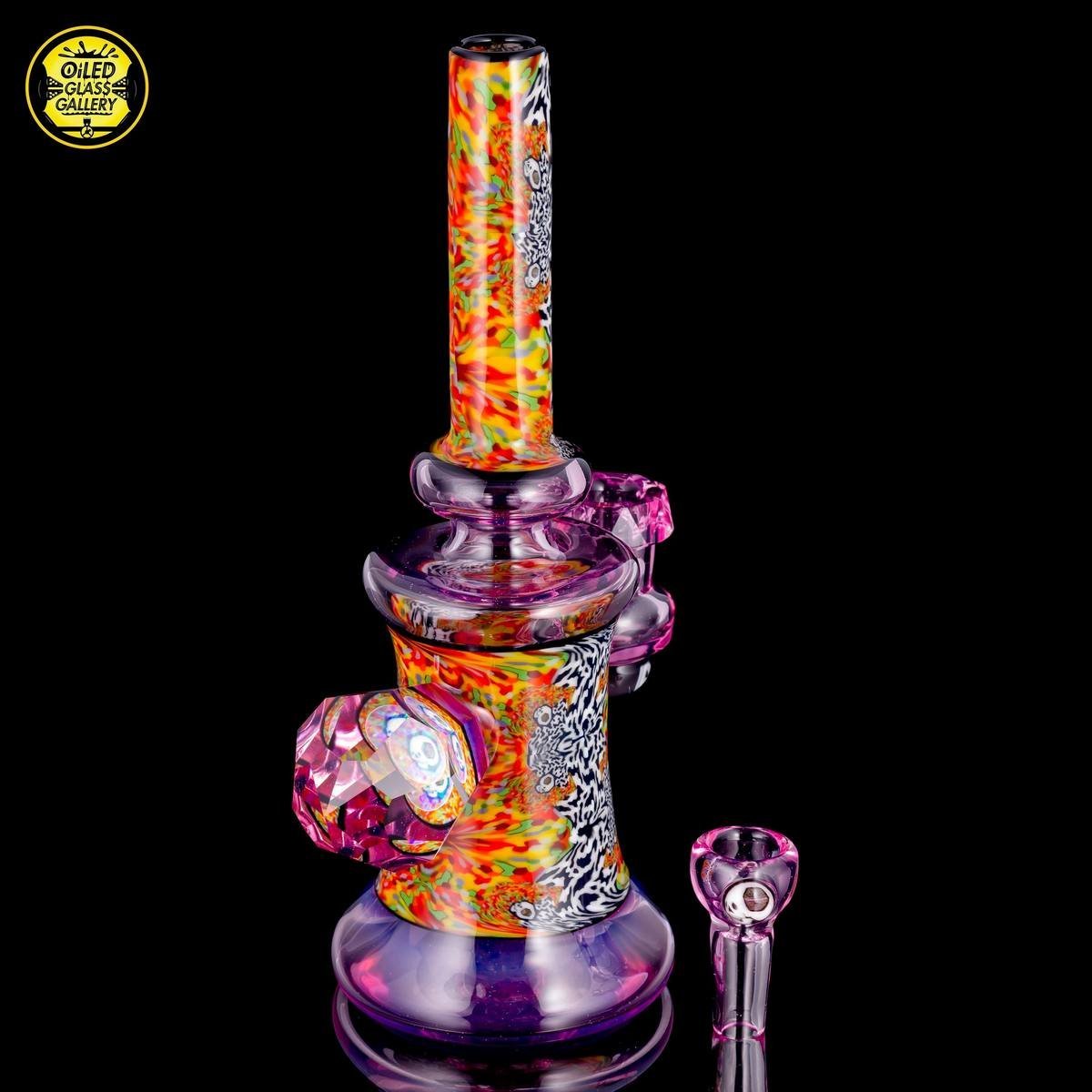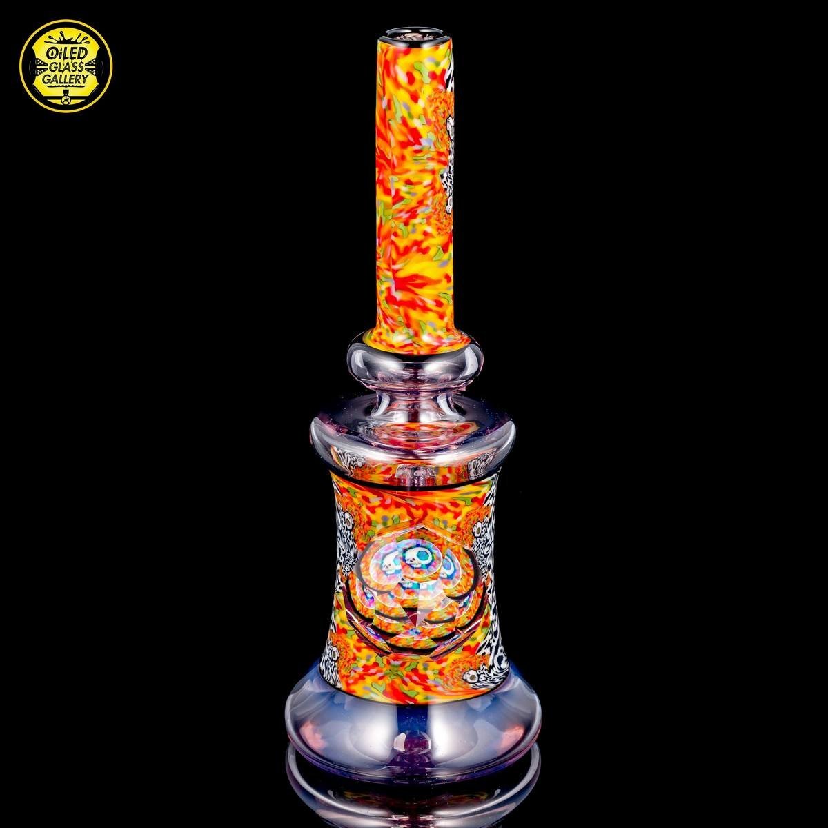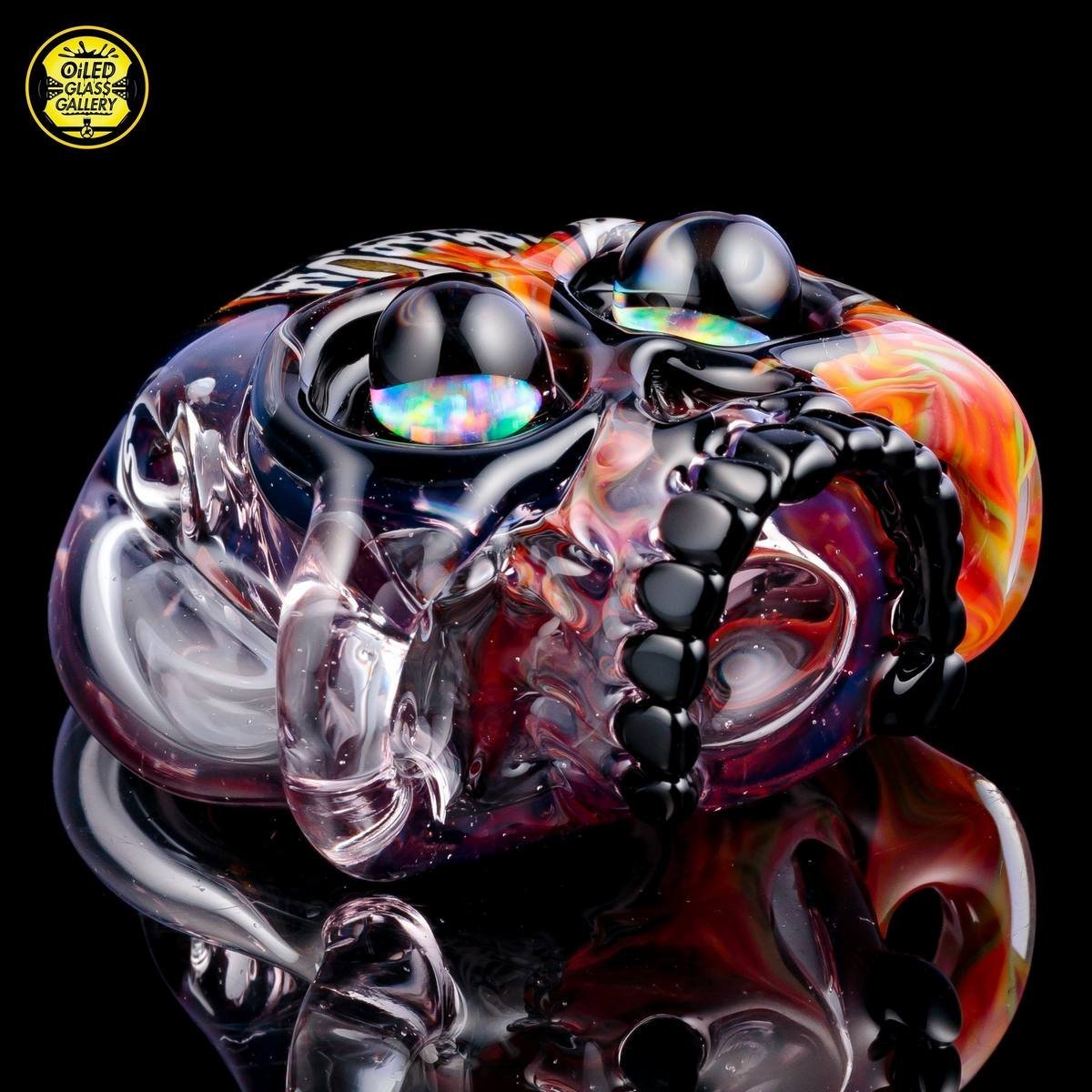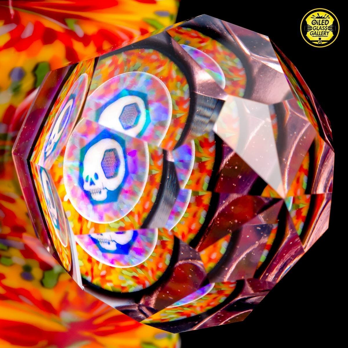 2020 14mm 8.75in CFL Rasta Black & White Skulls Murrine Tube set made with Glass Alchemy CFL Voodoo and multiple millefiori chips that were rolled into beautiful tubing sections. This piece features a 2-hole diffy downstem, a 45mm 24 faceted edge mib encasing a 20mm millefiori under a 15mm opal coin, matching millefiori slide and will come shipped in a Pelican case. This piece is from the 2020 Glass Vegas Expo and can come with a matching millefiori skull pendant.