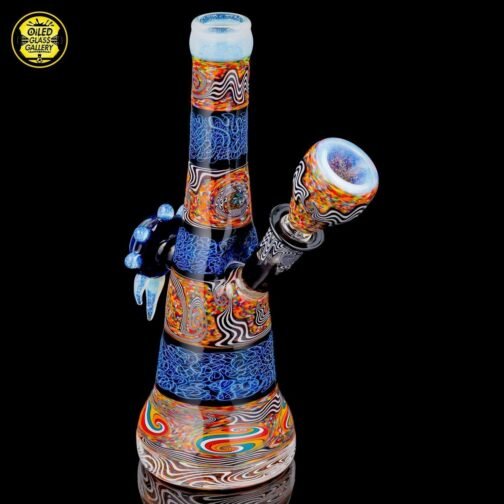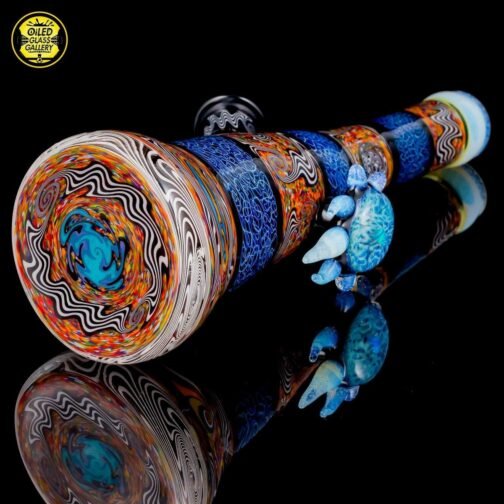 2018 14mm 8in Chaos Coogi Silver Fumed Squiggletech Tube set with Secret White highlights and mouthpiece. Has a beautiful Silver Fume Squiggletech Mib with an encased opal and Secret White accents/horns. Comes with a matching bowl and 27mm bubble cap and shipped in a Pelican case.