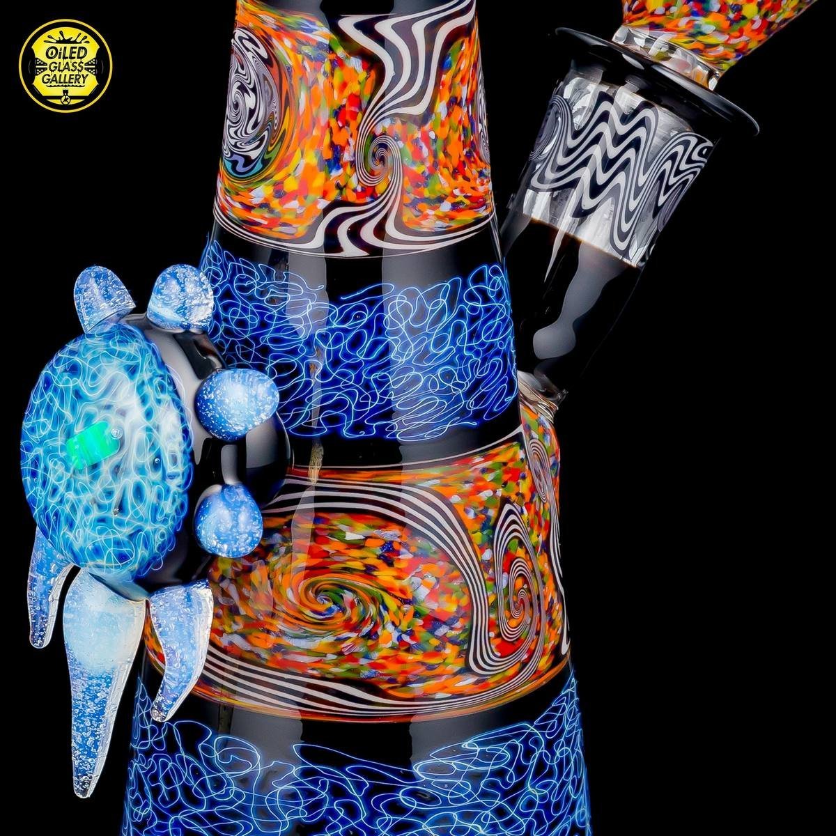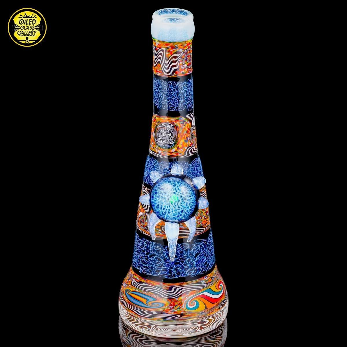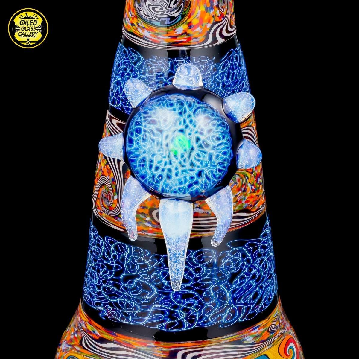 2018 14mm 8in Chaos Coogi Silver Fumed Squiggletech Tube set with Secret White highlights and mouthpiece. Has a beautiful Silver Fume Squiggletech Mib with an encased opal and Secret White accents/horns. Comes with a matching bowl and 27mm bubble cap and shipped in a Pelican case.