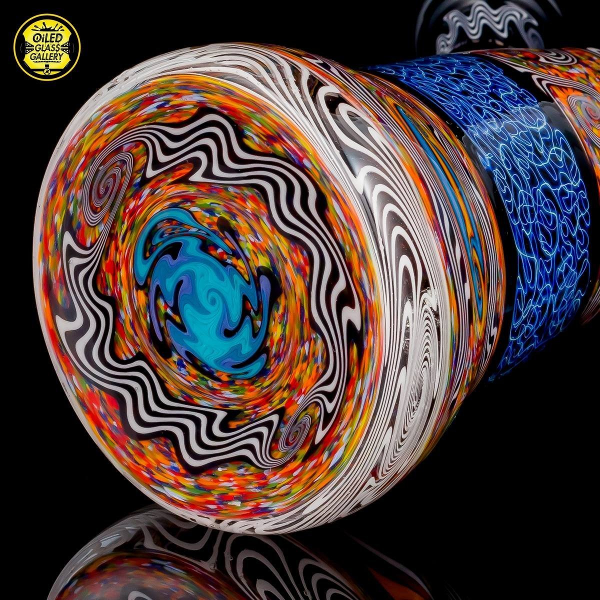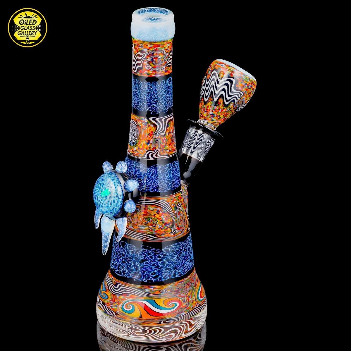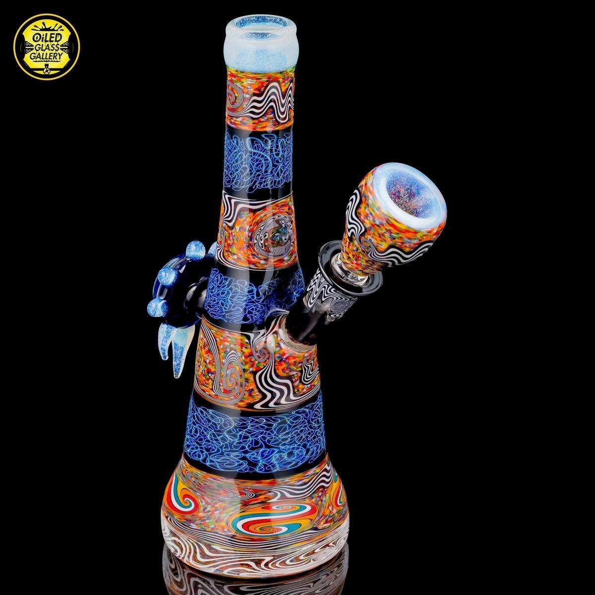 2018 14mm 8in Chaos Coogi Silver Fumed Squiggletech Tube set with Secret White highlights and mouthpiece. Has a beautiful Silver Fume Squiggletech Mib with an encased opal and Secret White accents/horns. Comes with a matching bowl and 27mm bubble cap and shipped in a Pelican case.
