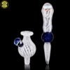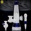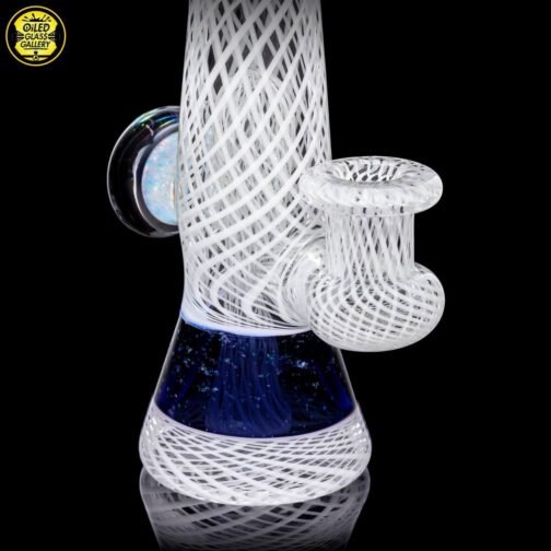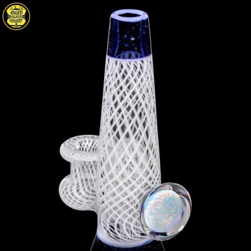 2021 14mm 7.25in Crushed Opal Retticello Cone Lamp Tube set made of Northstar Glass Dark Amethyst with crushed opal and Northstar Glass Star White Retticello sections. This set features a massive encased 20mm opal coin mib mounted on the back and 3-hole perc with encased 6mm opal coin underneath. The set comes with a matching dabber with a 10mm encased opal on the end, a bubble cap, and shipped in a Black Pelican iM2050 case.