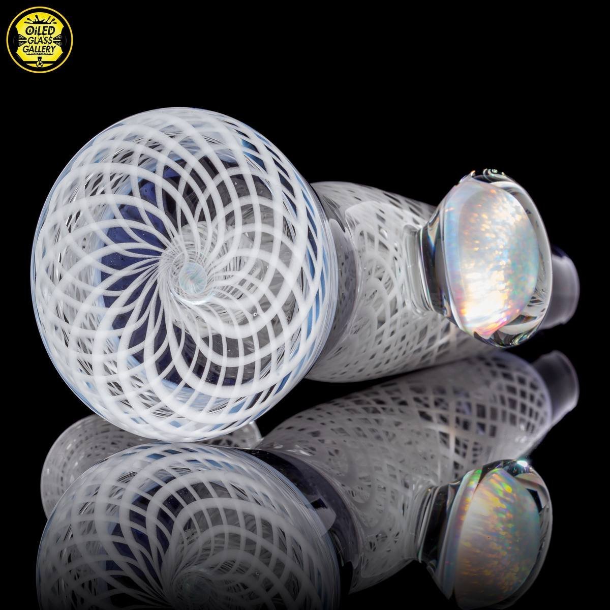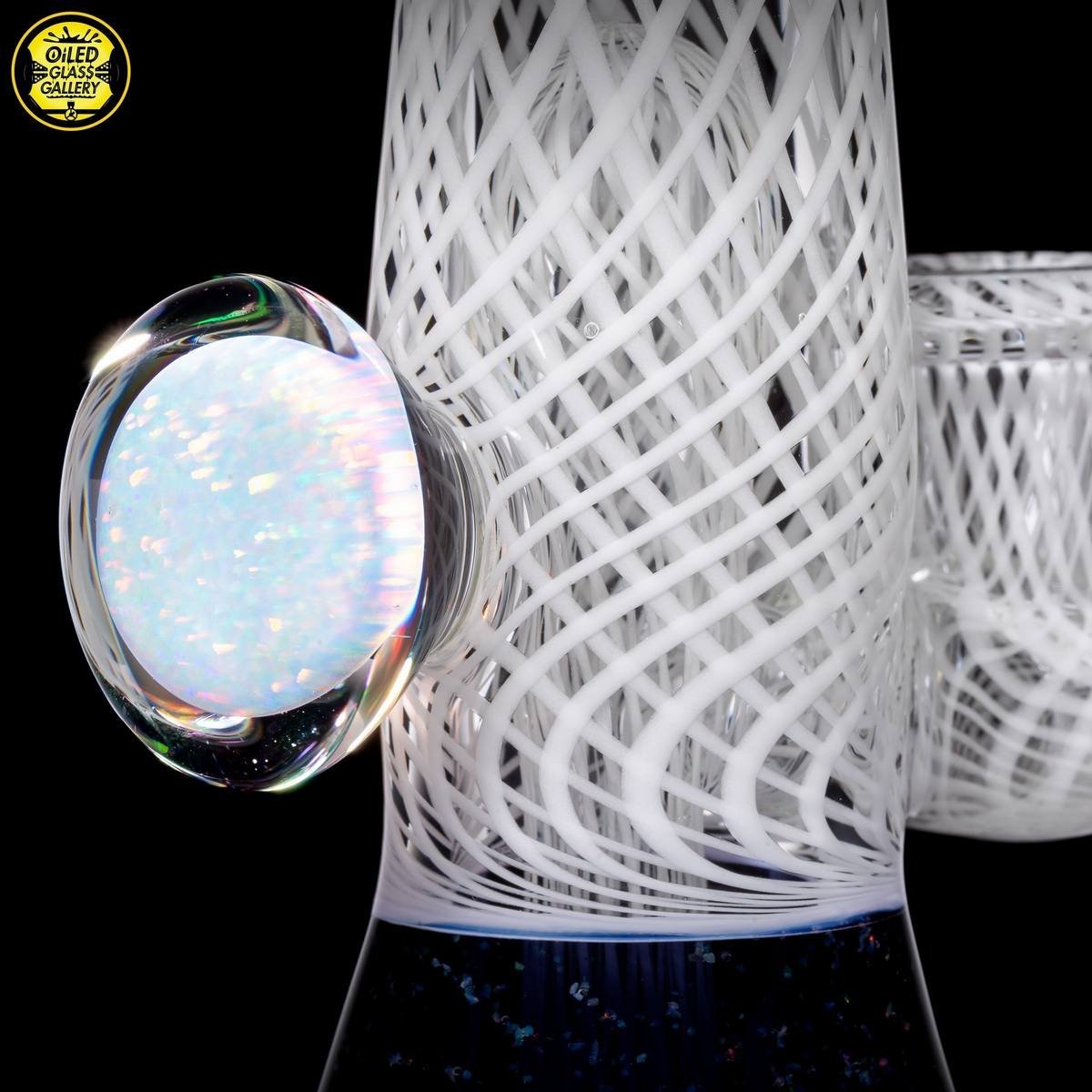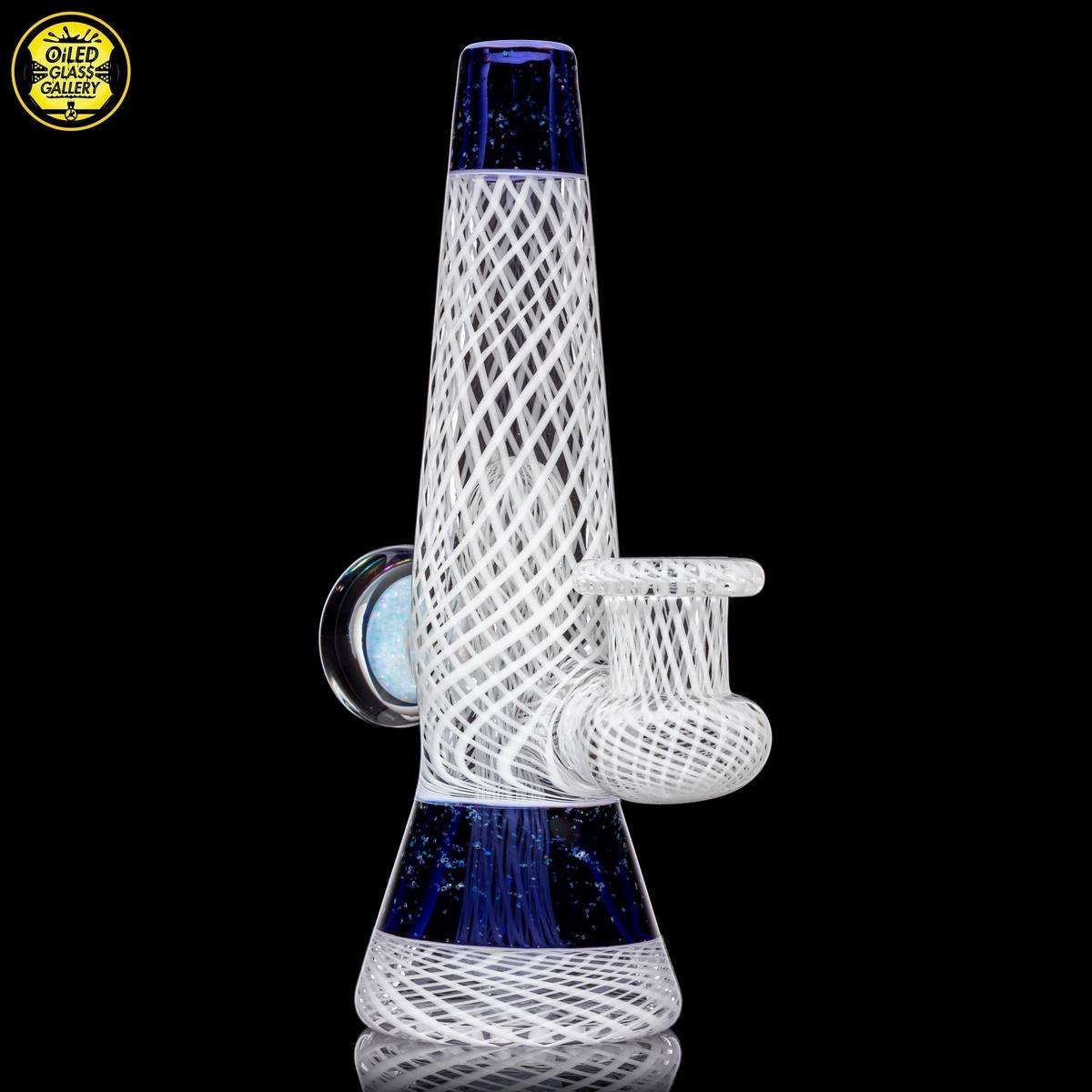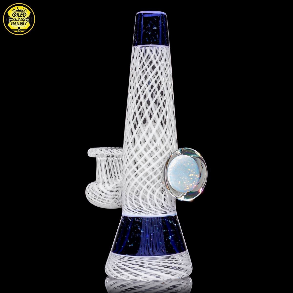 2021 14mm 7.25in Crushed Opal Retticello Cone Lamp Tube set made of Northstar Glass Dark Amethyst with crushed opal and Northstar Glass Star White Retticello sections. This set features a massive encased 20mm opal coin mib mounted on the back and 3-hole perc with encased 6mm opal coin underneath. The set comes with a matching dabber with a 10mm encased opal on the end, a bubble cap, and shipped in a Black Pelican iM2050 case.