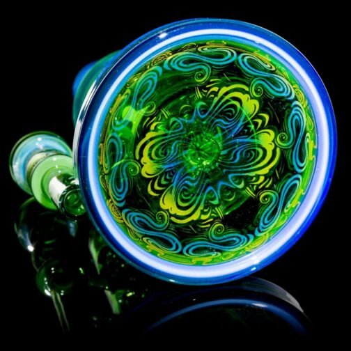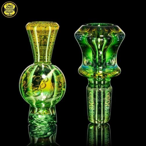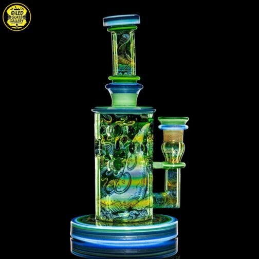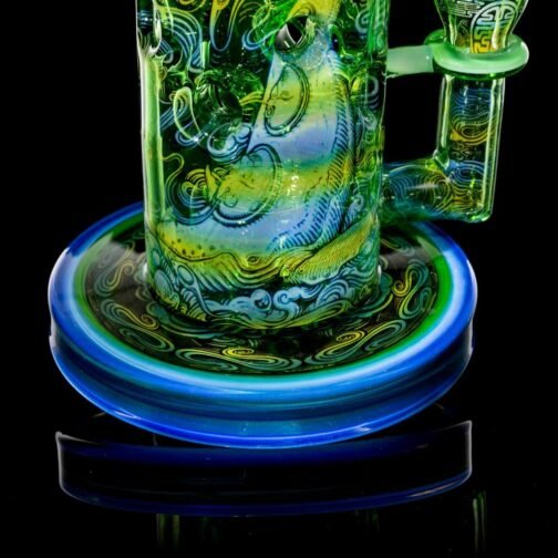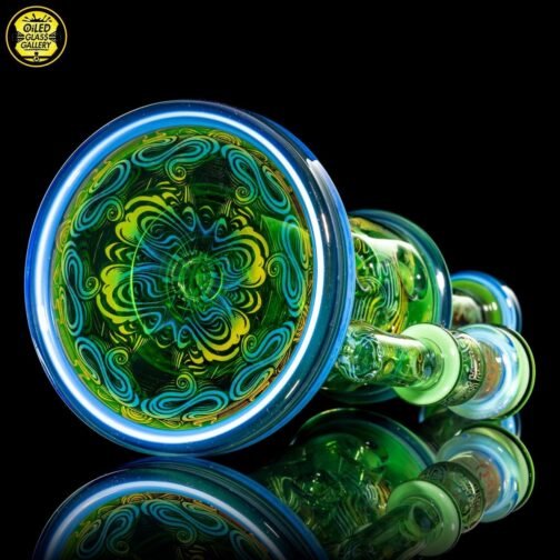 2021 14mm 7.5in Elite “Pod” Green Straight Fab tube set from the Hologram Sub-Series of the “Strange Deities” Saga featuring highlight colors Dark Blue over Millennium Moss and Ghost over Berry Gumbolt from Northstar Glass. This piece comes with a matching slide, bubble cap, small wooden tray, stickers, a Limited Edition Grassroots California x Mothership Glass Snapback Hat, and a special edition Octave Hightech x Mothership Glass Terp Timer. Comes shipped in a Black Pelican 1400 case.