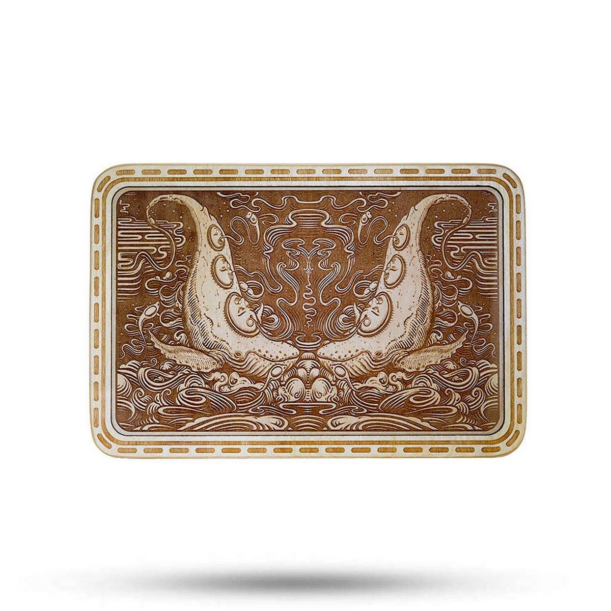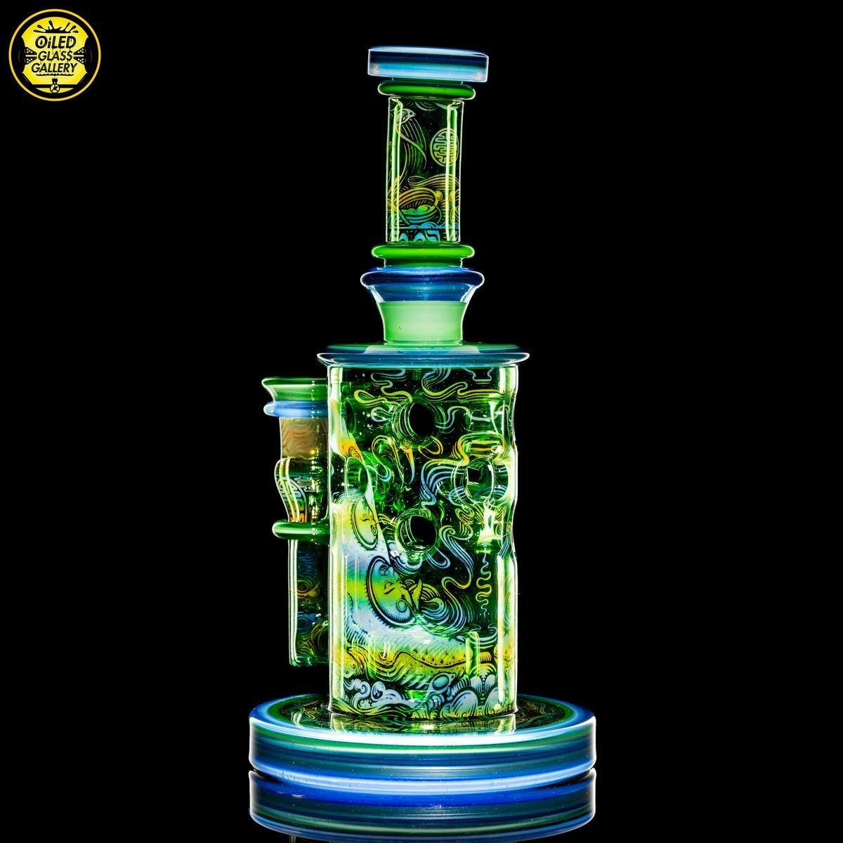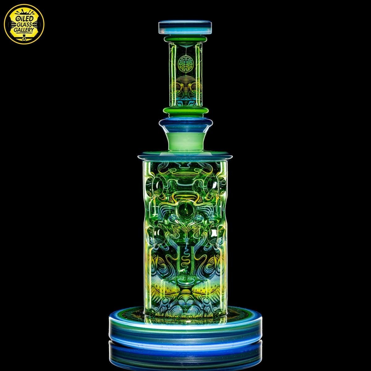 2021 14mm 7.5in Elite “Pod” Green Straight Fab tube set from the Hologram Sub-Series of the “Strange Deities” Saga featuring highlight colors Dark Blue over Millennium Moss and Ghost over Berry Gumbolt from Northstar Glass. This piece comes with a matching slide, bubble cap, small wooden tray, stickers, a Limited Edition Grassroots California x Mothership Glass Snapback Hat, and a special edition Octave Hightech x Mothership Glass Terp Timer. Comes shipped in a Black Pelican 1400 case.