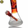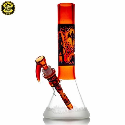 2023 14mm 11.75in “Magma Succubus” UV Carved Beaker tube made of all Northstar Glass colors featuring Canary, Lava, UV Nova, Cherry and Galaxy. Features multiple layers of deep carvings into the glass along the neck and a sandblasted bottom. Comes with a matching 4-hole slide, a carved 4-slit stem and comes shipped in a hard case.