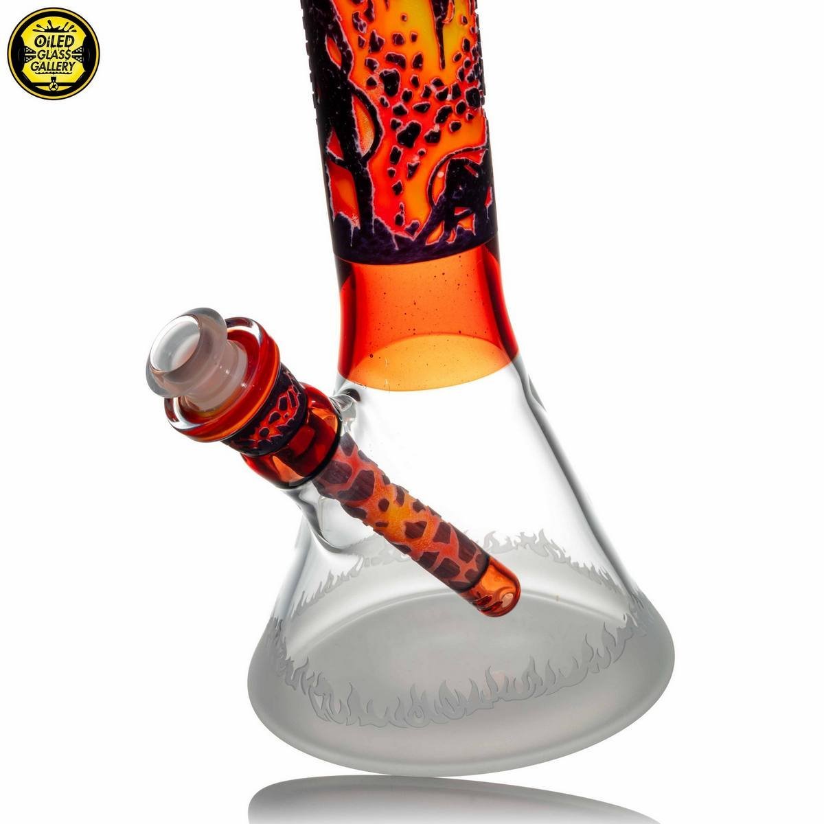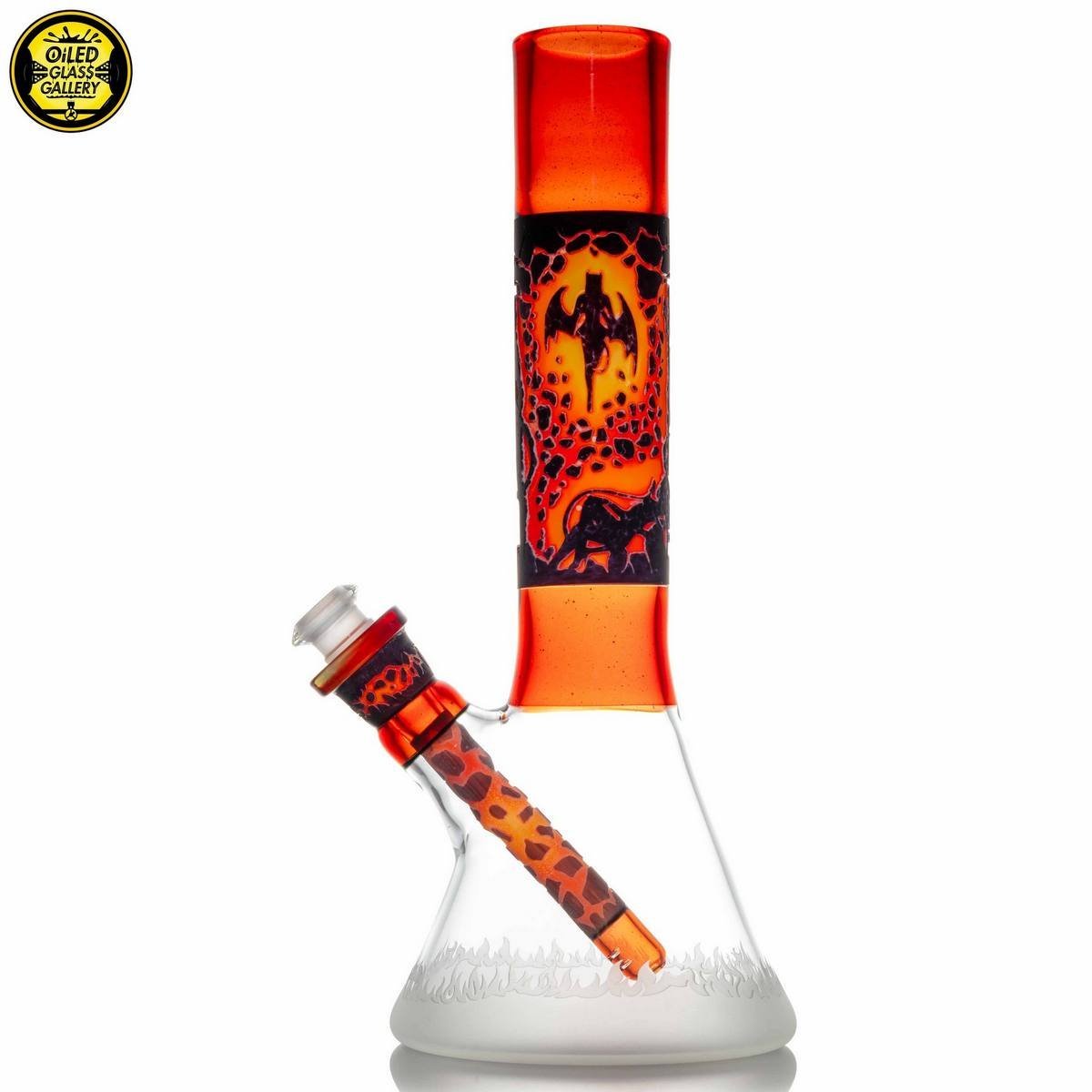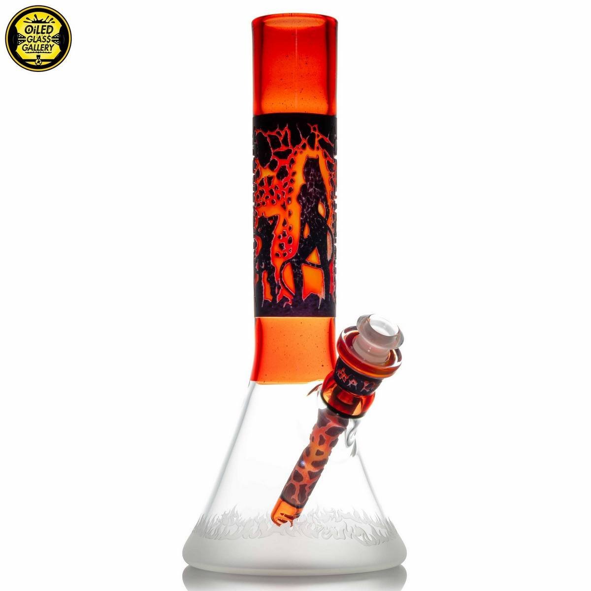 2023 14mm 11.75in “Magma Succubus” UV Carved Beaker tube made of all Northstar Glass colors featuring Canary, Lava, UV Nova, Cherry and Galaxy. Features multiple layers of deep carvings into the glass along the neck and a sandblasted bottom. Comes with a matching 4-hole slide, a carved 4-slit stem and comes shipped in a hard case.