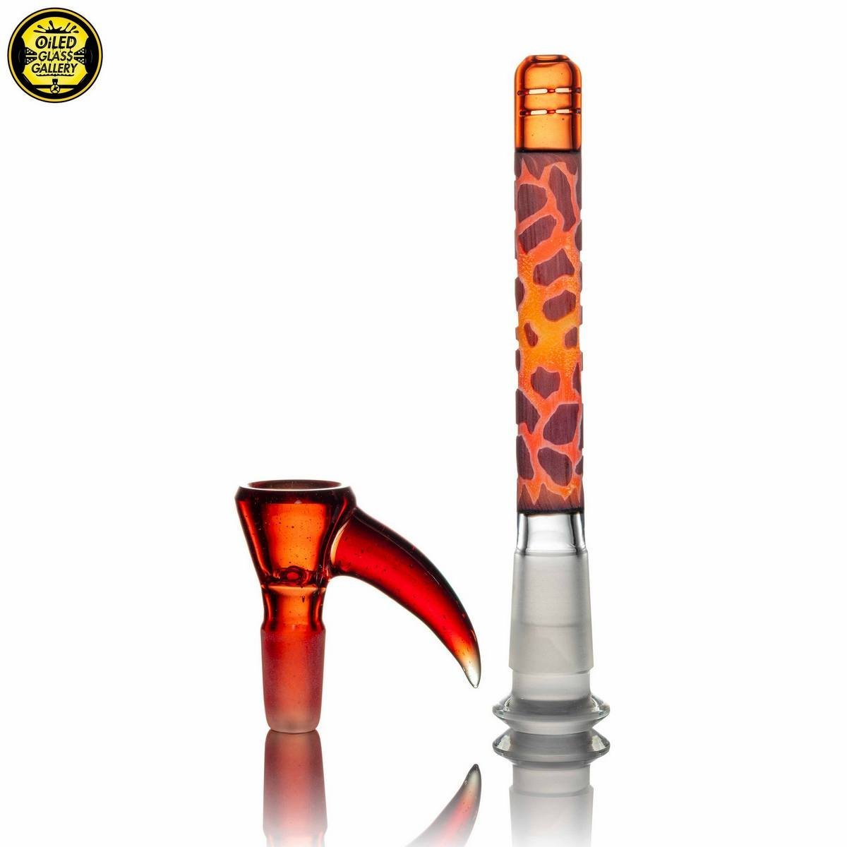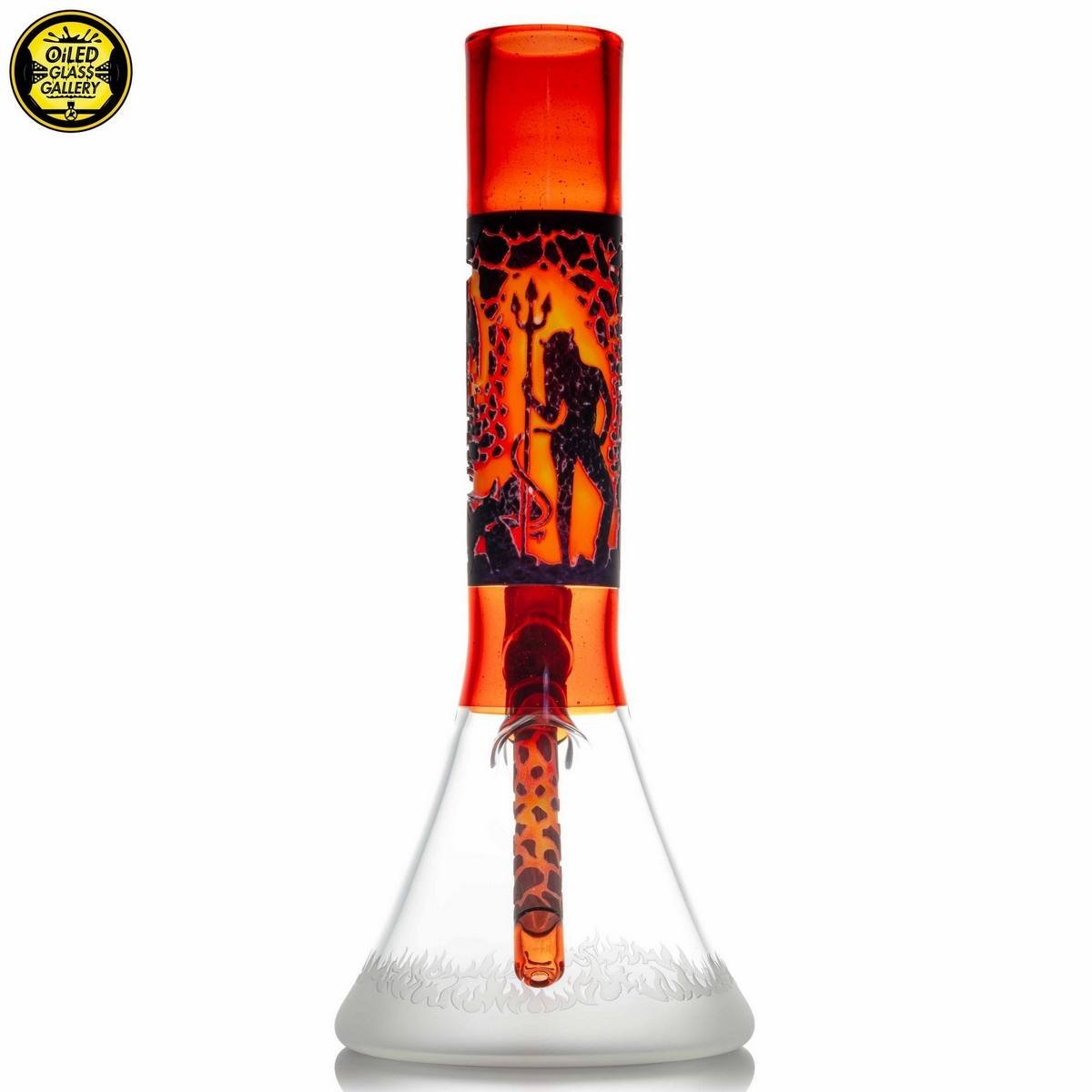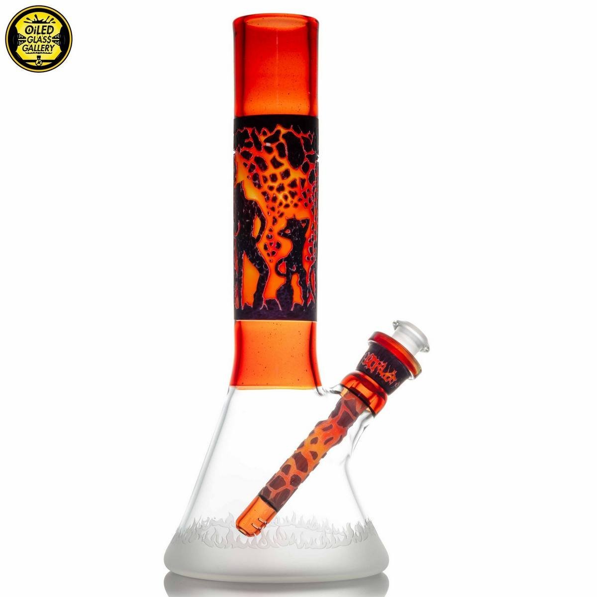 2023 14mm 11.75in “Magma Succubus” UV Carved Beaker tube made of all Northstar Glass colors featuring Canary, Lava, UV Nova, Cherry and Galaxy. Features multiple layers of deep carvings into the glass along the neck and a sandblasted bottom. Comes with a matching 4-hole slide, a carved 4-slit stem and comes shipped in a hard case.