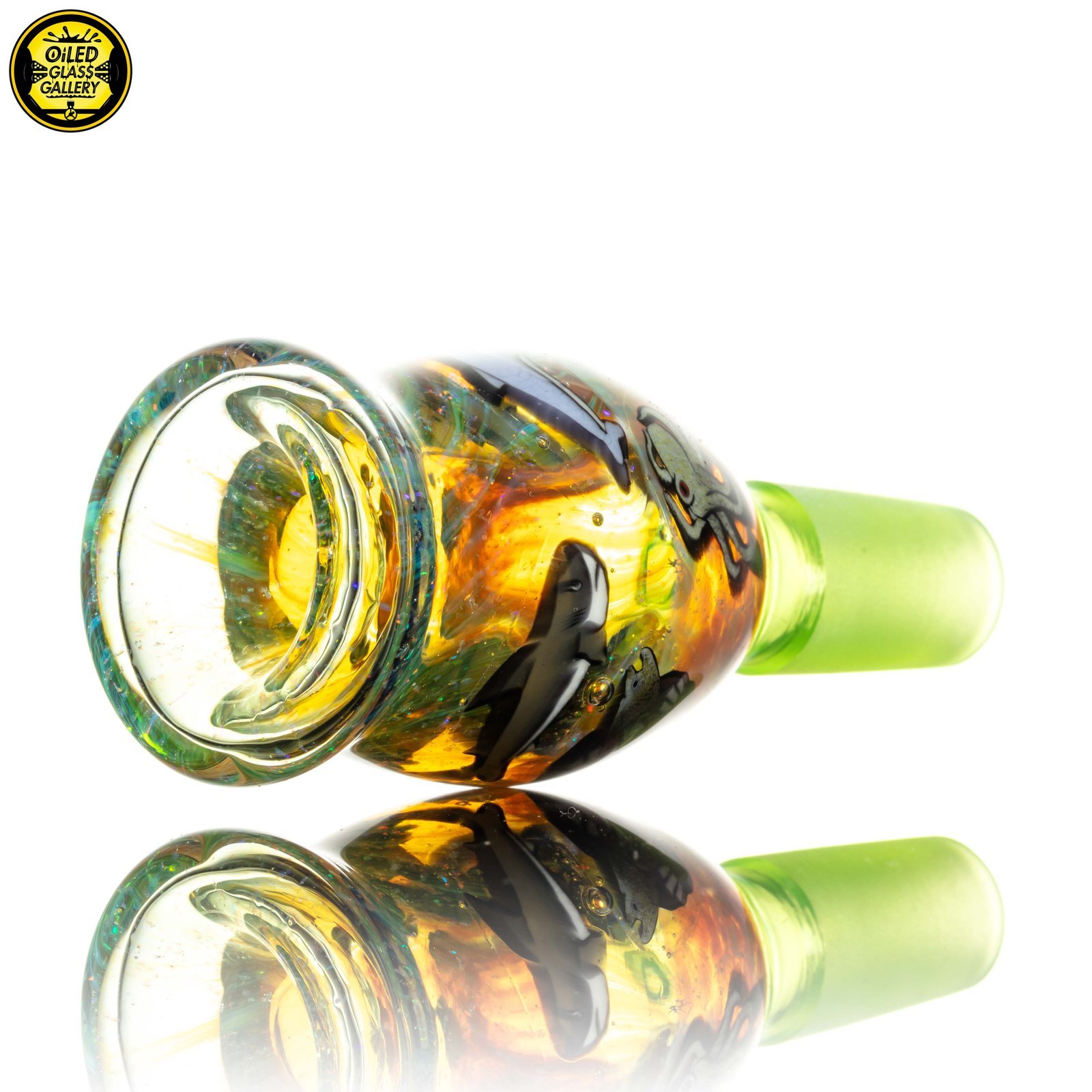 2023 14mm Marine Life Millefiori 1-hole Slide made of Trautman Art Glass Tropical Green with crushed opal featuring nine encased millefiori.
