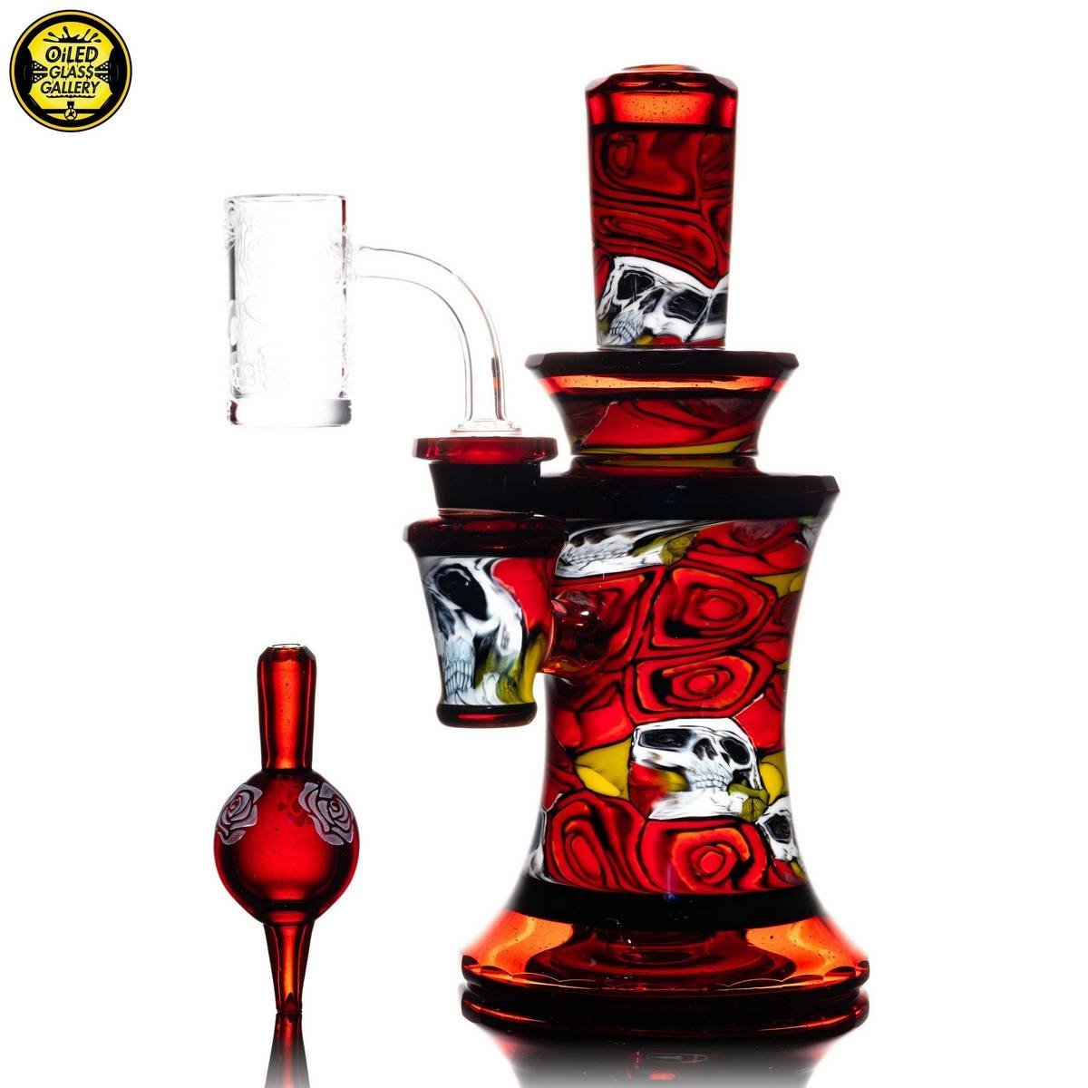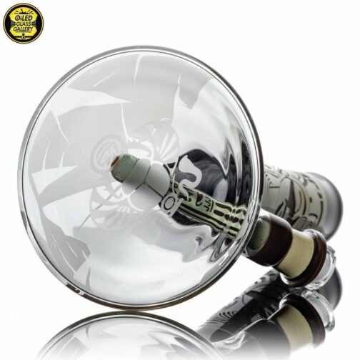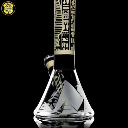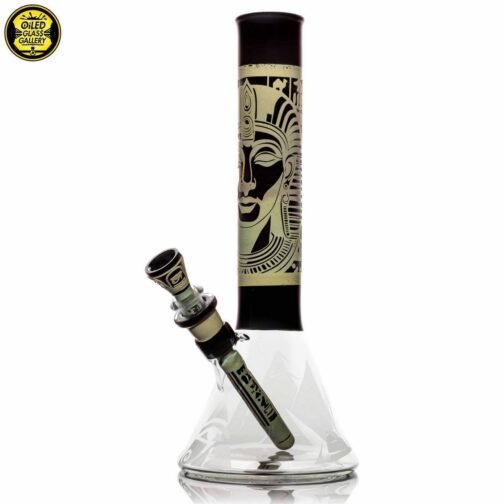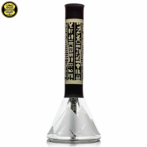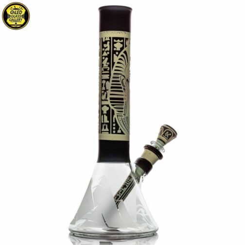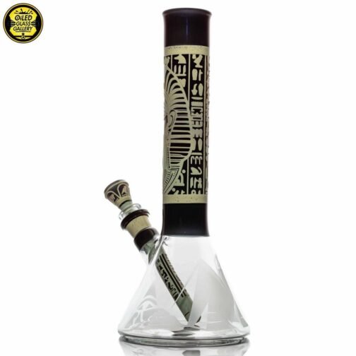 2023 14mm 12.75in “Pharaoh” Carved Beaker tube made of a Northstar Glass Caramel and Northstar Glass Grizzly. Features multiple layers of deep carvings into the glass along the neck of a Pharaoh and Hieroglyphic symbols with a sandblasted bottom. Comes with a matching 14mm fully carved slide, a 2-slit carved stem and comes shipped in a hard case.