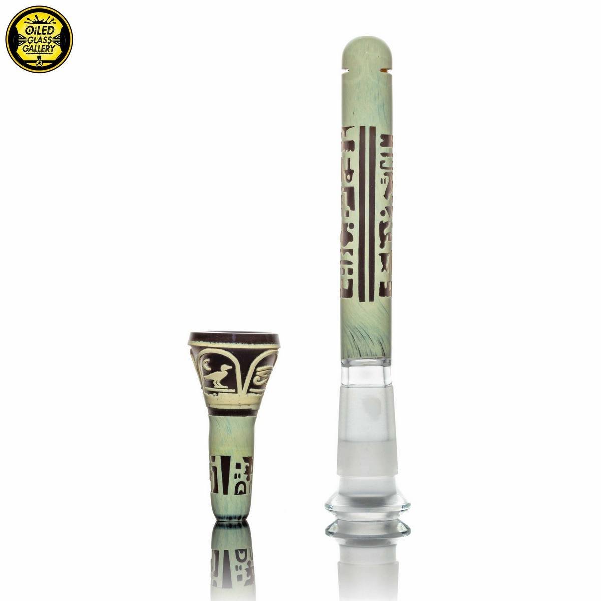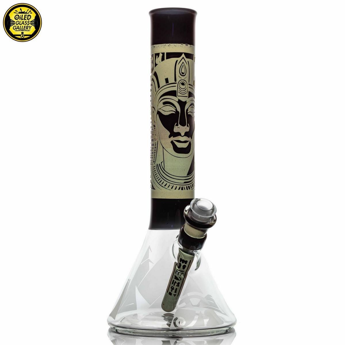 2023 14mm 12.75in “Pharaoh” Carved Beaker tube made of a Northstar Glass Caramel and Northstar Glass Grizzly. Features multiple layers of deep carvings into the glass along the neck of a Pharaoh and Hieroglyphic symbols with a sandblasted bottom. Comes with a matching 14mm fully carved slide, a 2-slit carved stem and comes shipped in a hard case.