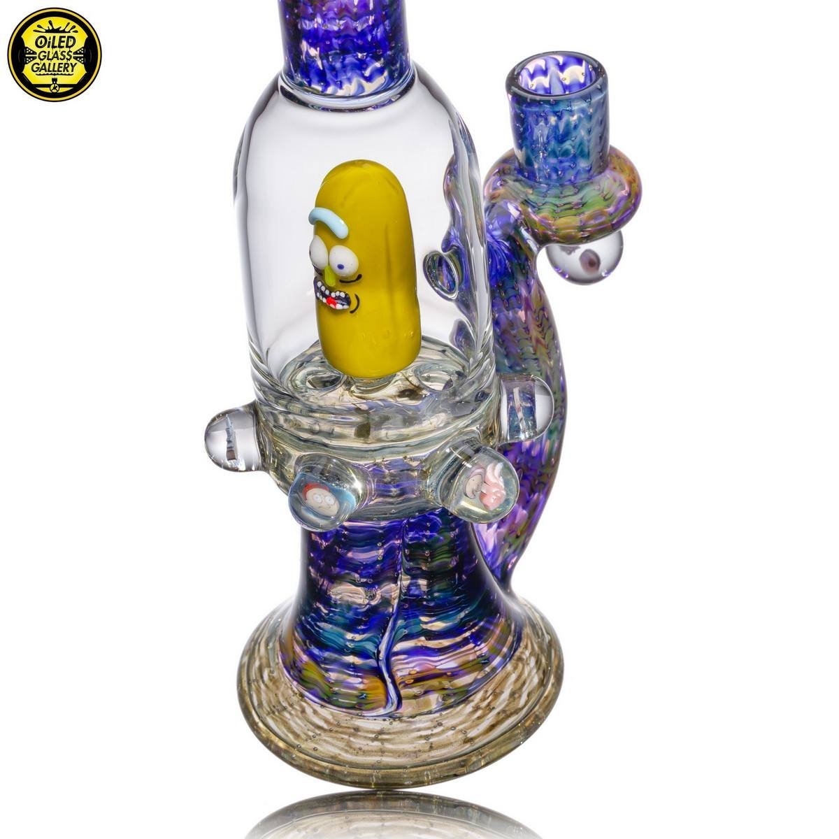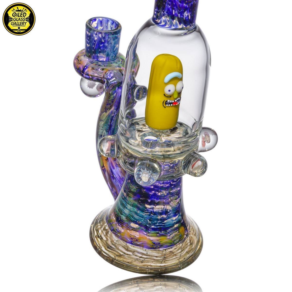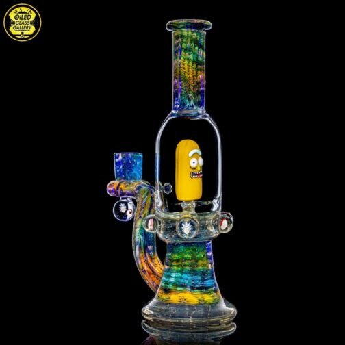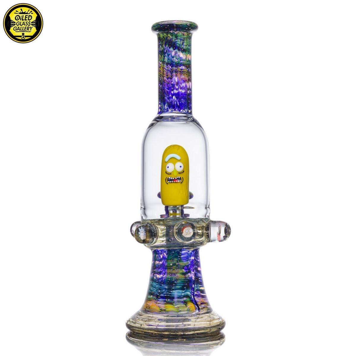2018 14mm 8in Pickle Rick Banger Hanger Blooper Tube made of wrap and rake fume sections. Features six Rick & Morty encased millefiori mibs mounted around tube, under the joint and comes shipped in a Pelican case.
