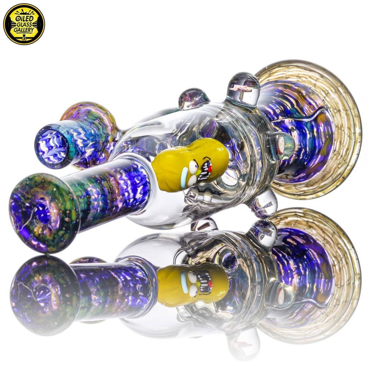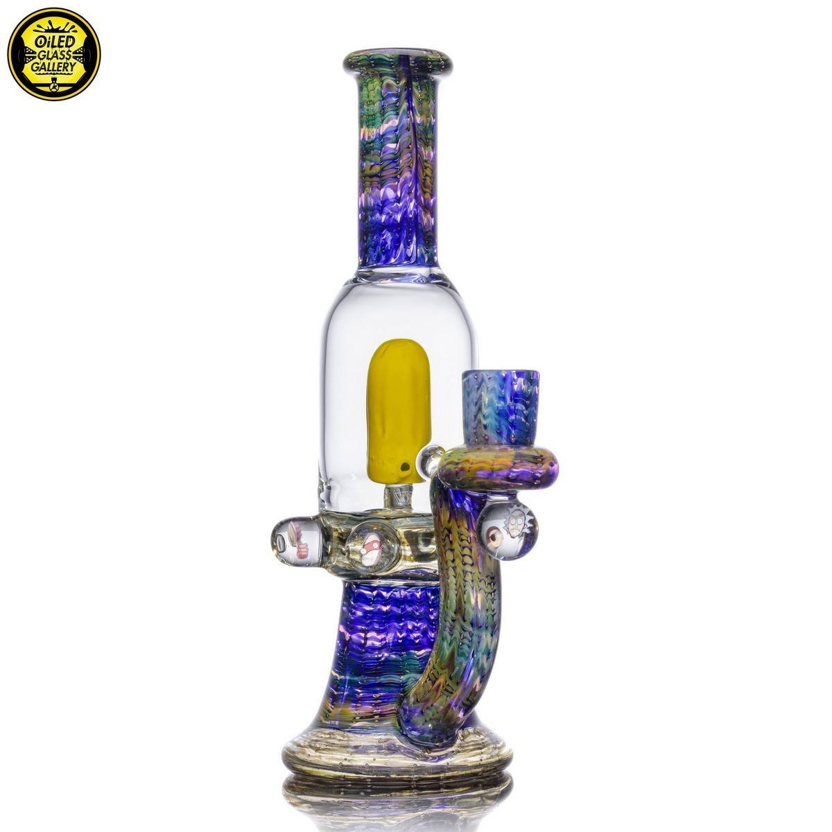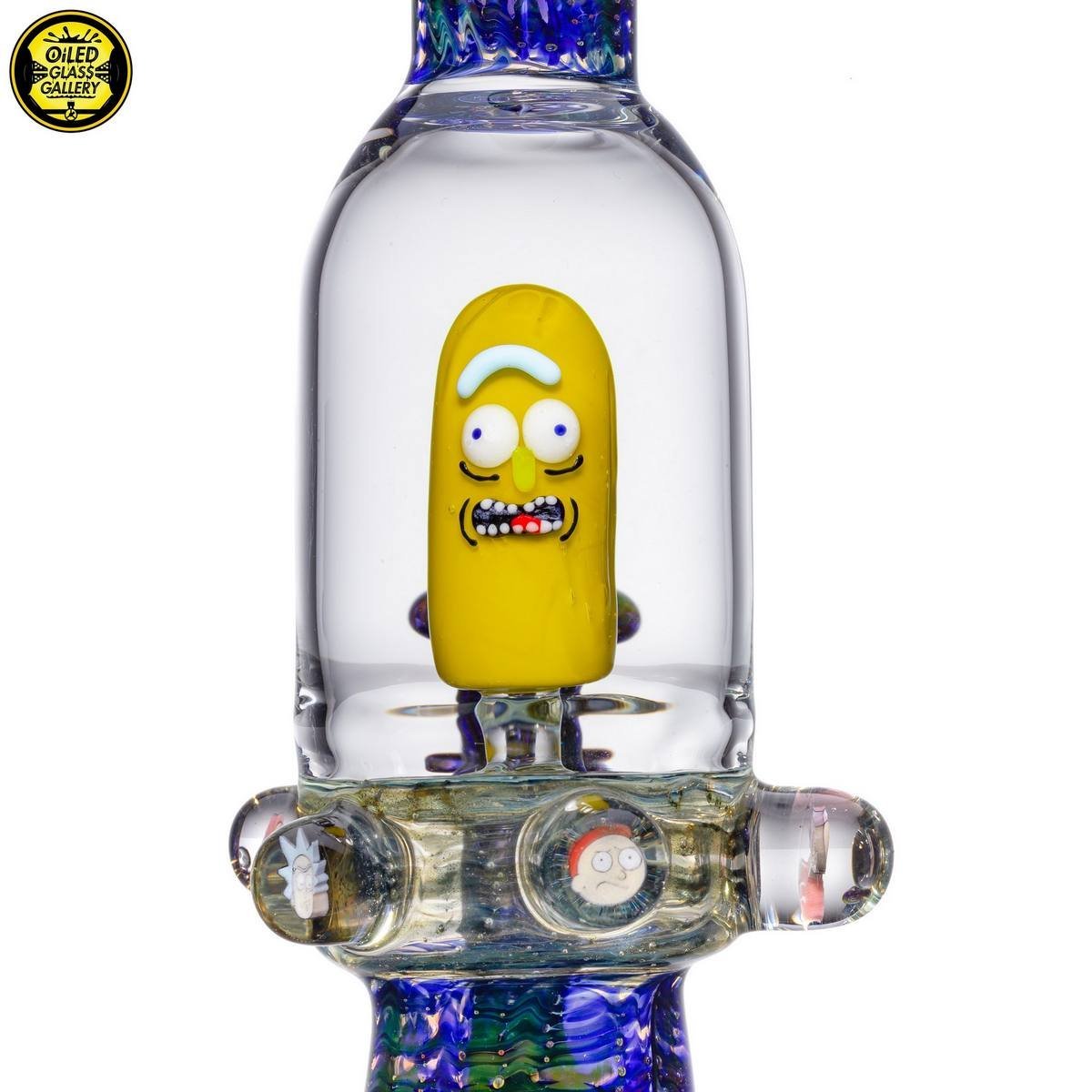 2018 14mm 8in Pickle Rick Banger Hanger Blooper Tube made of wrap and rake fume sections. Features six Rick & Morty encased millefiori mibs mounted around tube, under the joint and comes shipped in a Pelican case.