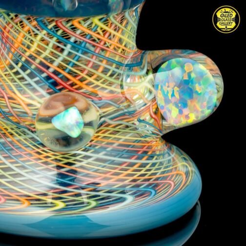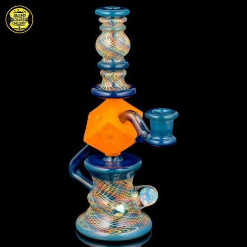 2018 14mm 8.5in Rainbow Retticello Tesseract Set made of Venetian Blue Slyme and Sunset Orange. This set comes with matching Q-tip jar, a pendant, a terp spinner cap, and is shipped in an Orange Pelican 1400 case.