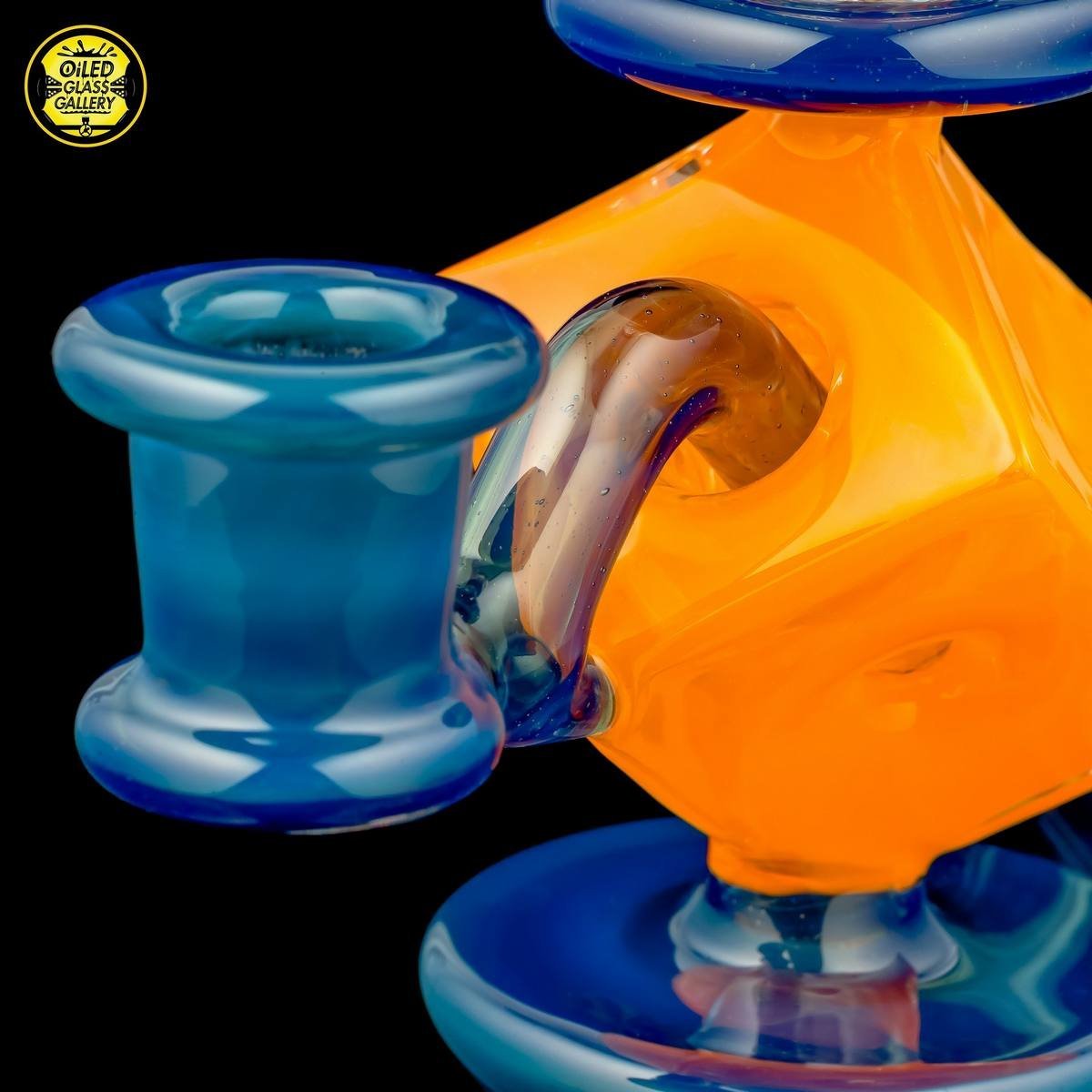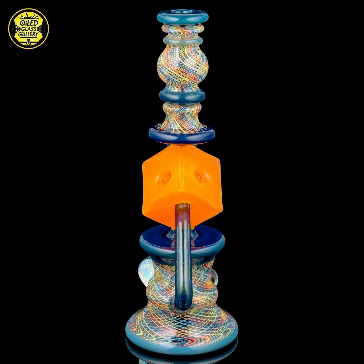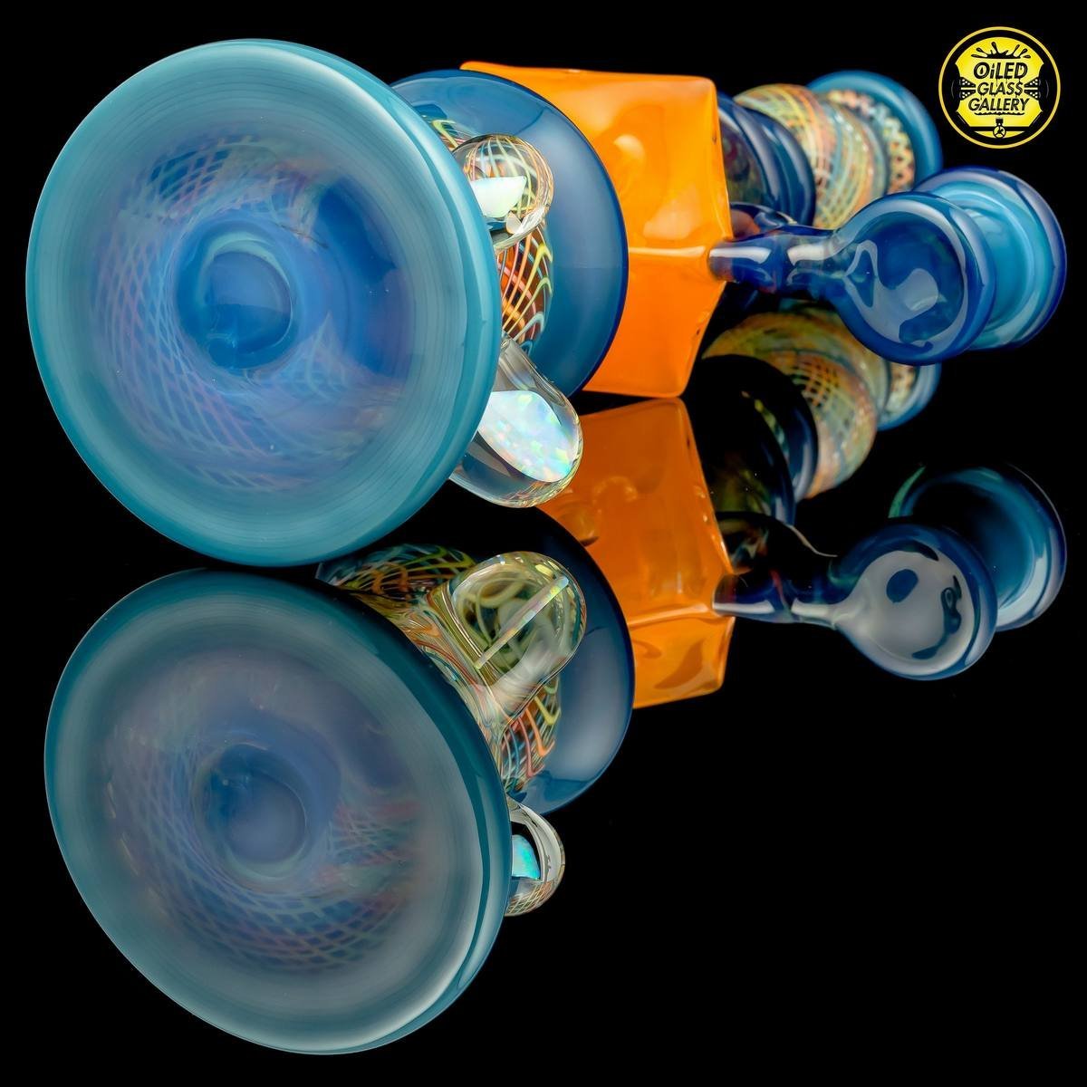 2018 14mm 8.5in Rainbow Retticello Tesseract Set made of Venetian Blue Slyme and Sunset Orange. This set comes with matching Q-tip jar, a pendant, a terp spinner cap, and is shipped in an Orange Pelican 1400 case.