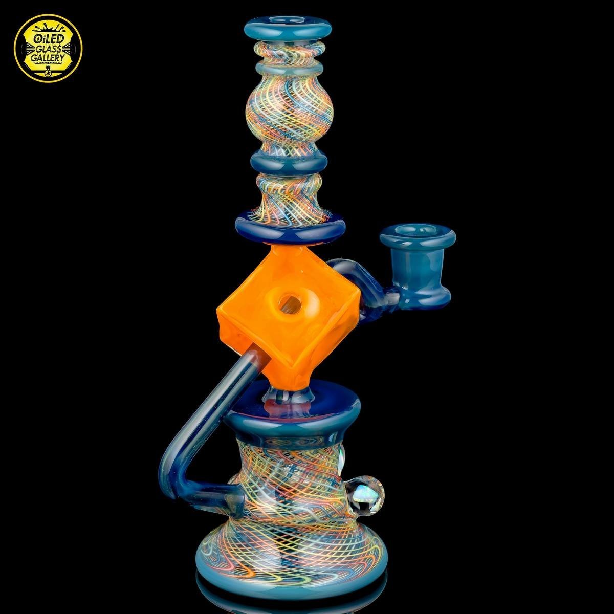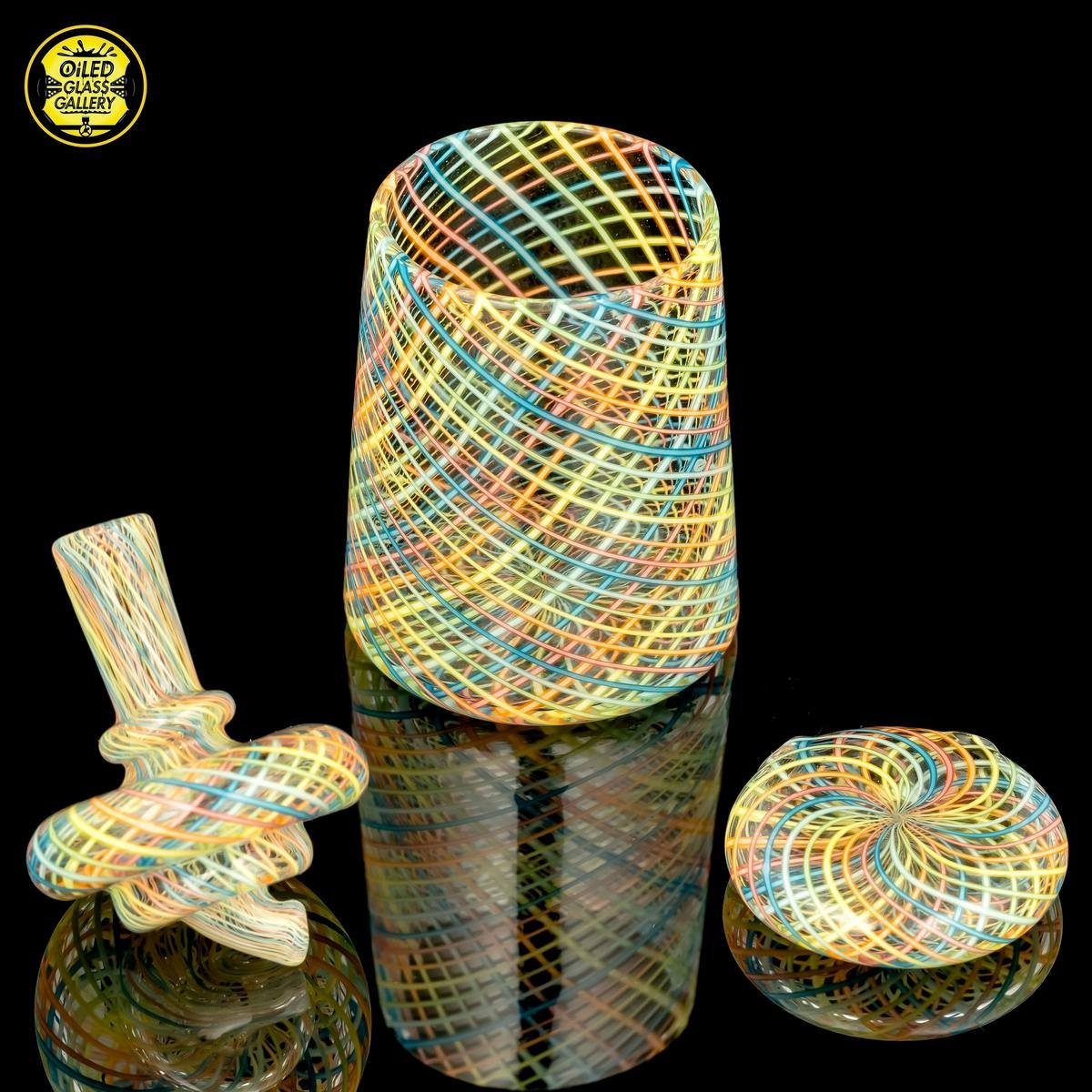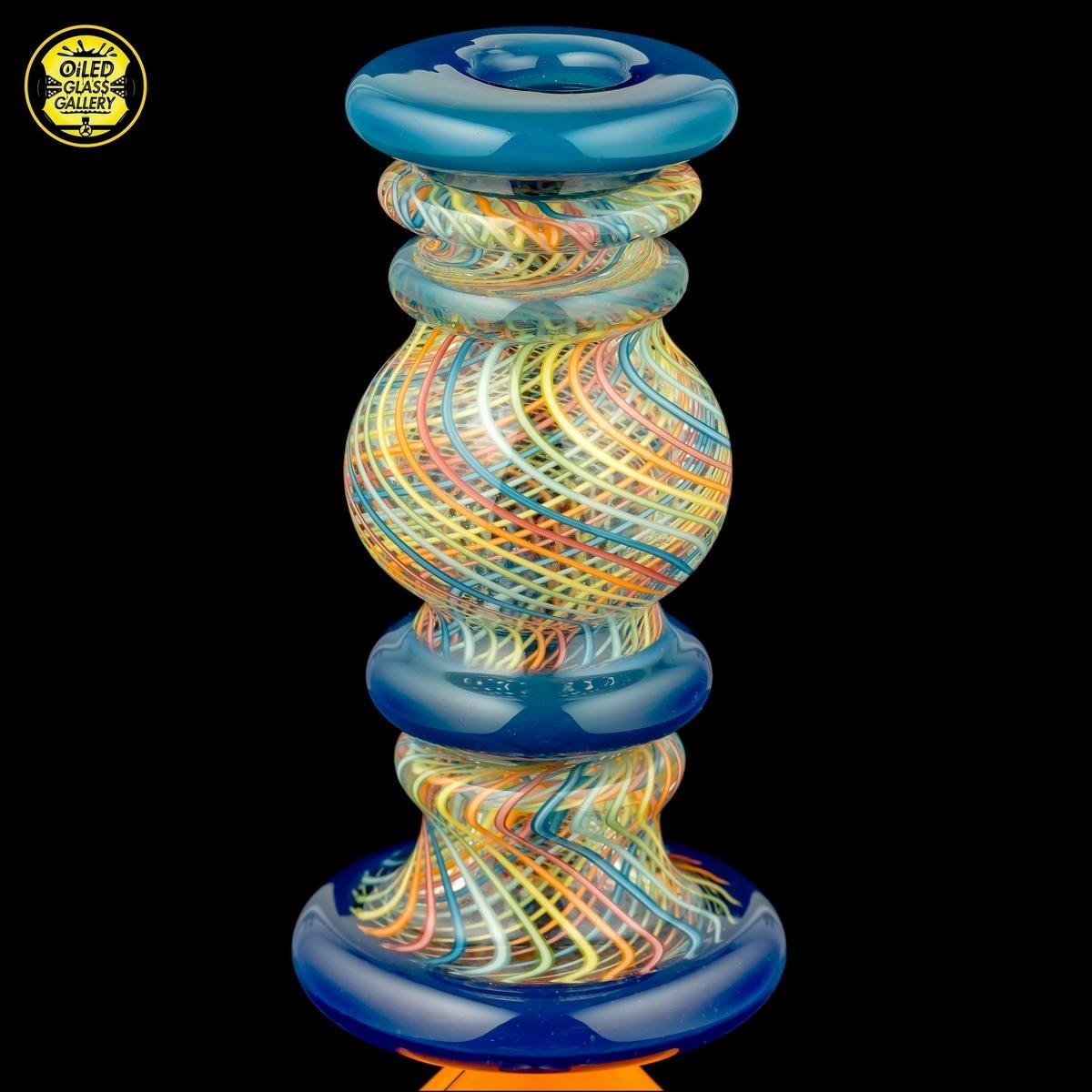 2018 14mm 8.5in Rainbow Retticello Tesseract Set made of Venetian Blue Slyme and Sunset Orange. This set comes with matching Q-tip jar, a pendant, a terp spinner cap, and is shipped in an Orange Pelican 1400 case.