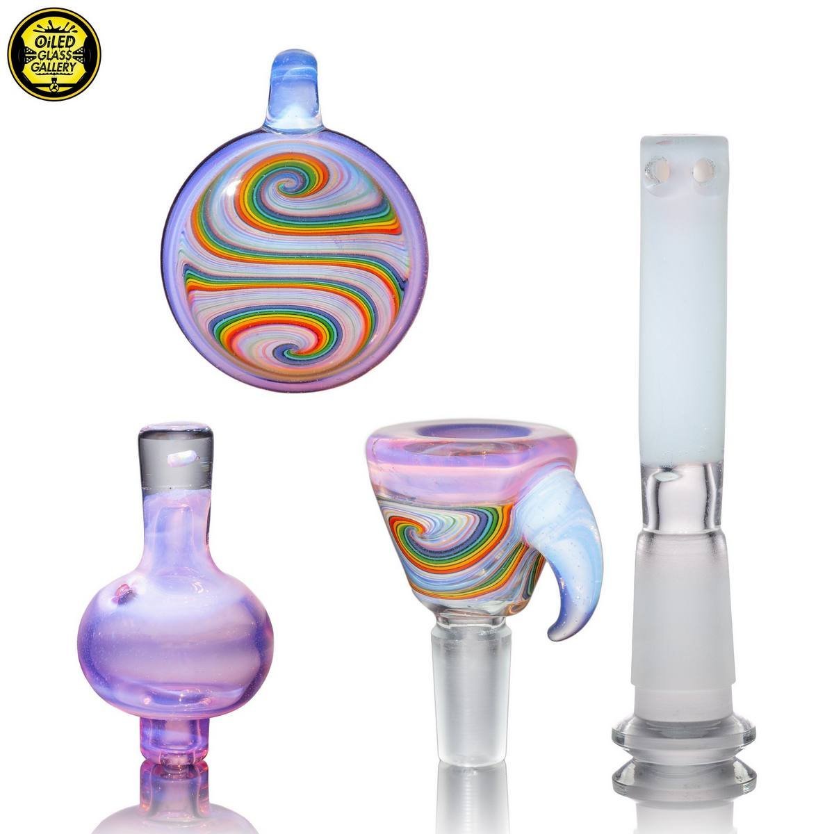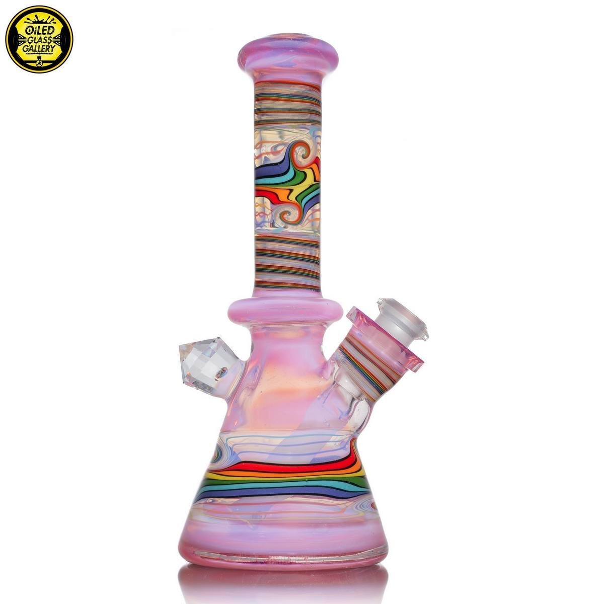 2021 14mm 10.25in Rainbow Wig Wag Beaker Tube made of Northstar Glass Karmaline with Rainbow wig wags. Features a faceted joint and an opal encased faceted mib on the back. Comes with a Northstar Glass Ghost removable 2-hole downstem, a slide, a bubble cap, a pendant, and shipped in a Black Pelican iM2050 case.