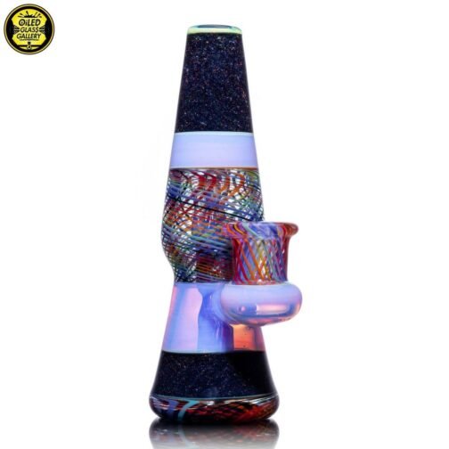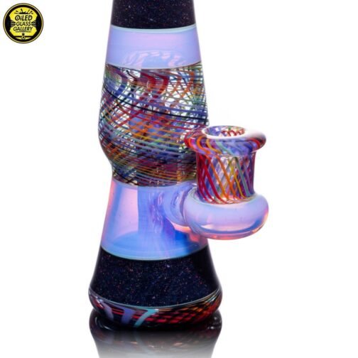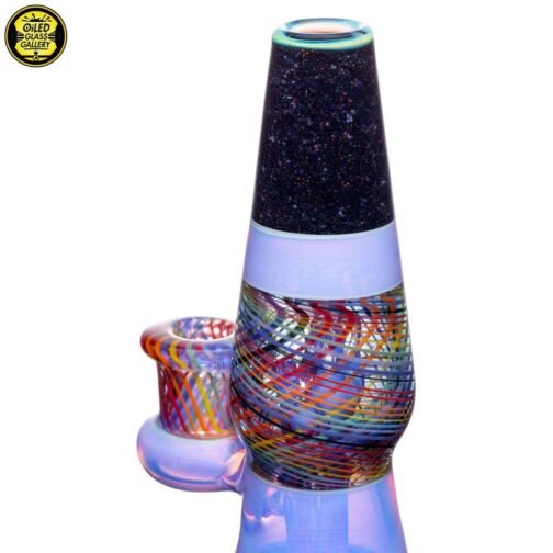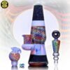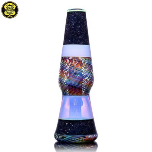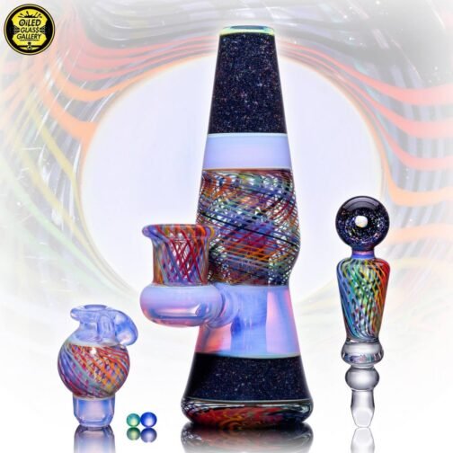 2021 14mm 6.5in Retticello Crushed Opal Cone Lamp Tube set made of Trautman Art Glass Blue Stardust and Rainbow retticello, Trautman Art Glass Slyme lipwraps, Northstar Glass Lucid, and Northstar Glass Galaxy with crushed opal. This set comes with a matching marble set, a spinner bubble cap, a dabber and shipped in a hard case.