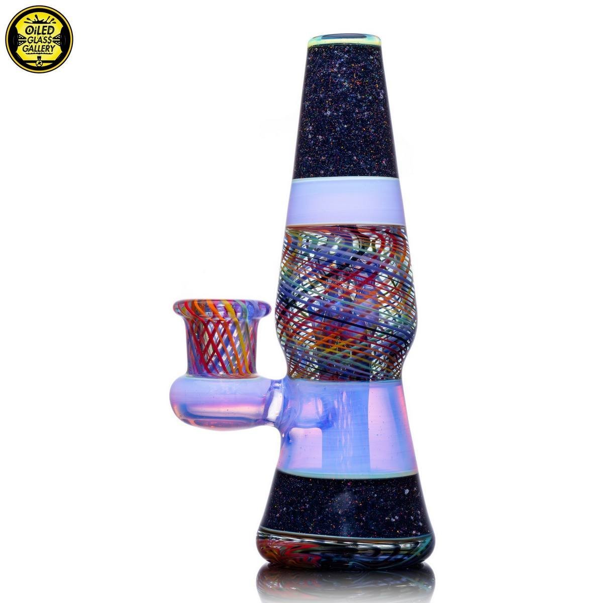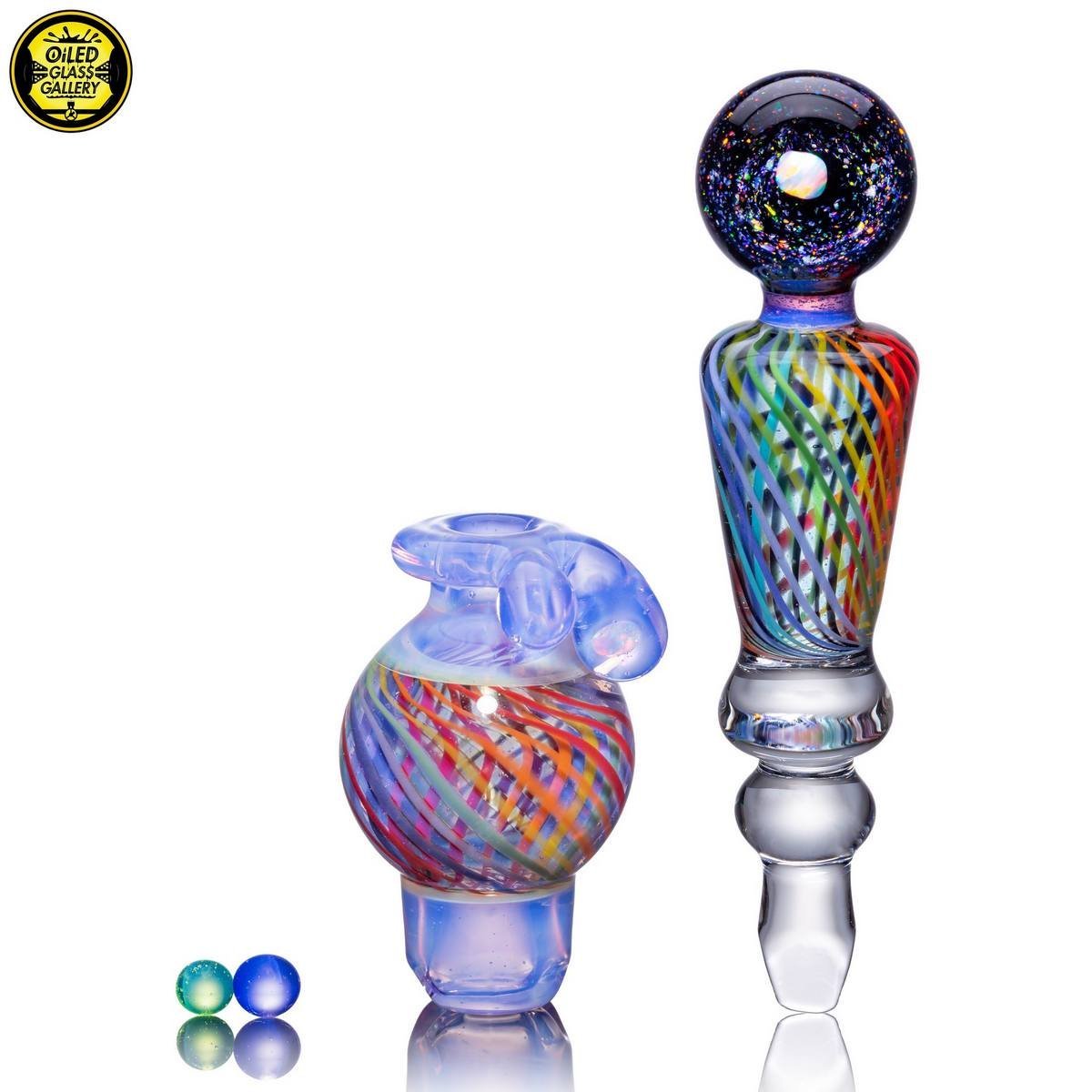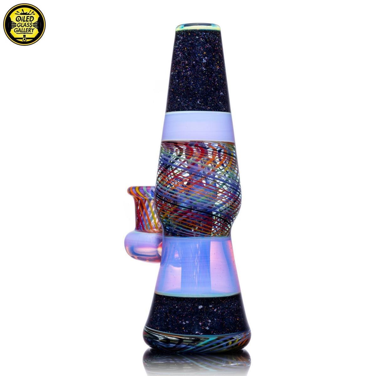 2021 14mm 6.5in Retticello Crushed Opal Cone Lamp Tube set made of Trautman Art Glass Blue Stardust and Rainbow retticello, Trautman Art Glass Slyme lipwraps, Northstar Glass Lucid, and Northstar Glass Galaxy with crushed opal. This set comes with a matching marble set, a spinner bubble cap, a dabber and shipped in a hard case.