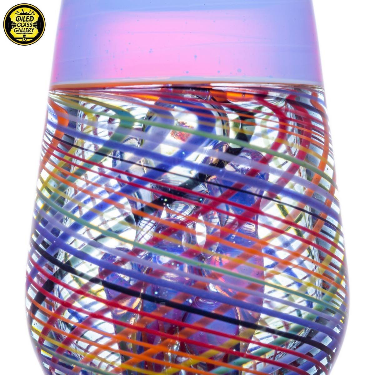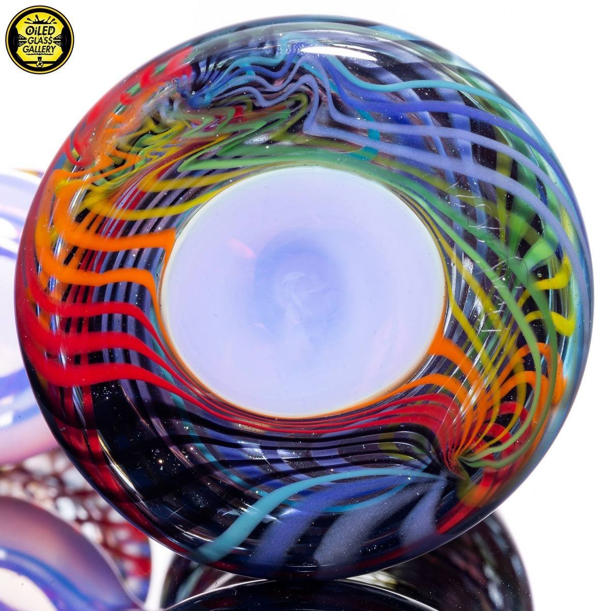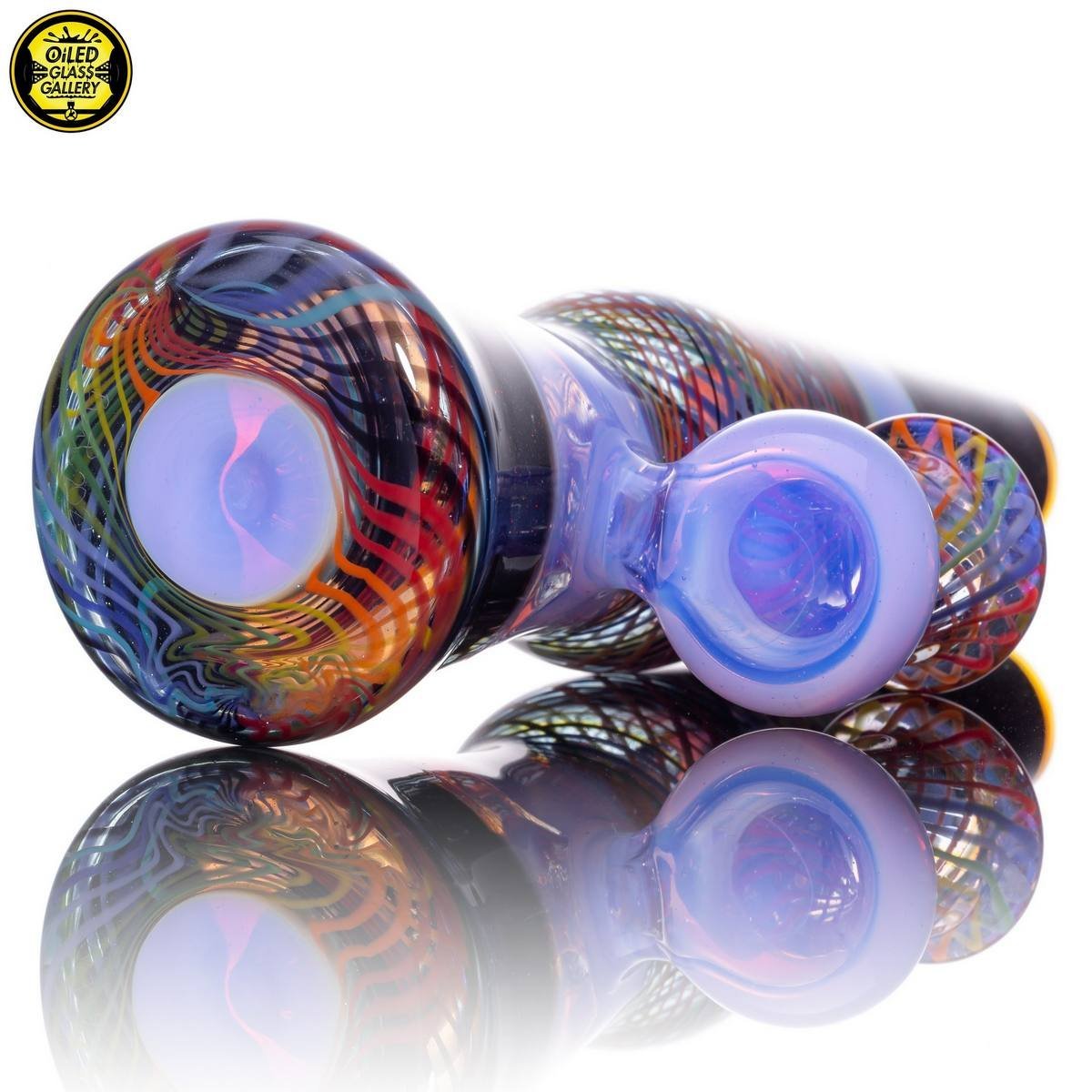 2021 14mm 6.5in Retticello Crushed Opal Cone Lamp Tube set made of Trautman Art Glass Blue Stardust and Rainbow retticello, Trautman Art Glass Slyme lipwraps, Northstar Glass Lucid, and Northstar Glass Galaxy with crushed opal. This set comes with a matching marble set, a spinner bubble cap, a dabber and shipped in a hard case.