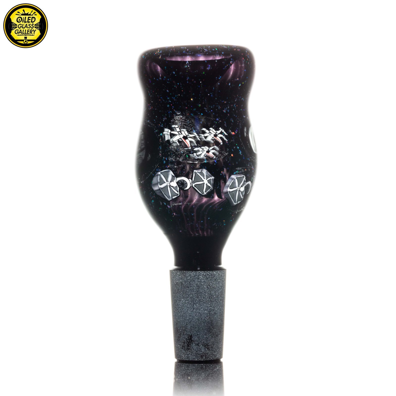 2023 14mm Star Wars Millefiori 1-hole Slide made of all Northstar Glass Jet Black with crushed opal featuring 13 encased X-Wing, Tie-Bomber, Deathstar and Moon millefiori.