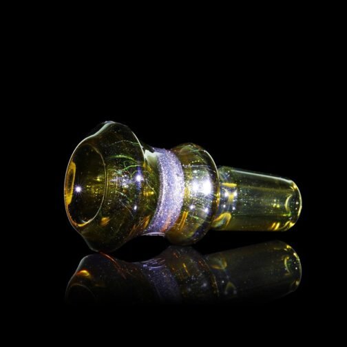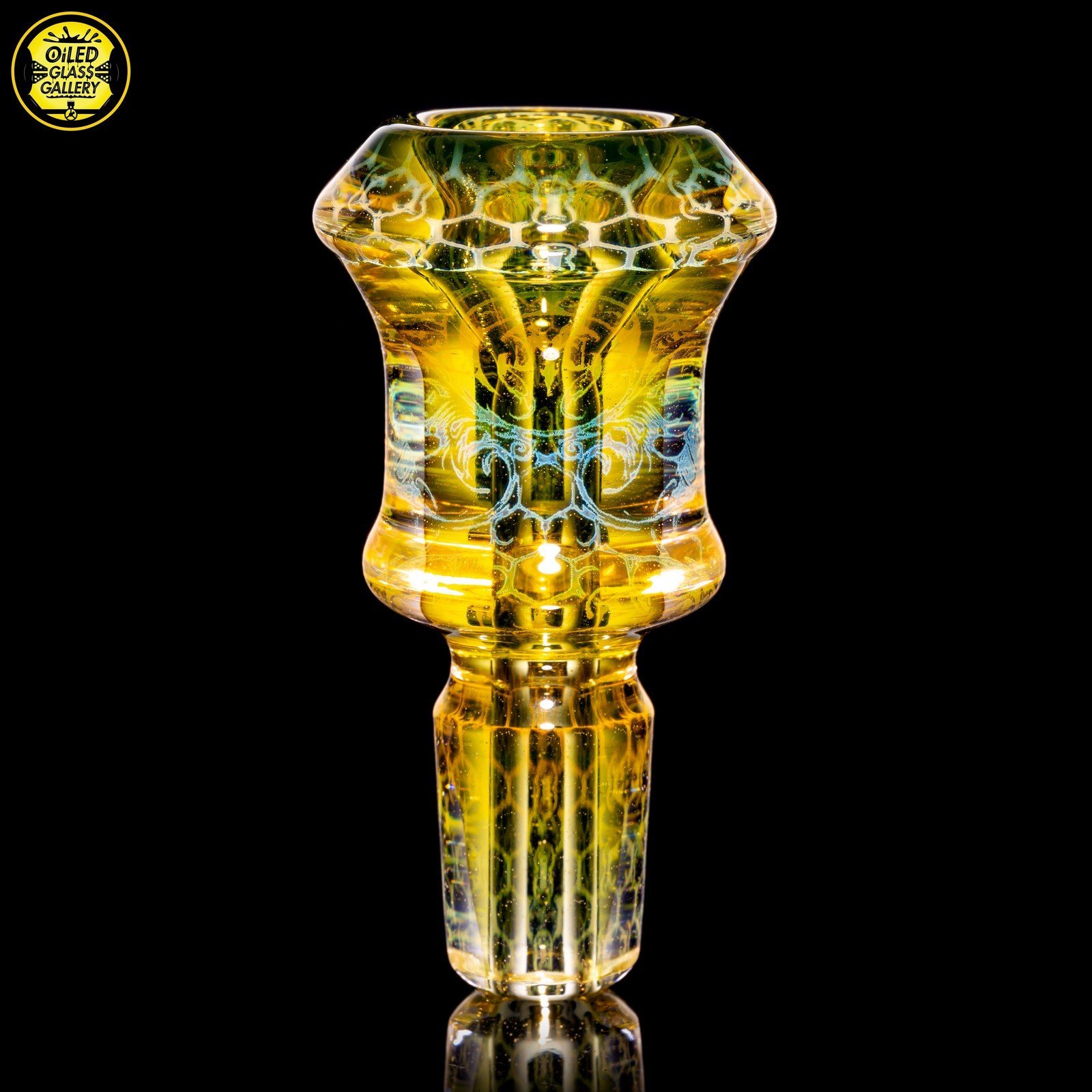 2021 14mm “Temple” Sandblasted 1-hole Slide made of Glass Alchemy Tiger’s Eye with a Northstar Glass Steel Wool band.