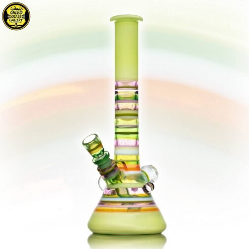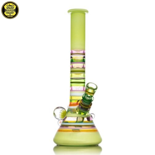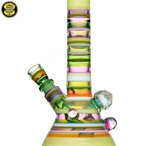 2021 14mm 11.25in UV Encalmo Beaker tube made of Greasy Glass Lime over UV Satin, Greasy Glass Rose Quartz, Northstar Glass Timber, and Greasy Glass Euro White tubing. Features a huge faceted dichroic mib, a large dot implosion mib, an encased opal mib, and an encased millefiori mib. Comes with a matching removable 3-hole downstem and 1-hole slide.