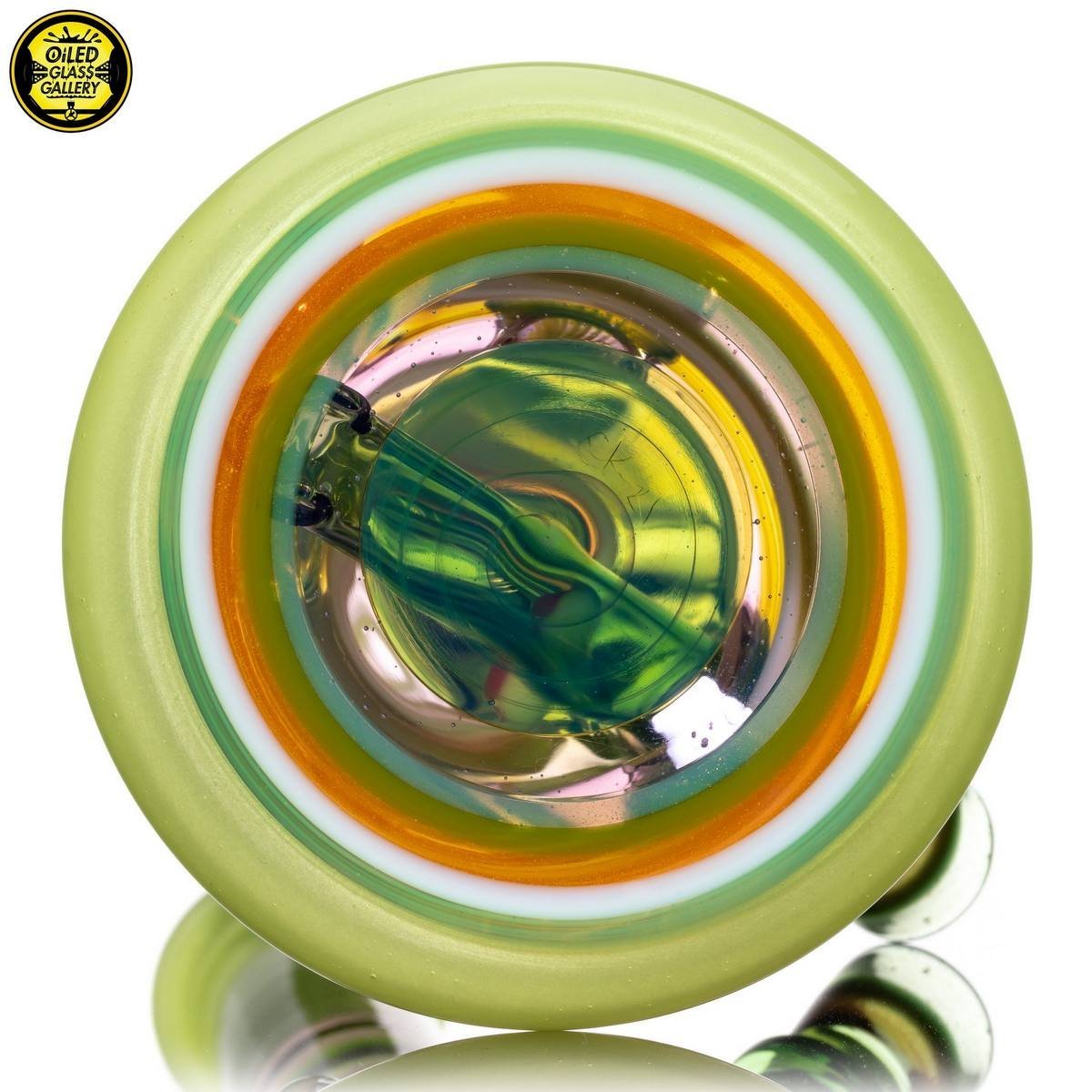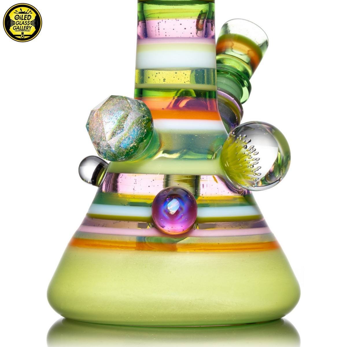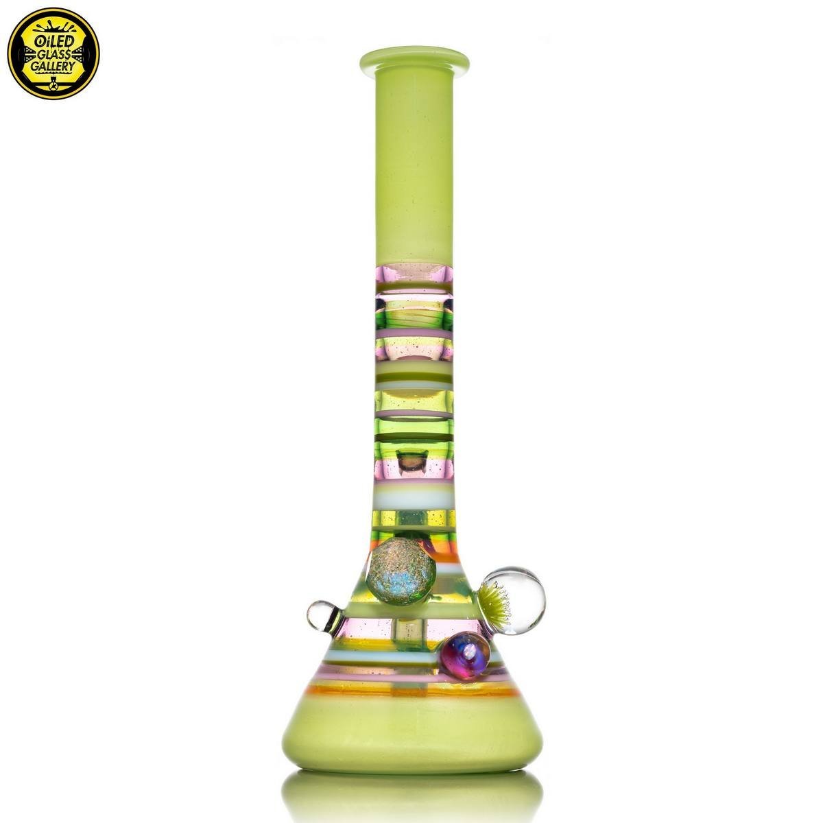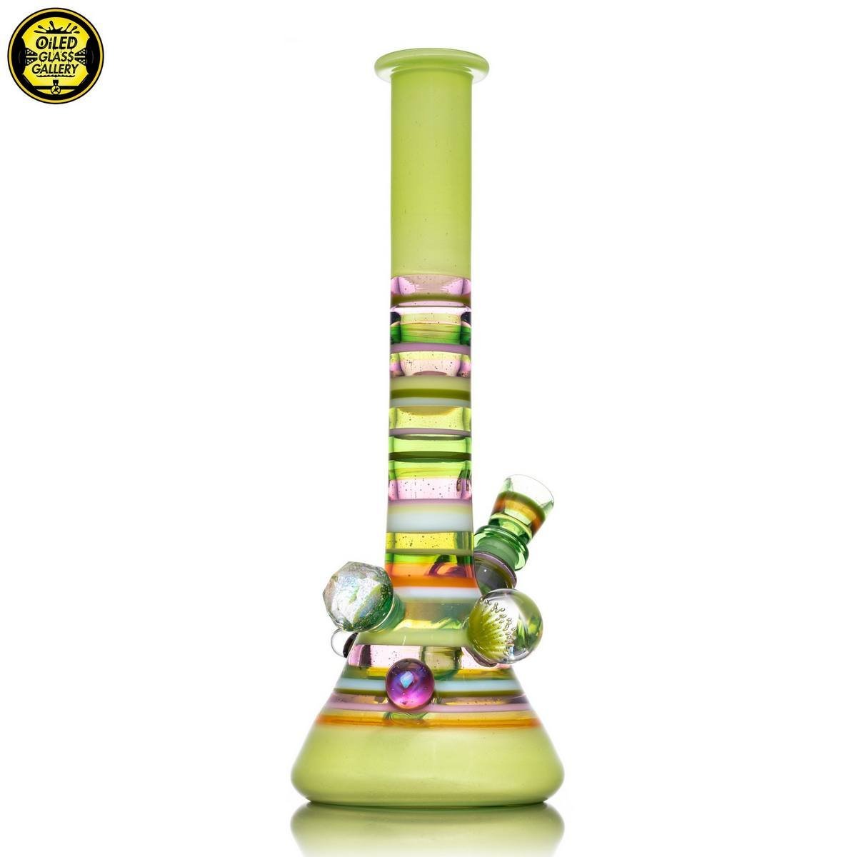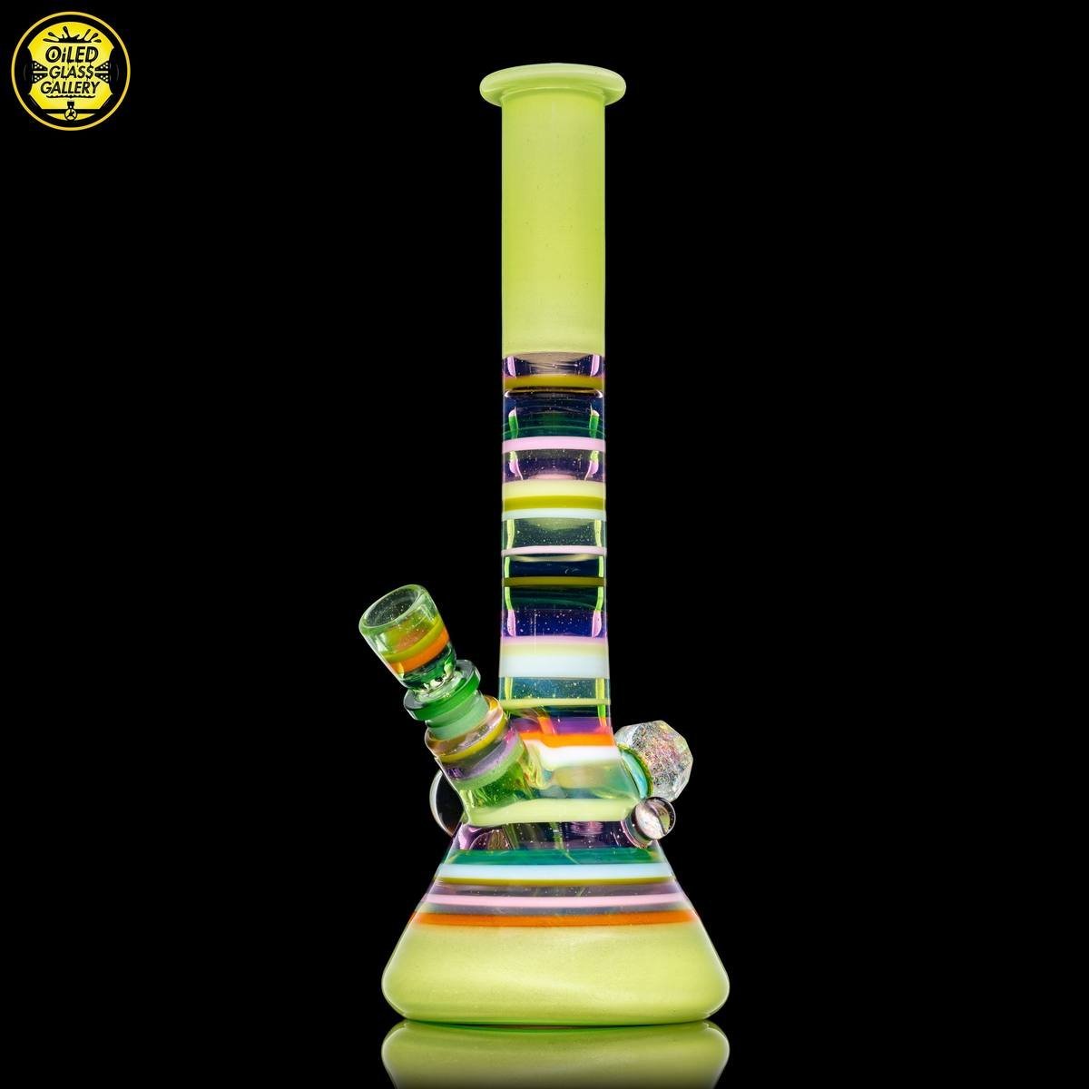 2021 14mm 11.25in UV Encalmo Beaker tube made of Greasy Glass Lime over UV Satin, Greasy Glass Rose Quartz, Northstar Glass Timber, and Greasy Glass Euro White tubing. Features a huge faceted dichroic mib, a large dot implosion mib, an encased opal mib, and an encased millefiori mib. Comes with a matching removable 3-hole downstem and 1-hole slide.