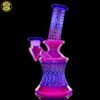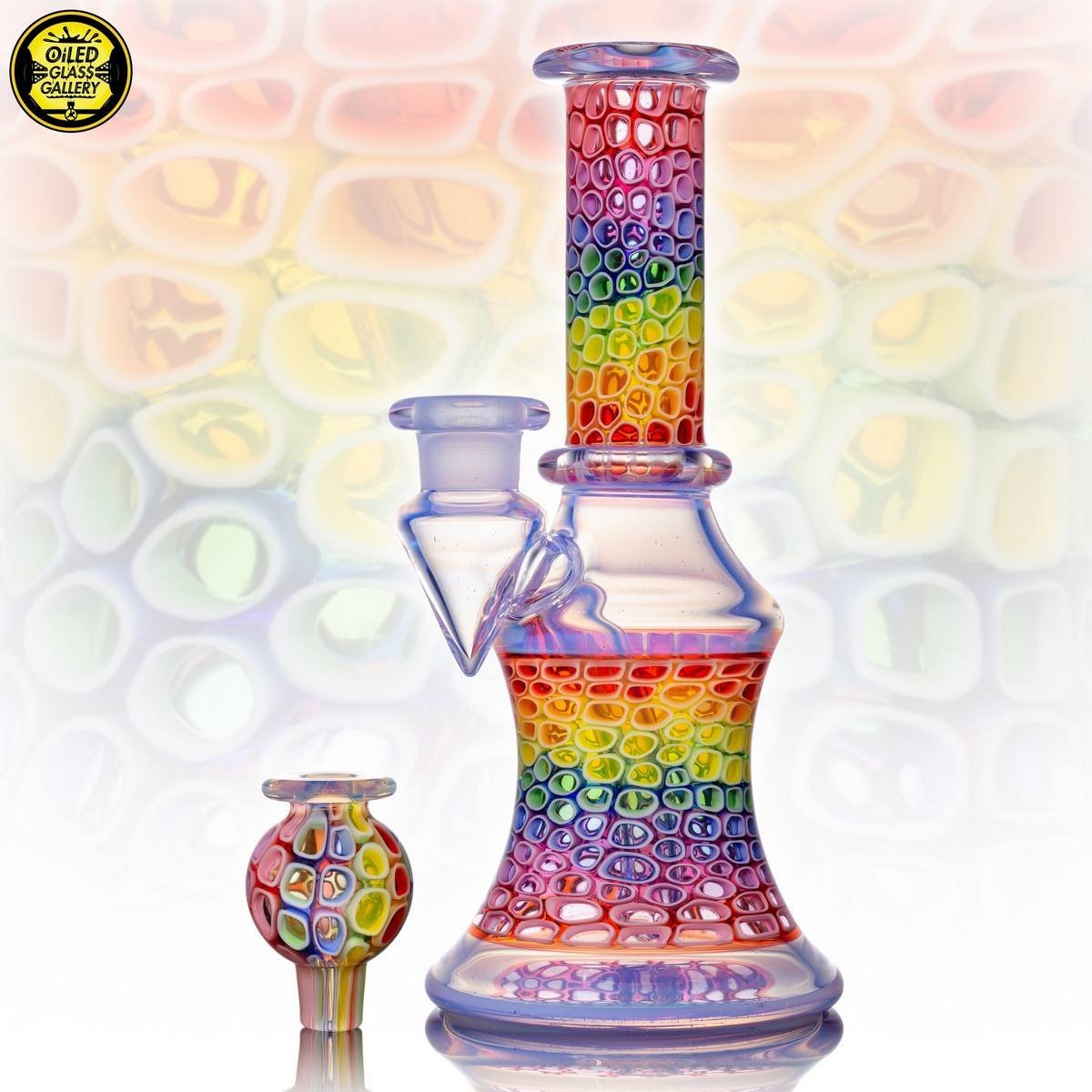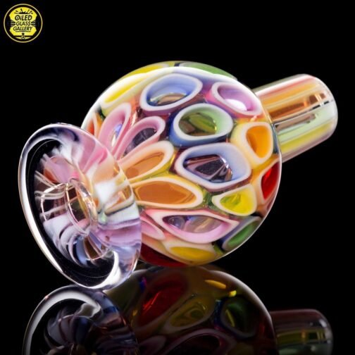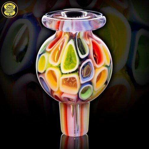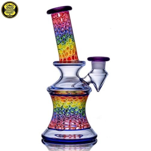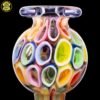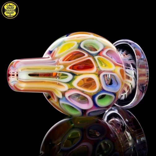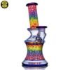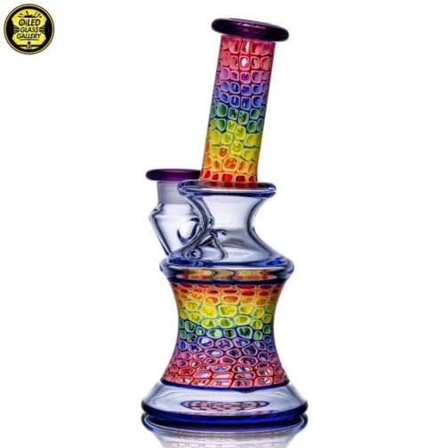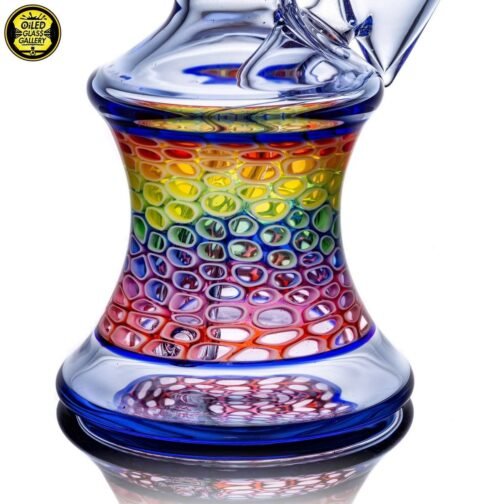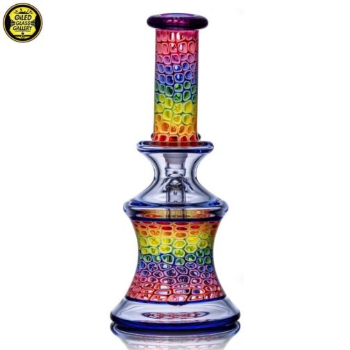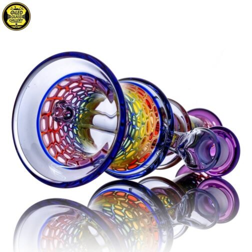 2020 14mm 7.5in UV Rainbow Mosaic Millefiori Kickback Banger Hanger Tube set from the “Poking Holes in Rainbows” series made of Glass Alchemy UV Blue Dreamingo Lite, Molten Aura Gold Amethyst, and Glass Alchemy Brilliant Blue Lipwraps. This is the first in series to feature a kickback neck. The millefiori chips were pulled out with clear centers, assorted, and rolled into beautiful tubing. The colors used for the millefiori chips are Gold Ruby, Gold Amethyst, Brilliant Blue, Portland Green, Citron, Thomas Orange, and Pomegranate. This piece comes with a matching bubble cap and is shipped in a Pelican case.