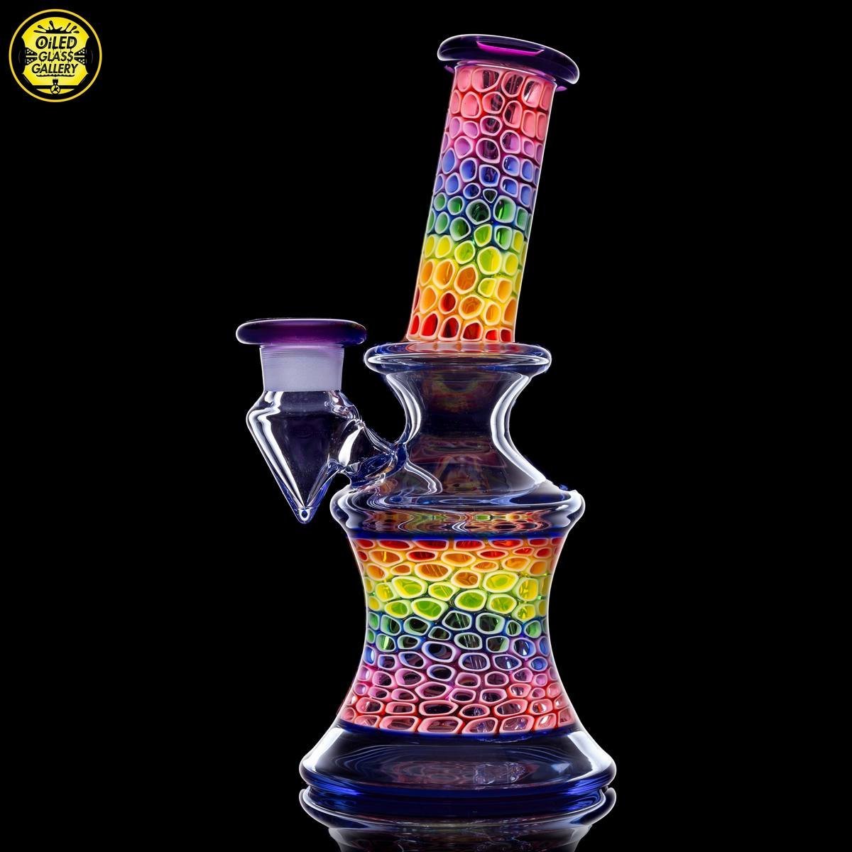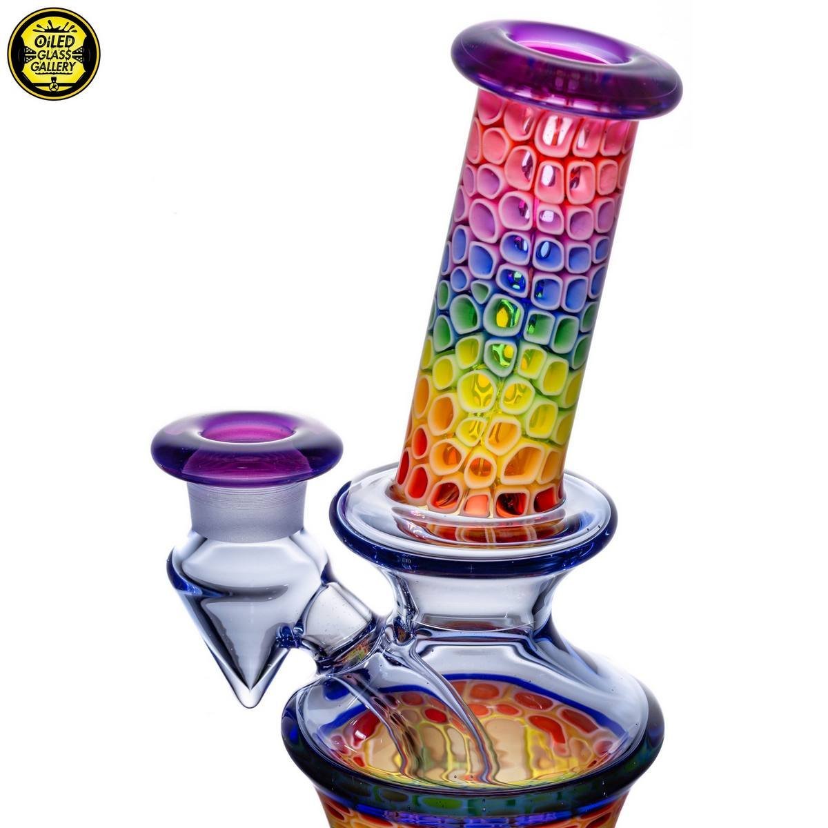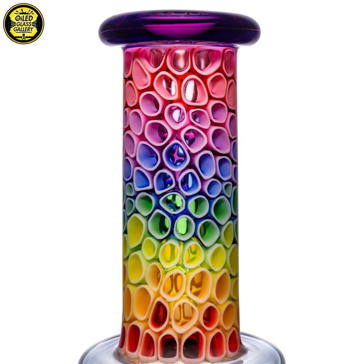 2020 14mm 7.5in UV Rainbow Mosaic Millefiori Kickback Banger Hanger Tube set from the “Poking Holes in Rainbows” series made of Glass Alchemy UV Blue Dreamingo Lite, Molten Aura Gold Amethyst, and Glass Alchemy Brilliant Blue Lipwraps. This is the first in series to feature a kickback neck. The millefiori chips were pulled out with clear centers, assorted, and rolled into beautiful tubing. The colors used for the millefiori chips are Gold Ruby, Gold Amethyst, Brilliant Blue, Portland Green, Citron, Thomas Orange, and Pomegranate. This piece comes with a matching bubble cap and is shipped in a Pelican case.