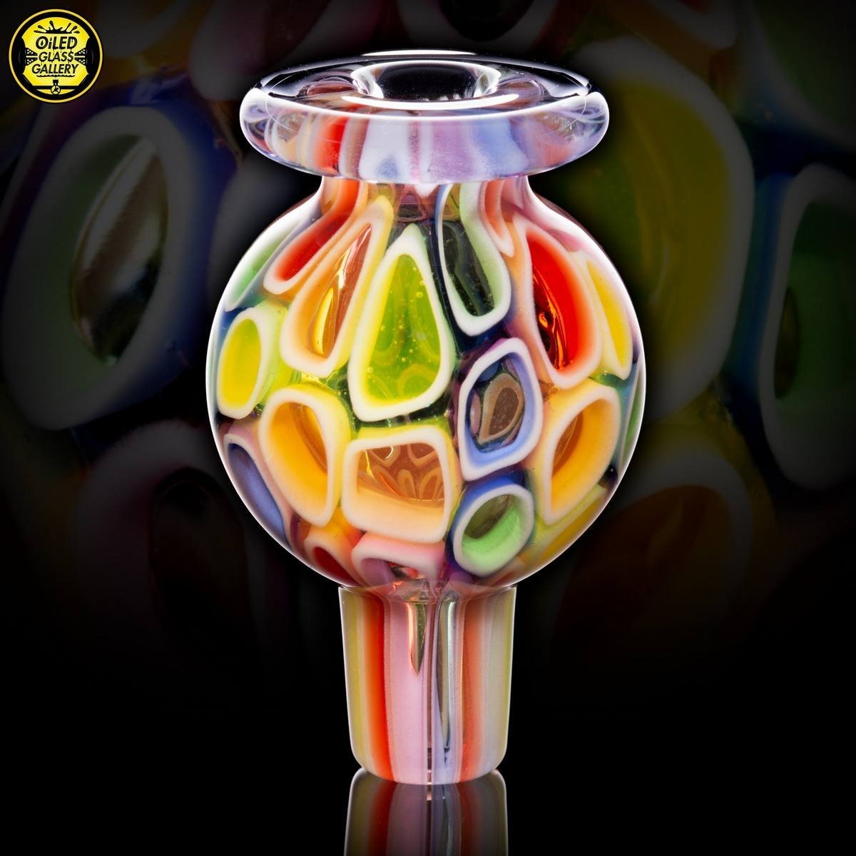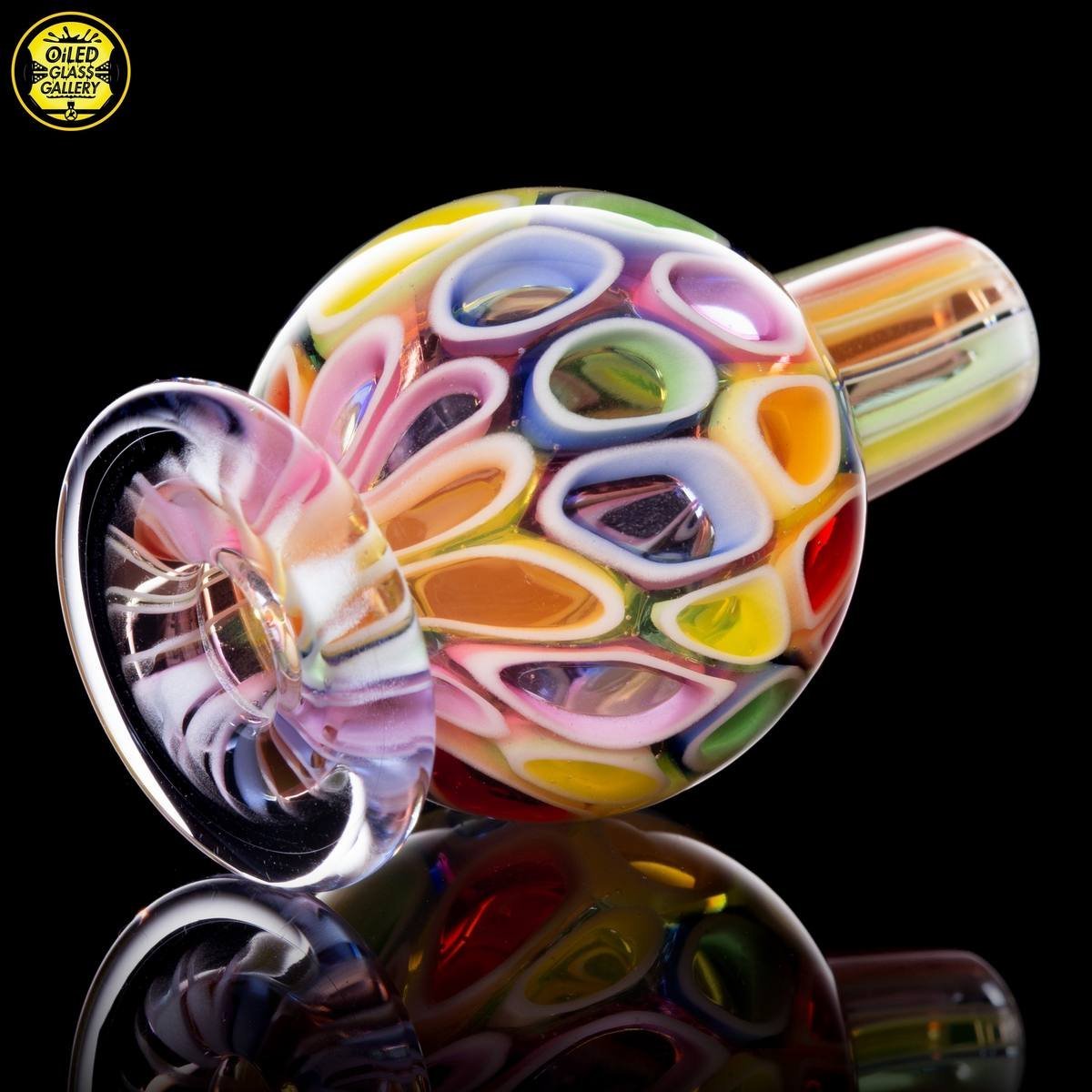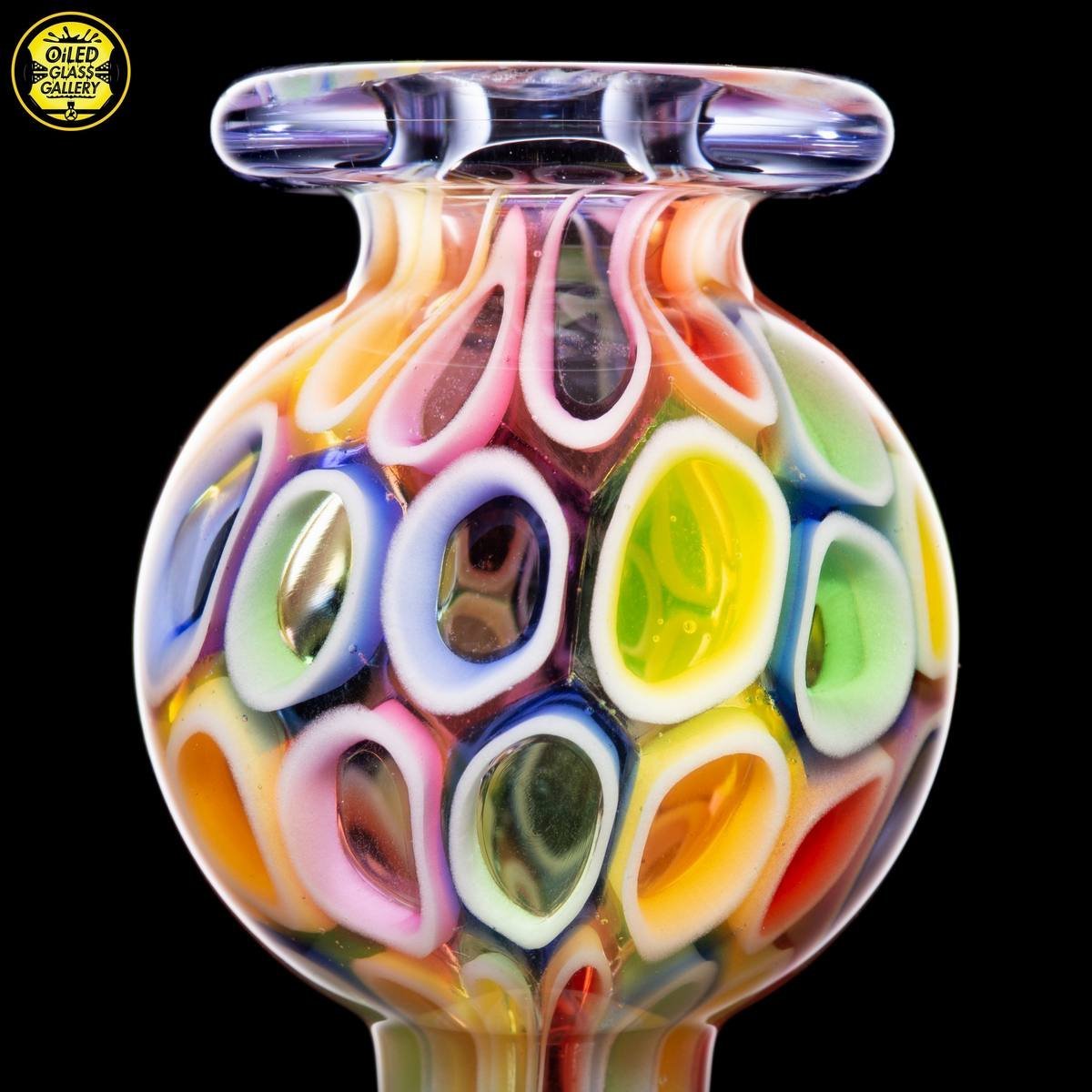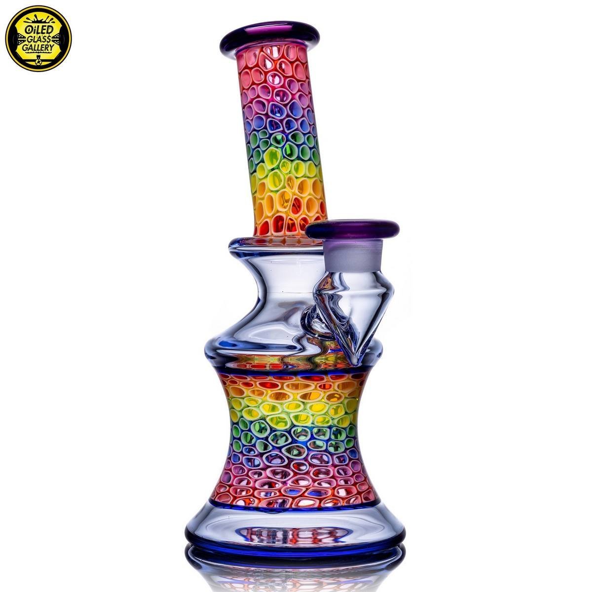 2020 14mm 7.5in UV Rainbow Mosaic Millefiori Kickback Banger Hanger Tube set from the “Poking Holes in Rainbows” series made of Glass Alchemy UV Blue Dreamingo Lite, Molten Aura Gold Amethyst, and Glass Alchemy Brilliant Blue Lipwraps. This is the first in series to feature a kickback neck. The millefiori chips were pulled out with clear centers, assorted, and rolled into beautiful tubing. The colors used for the millefiori chips are Gold Ruby, Gold Amethyst, Brilliant Blue, Portland Green, Citron, Thomas Orange, and Pomegranate. This piece comes with a matching bubble cap and is shipped in a Pelican case.