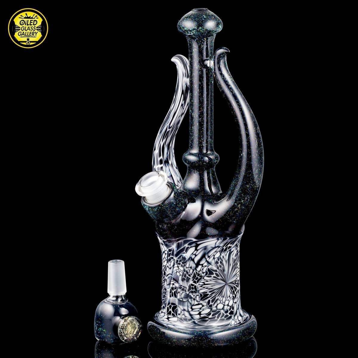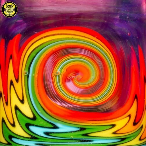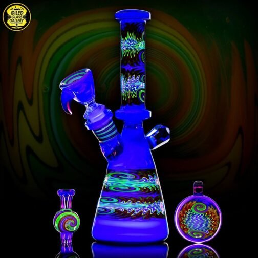 2021 14mm 10.25in UV Rainbow Wig Wag Beaker Tube Set made of Northstar Glass Star Gazer & Molten Aura Royal Jelly with Rainbow and UV wig wags. Features a faceted mouthpiece, neck, joint, and an opal encased faceted mib on the back. Comes with a matching slide, a removable 2-hole downstem, a bubble cap, a pendant, and shipped in a Dark Green Pelican iM2100 case.