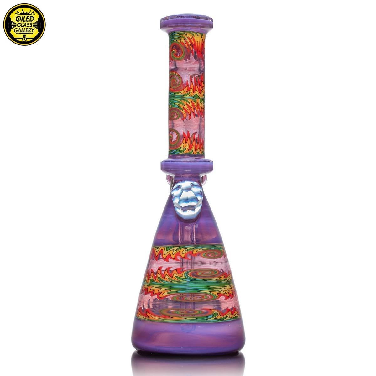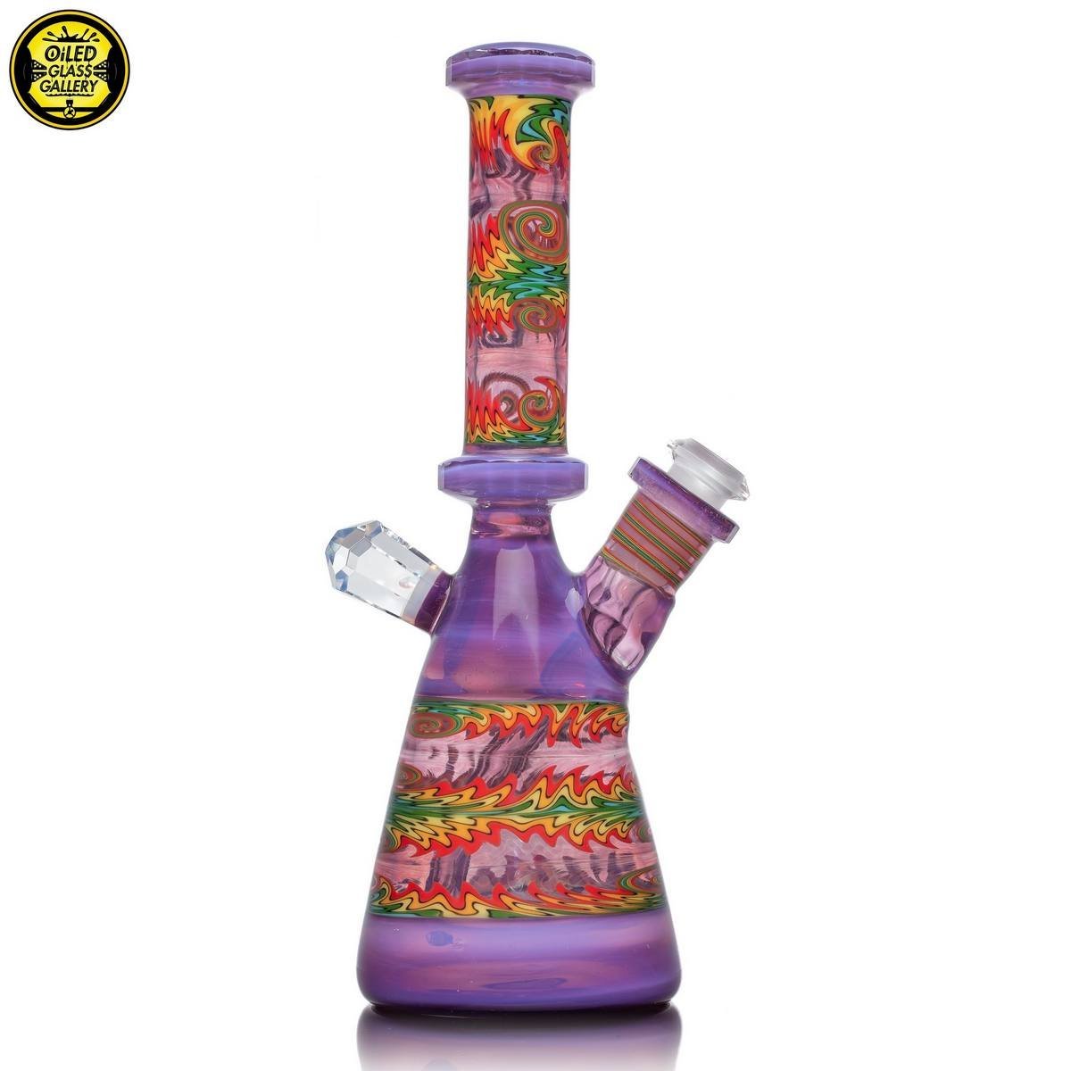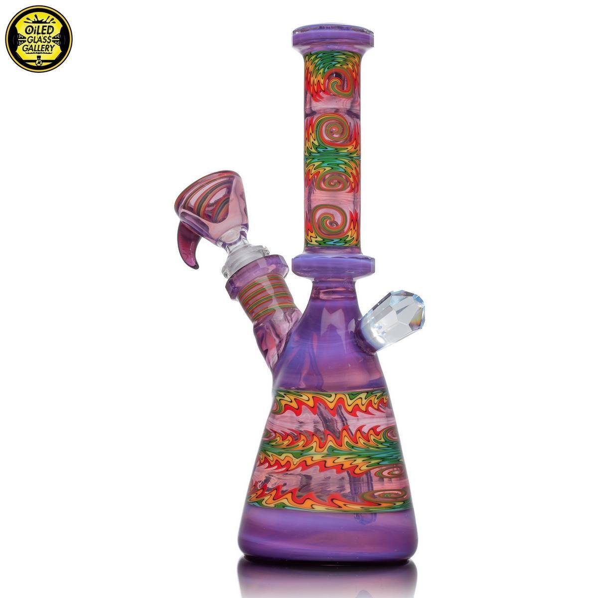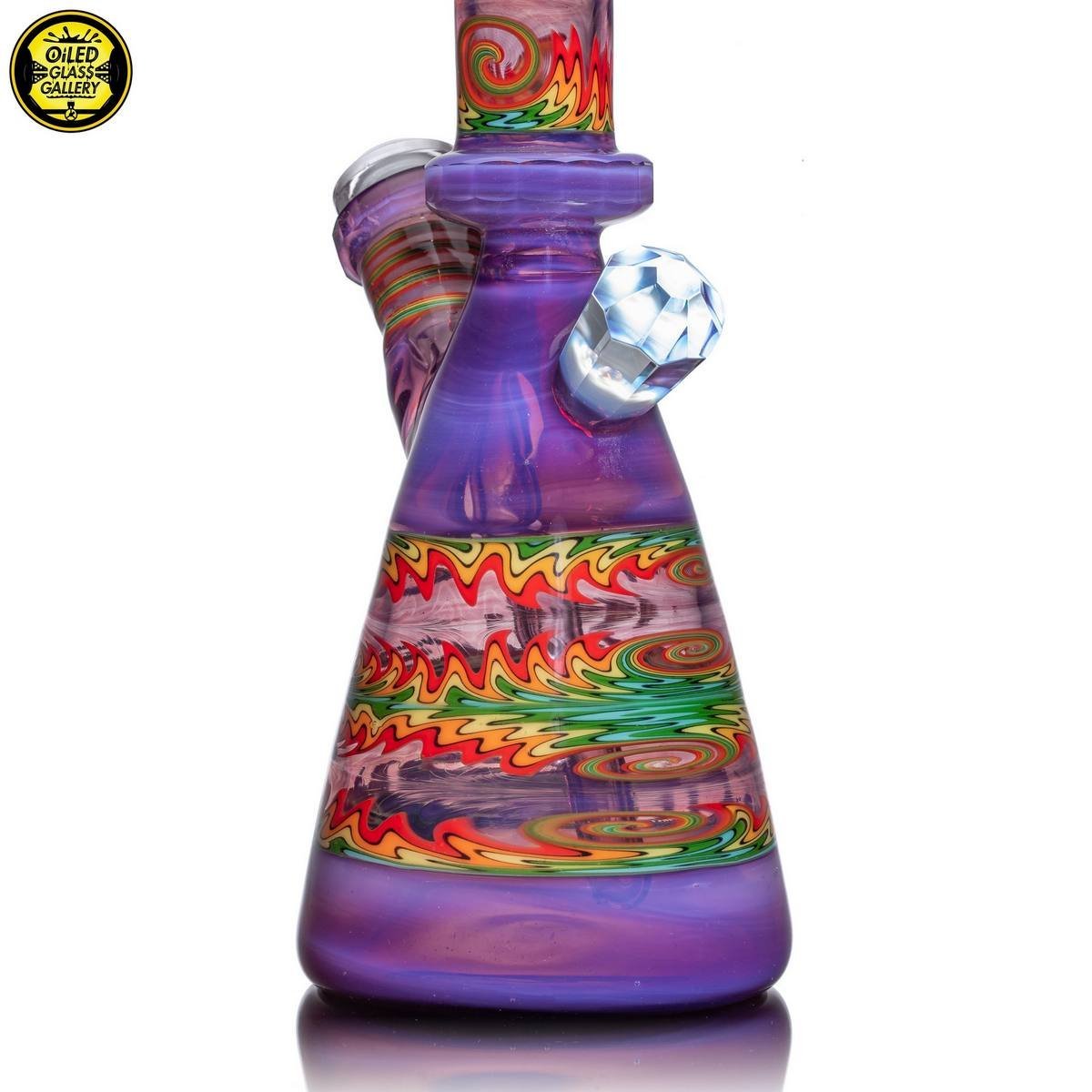 2021 14mm 10.25in UV Rainbow Wig Wag Beaker Tube Set made of Northstar Glass Star Gazer & Molten Aura Royal Jelly with Rainbow and UV wig wags. Features a faceted mouthpiece, neck, joint, and an opal encased faceted mib on the back. Comes with a matching slide, a removable 2-hole downstem, a bubble cap, a pendant, and shipped in a Dark Green Pelican iM2100 case.