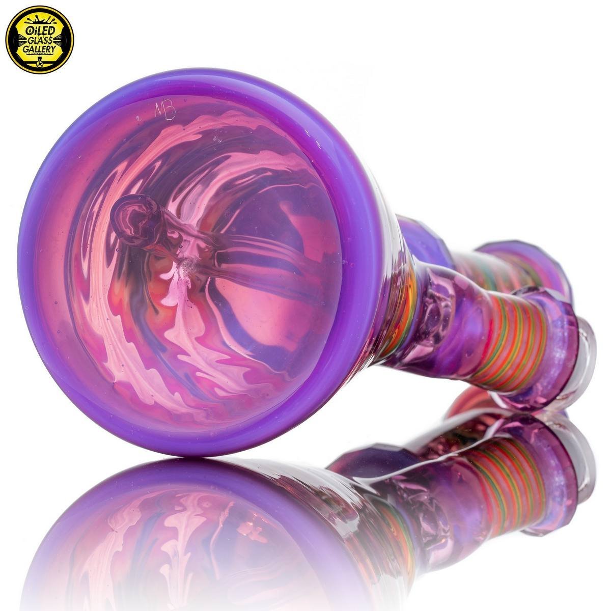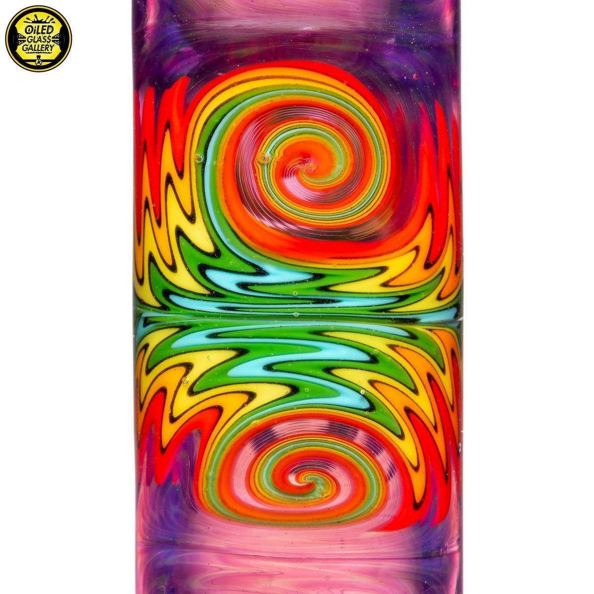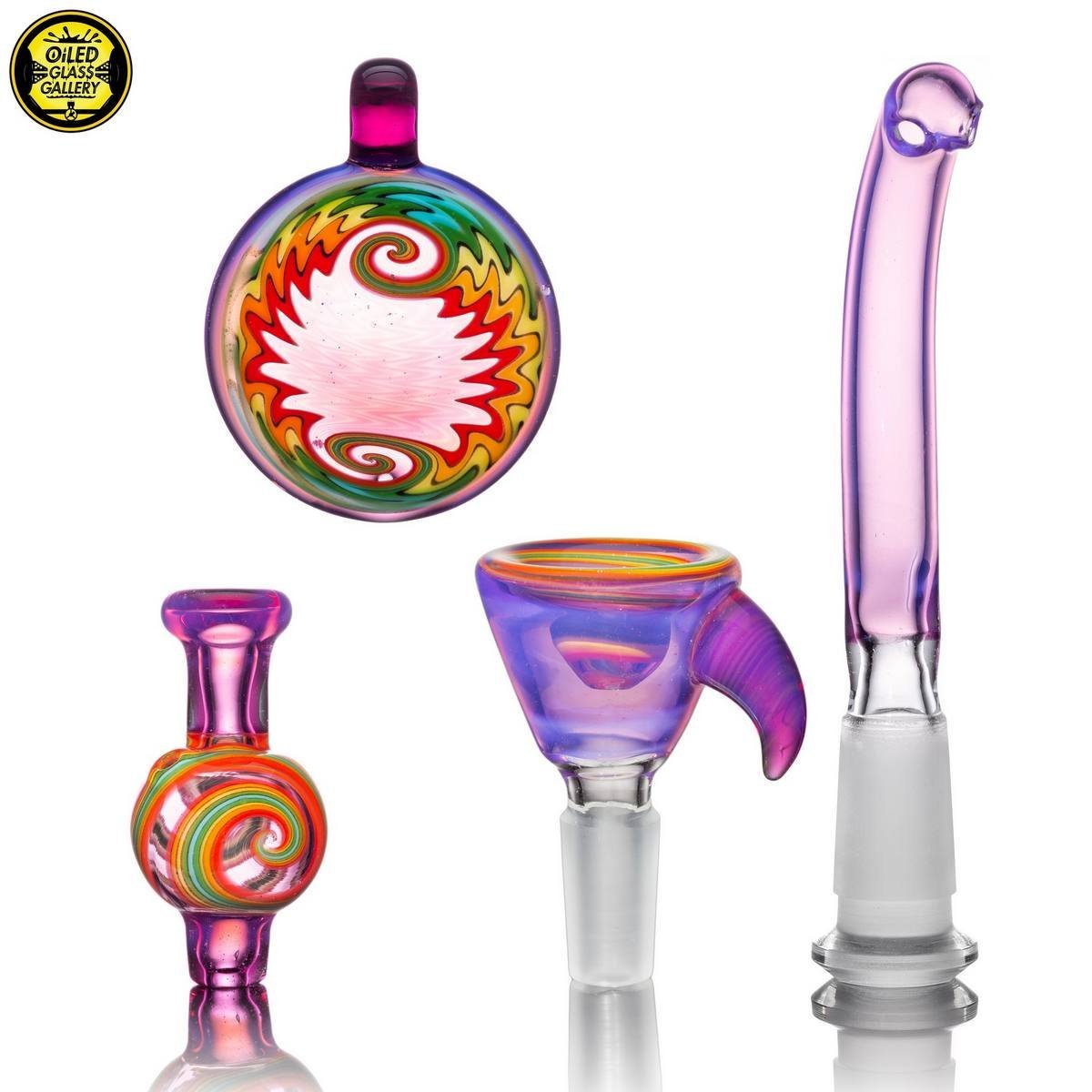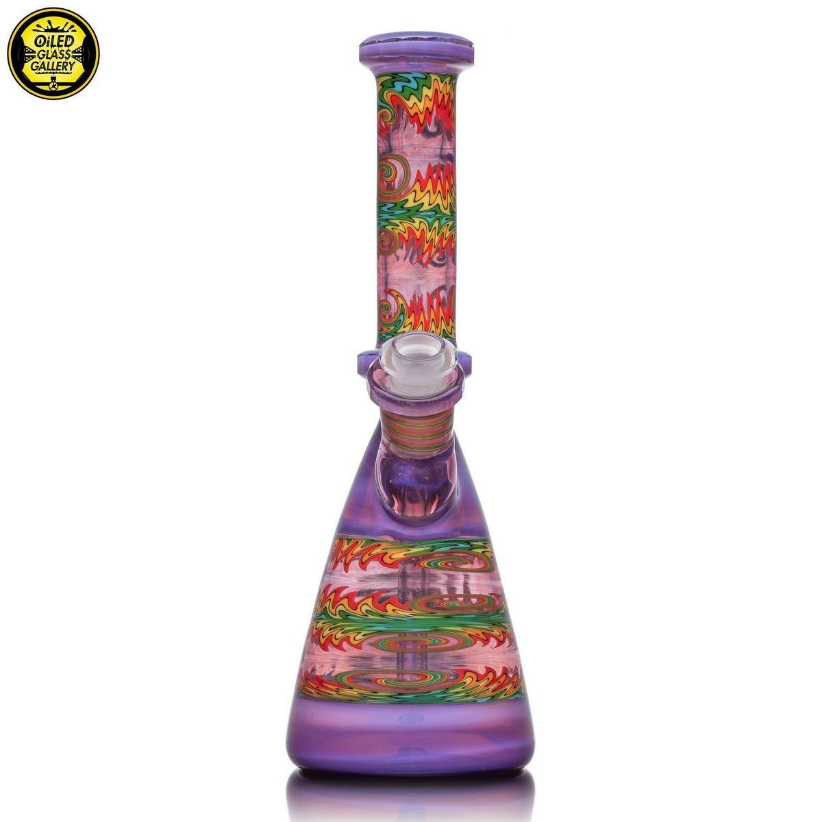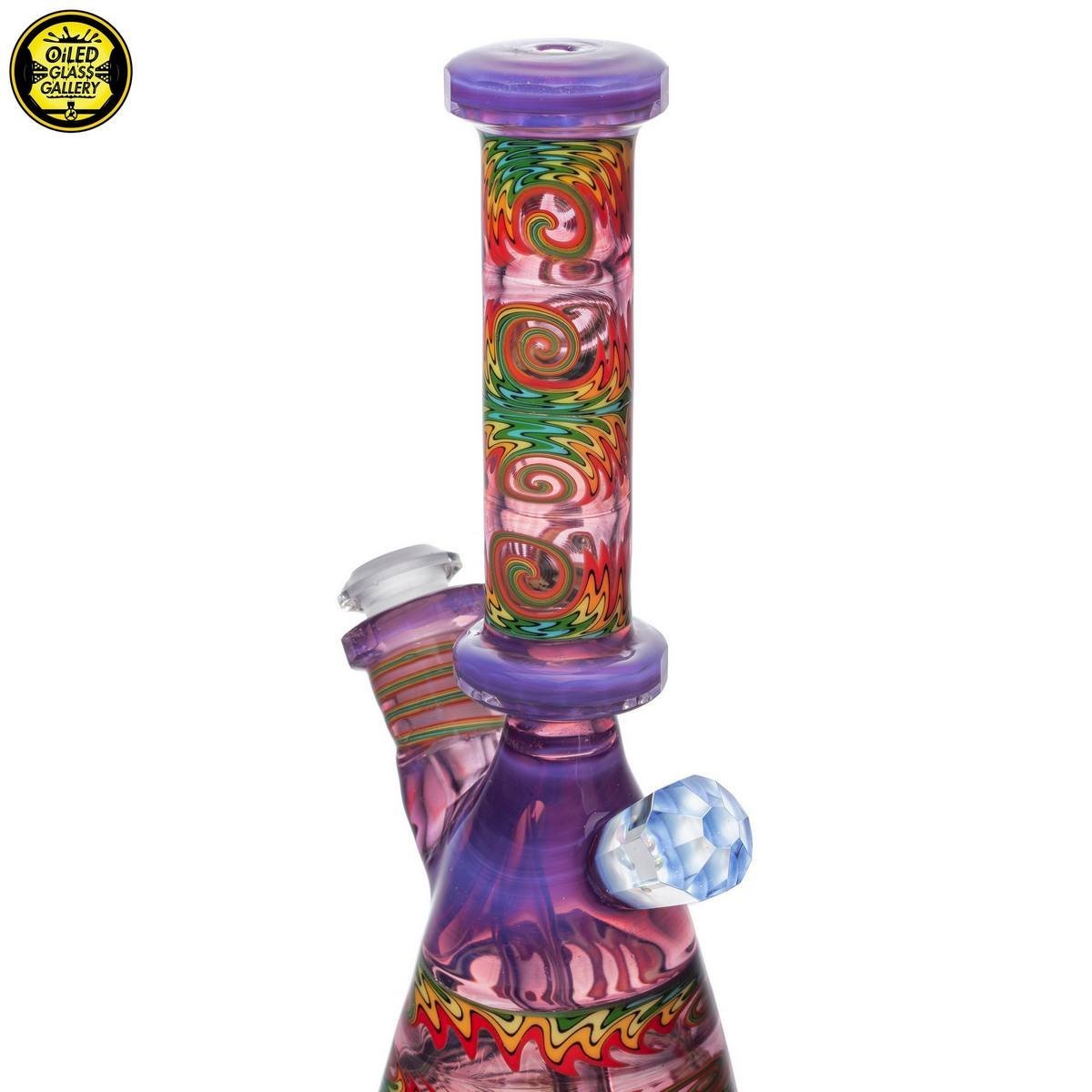 2021 14mm 10.25in UV Rainbow Wig Wag Beaker Tube Set made of Northstar Glass Star Gazer & Molten Aura Royal Jelly with Rainbow and UV wig wags. Features a faceted mouthpiece, neck, joint, and an opal encased faceted mib on the back. Comes with a matching slide, a removable 2-hole downstem, a bubble cap, a pendant, and shipped in a Dark Green Pelican iM2100 case.