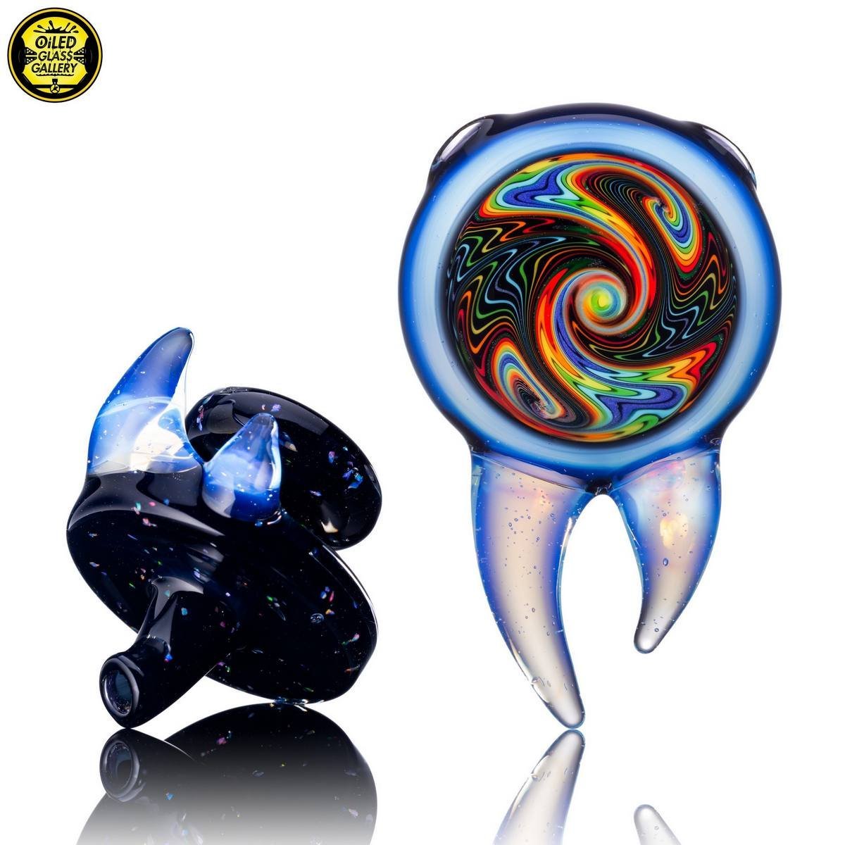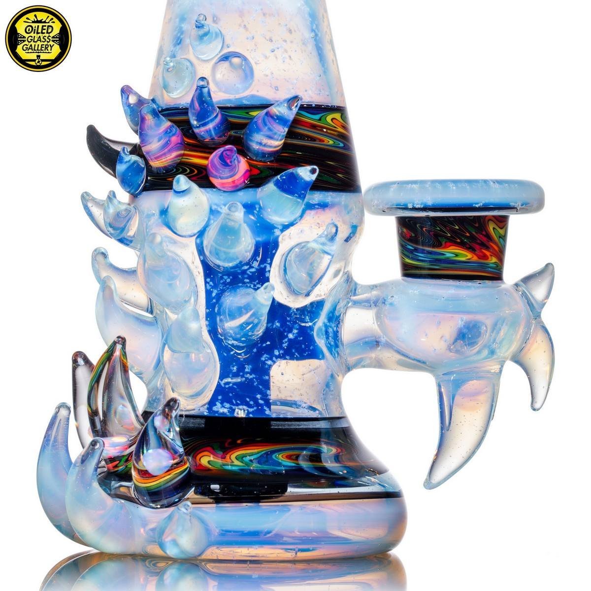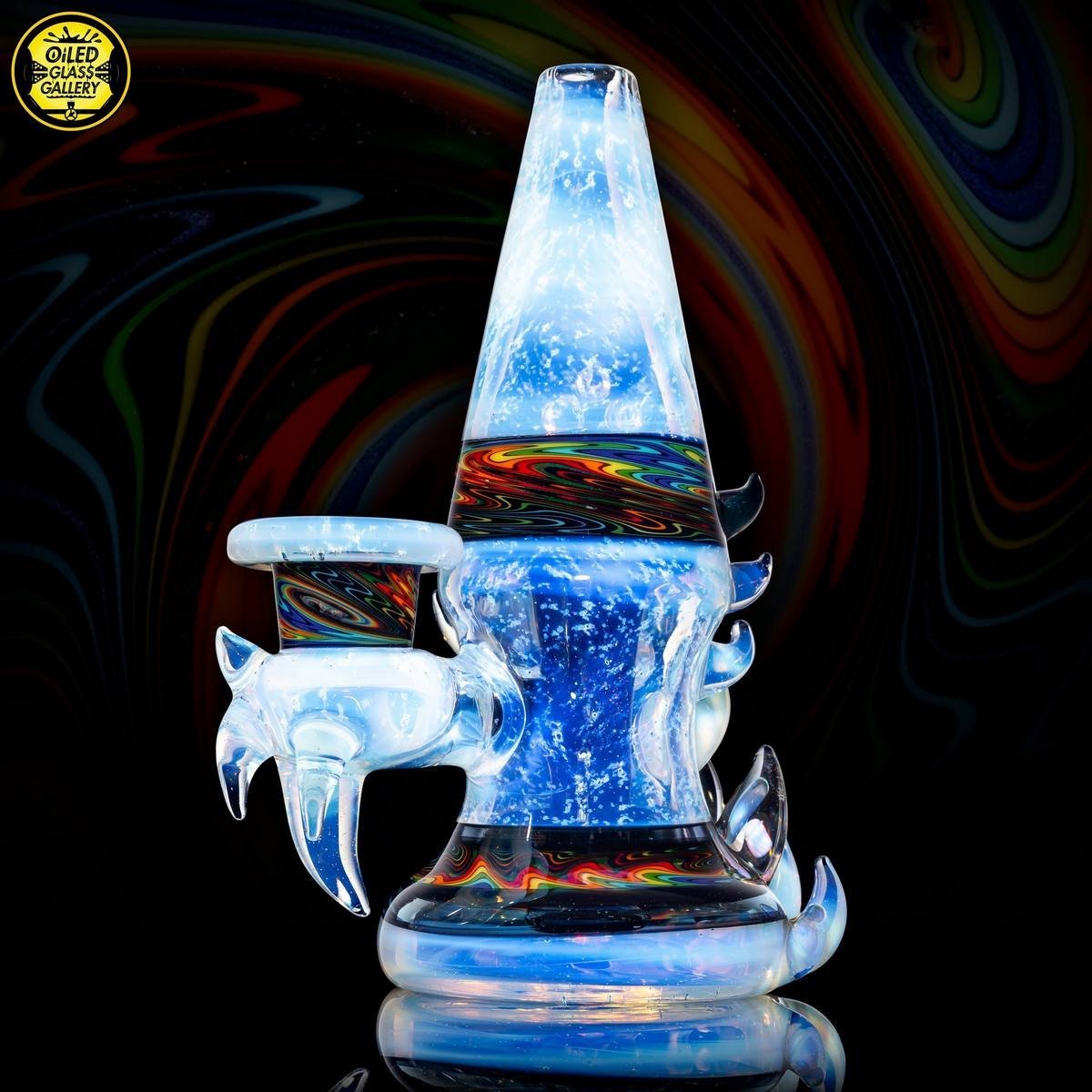 2021 14mm 6.25in UV Wig Wag Crushed Opal Cone Lamp Tube set made of Crushed opal over Northstar Glass Ghost, Crushed opal over Northstar Glass Jet Black and Rainbow Wigwag sections with UV stringers. This set features 33 mounted horns, including 3 with encased opals, a 3-hole perc with encased opal underneath and comes with a matching horned spinner cap and pendant, all shipped in a Black Apache 1800 case.