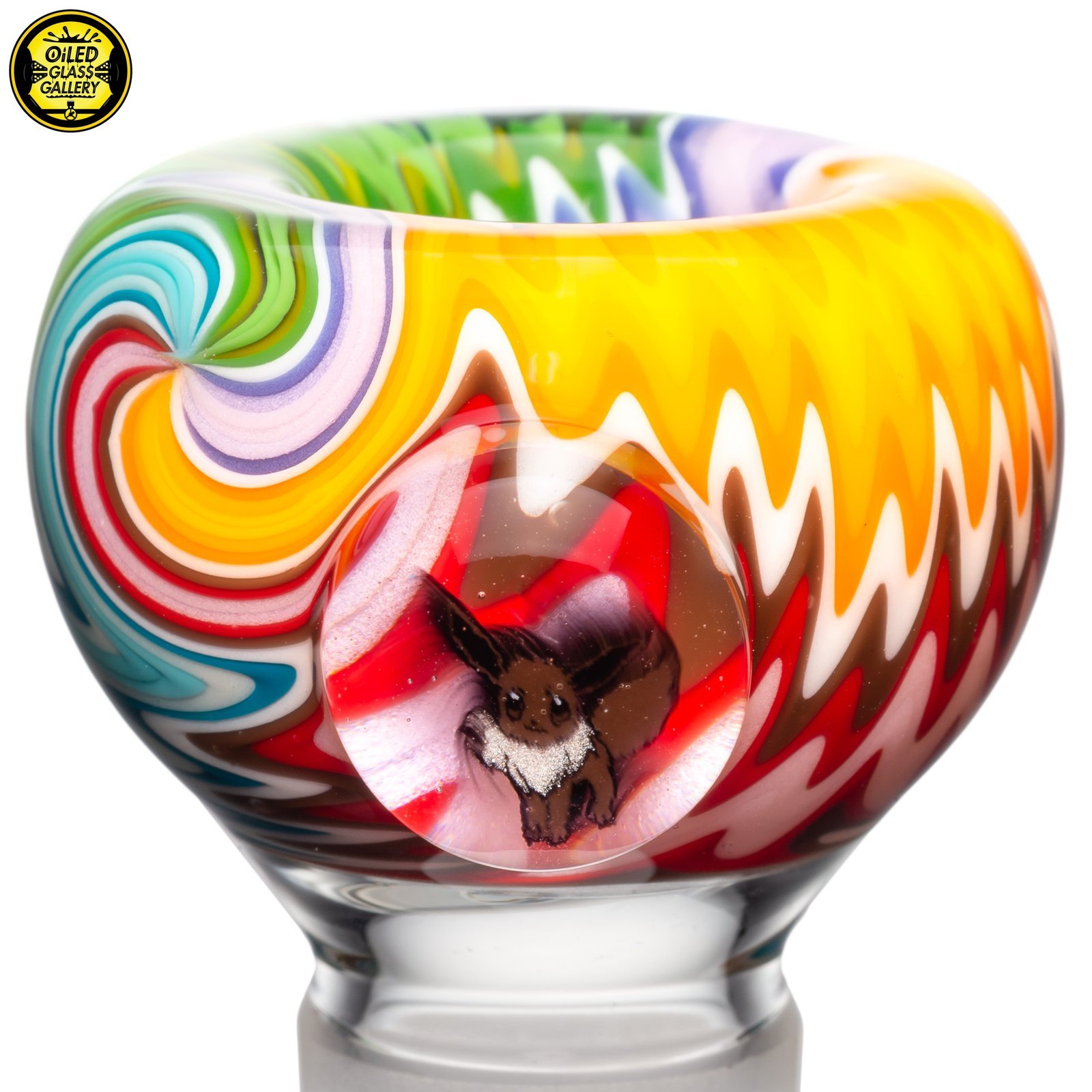 2020 18mm Rainbow ReWig Millefiori 1-hole Slide featuring a beautiful encased Eevee Pokemon millefiori mib.