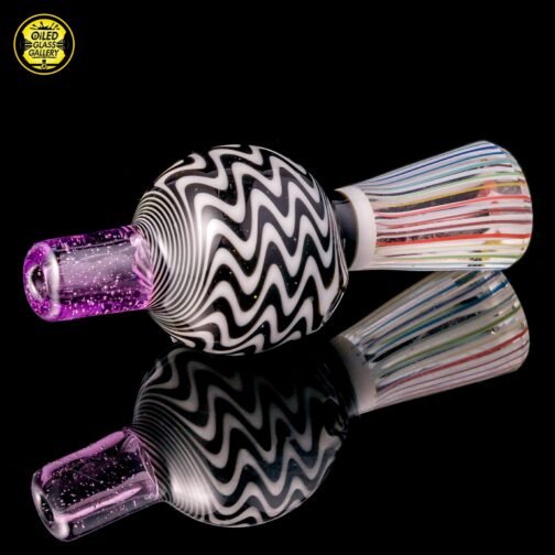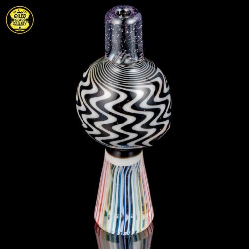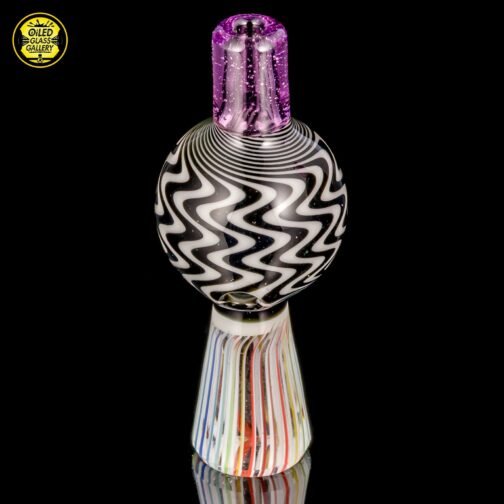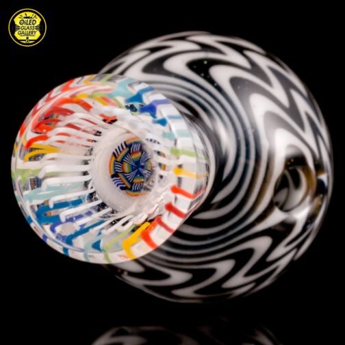 2020 21.5mm CFL Bubble Cap made of Black & White Wig Wag linework, a spiral rainbow stringer handle with an encased millefiori and a CFL spout that fits most bangers up to 26mm.