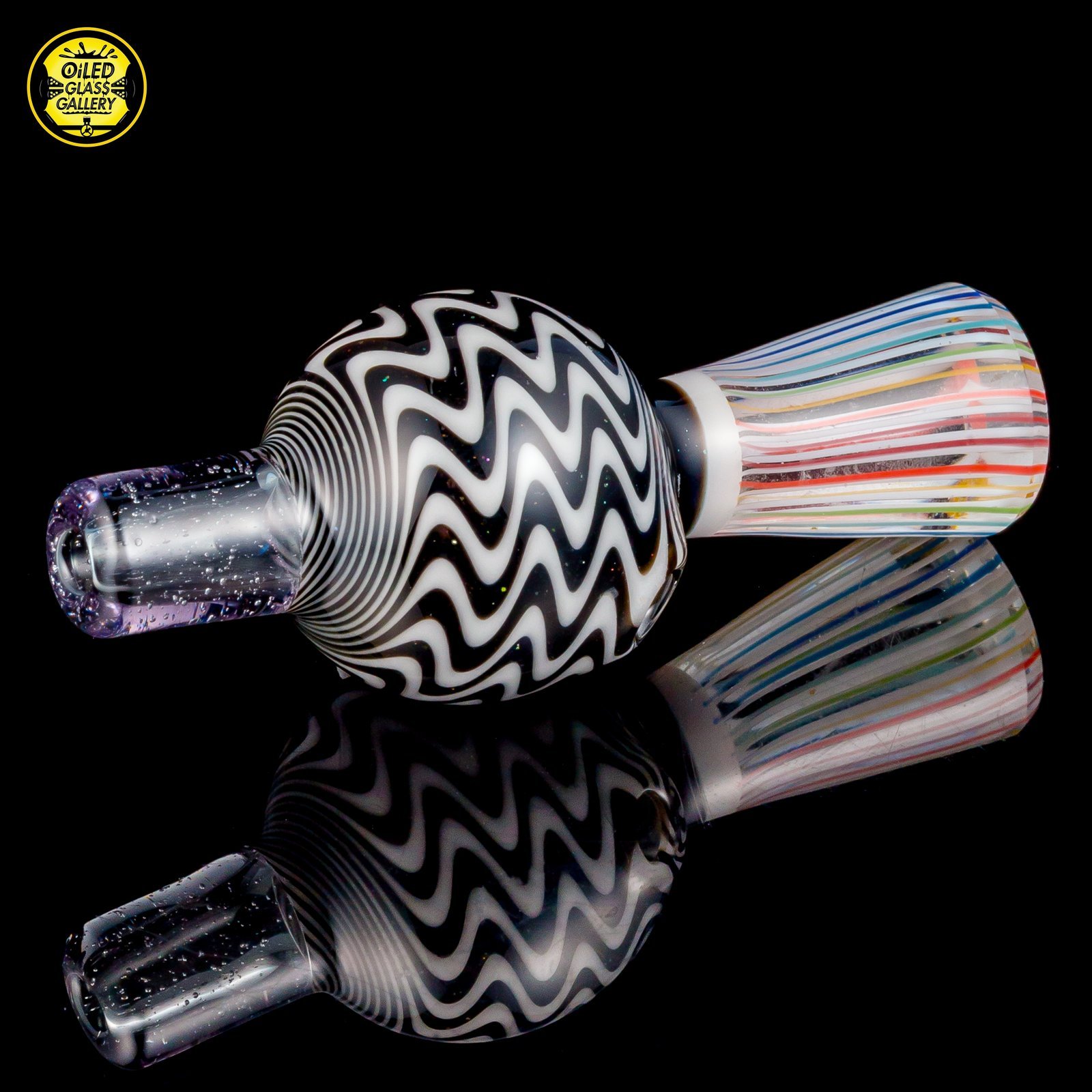 2020 21.5mm CFL Bubble Cap made of Black & White Wig Wag linework, a spiral rainbow stringer handle with an encased millefiori and a CFL spout that fits most bangers up to 26mm.