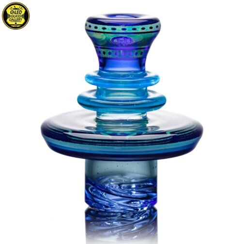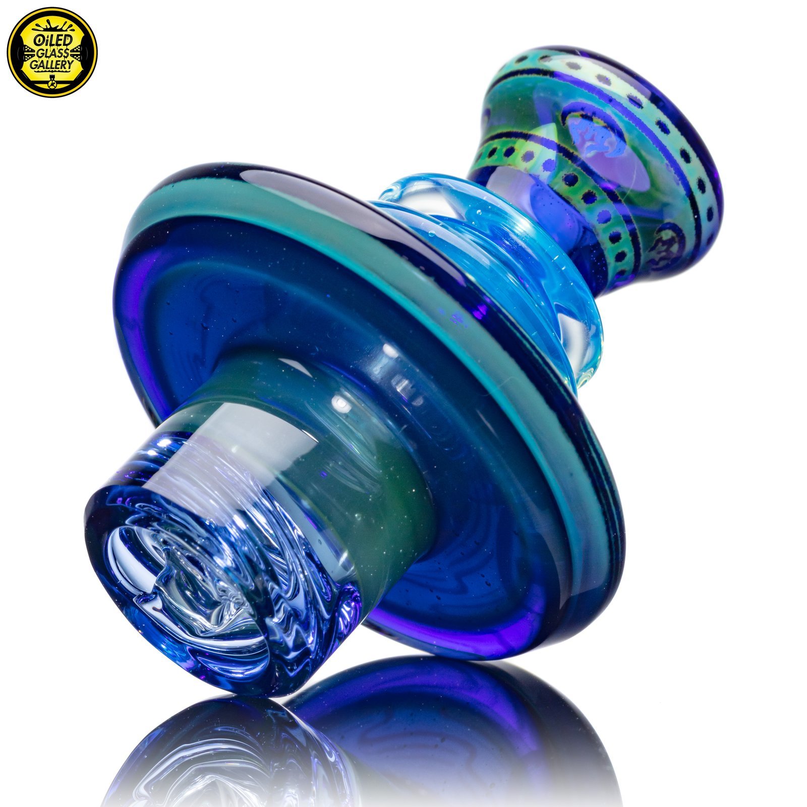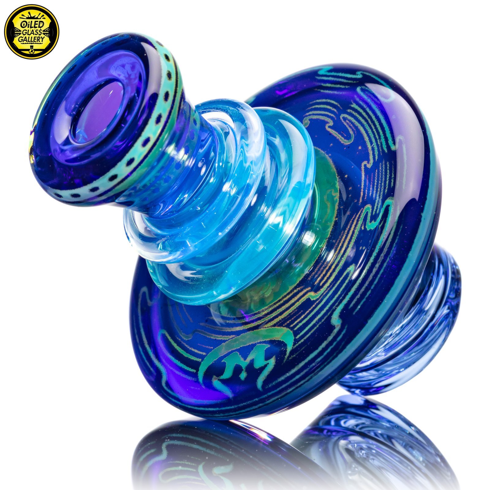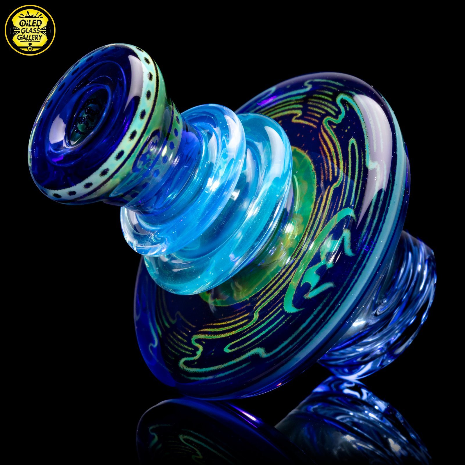 2021 35mm Hologram Fumed Maria spinner cap. Released during the “Pod” Hologram series with a 2-hole spiral stem with Blue tint made of highlight colors Northstar Glass Dark Blue over Northstar Glass Millennium Moss and Northstar Glass Ghost over Northstar Glass Berry Gumbolt.