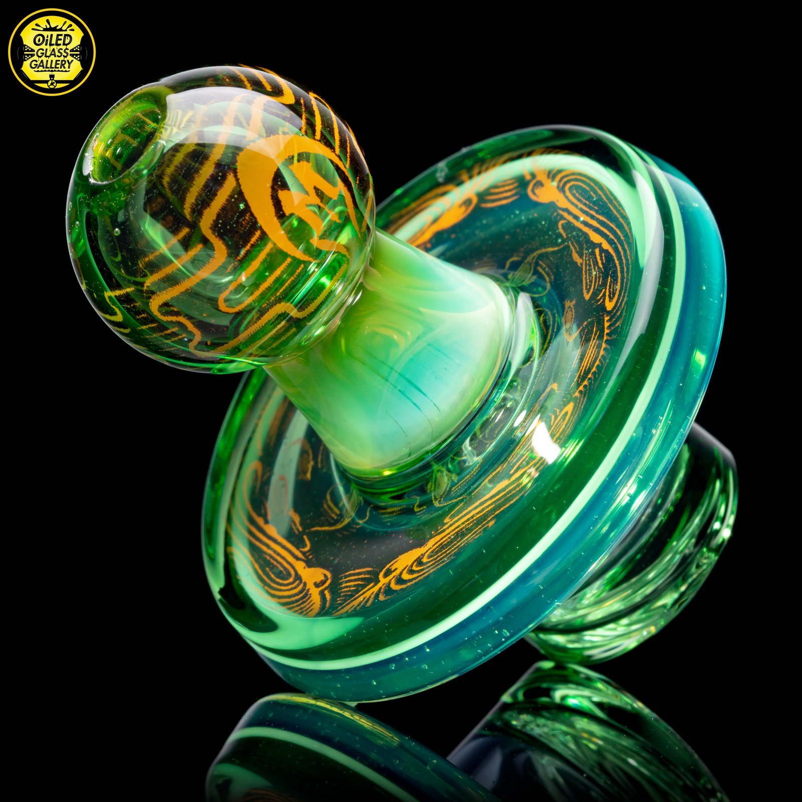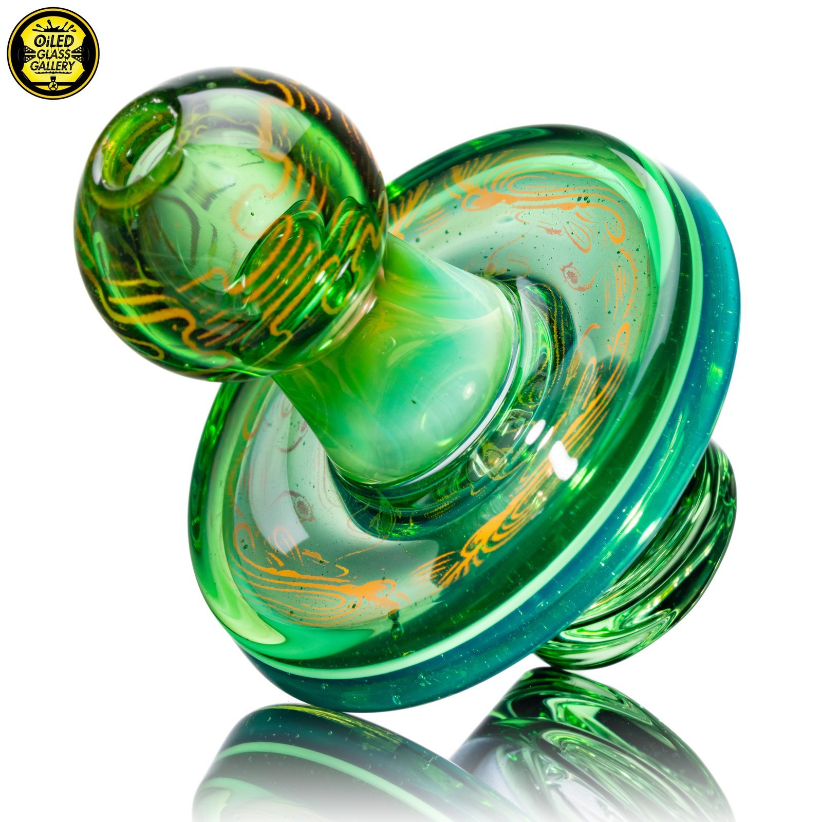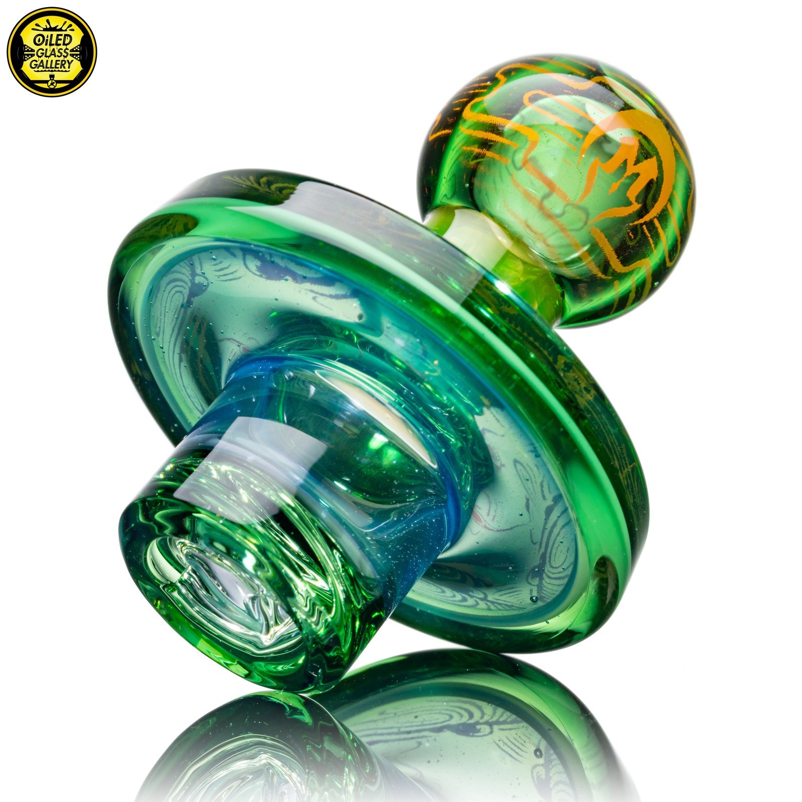 2021 36mm Hologram Fumed Maria spinner cap. Released during the “Pod” Hologram series with a 2-hole spiral stem with Green tint made of highlight colors Northstar Glass Dark Blue over Northstar Glass Millennium Moss and Northstar Glass Ghost over Northstar Glass Berry Gumbolt.