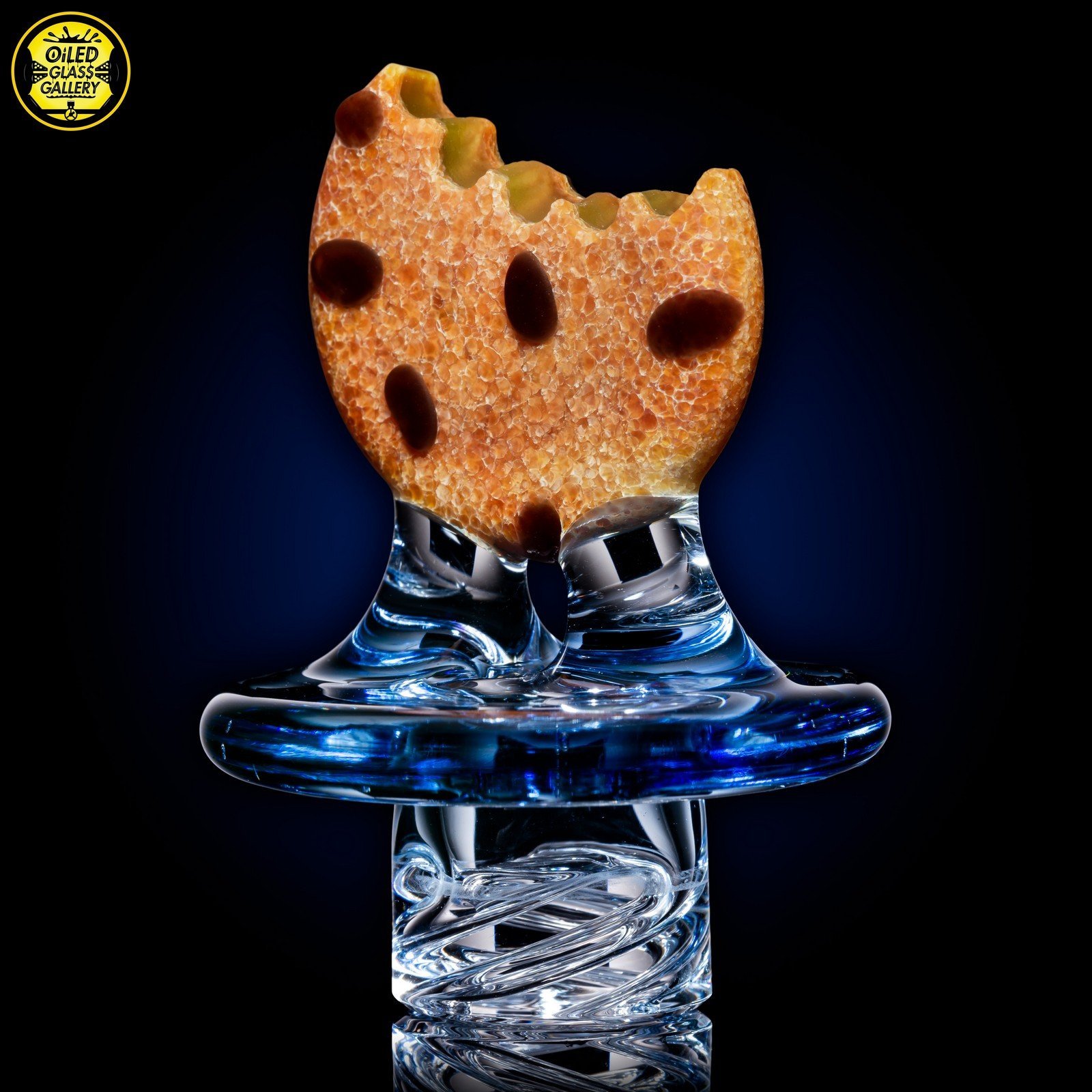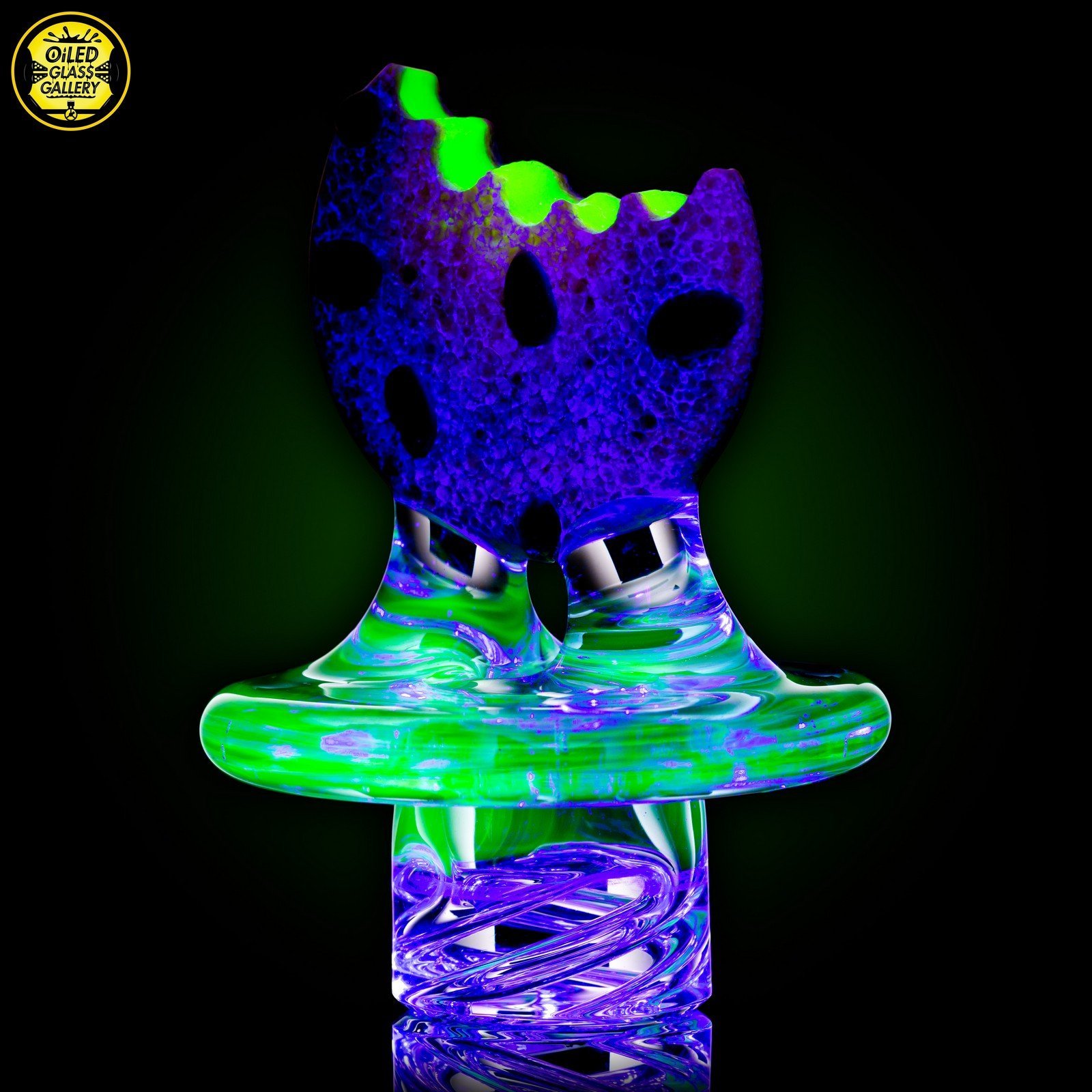 2021 38mm UV Spinner Cookie Cap with a sandblasted Glass Alchemy Silver Strike 5 frit cookie with Glass Alchemy Walnut chips, Northstarglass UV Illuminati center, and a UV Bluminati base with spiral tip. It comes with a Quartz pearl and fits most bangers up to 36mm.